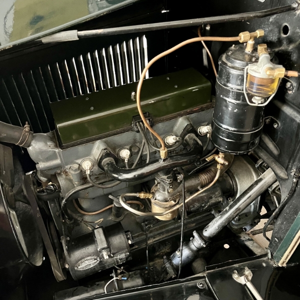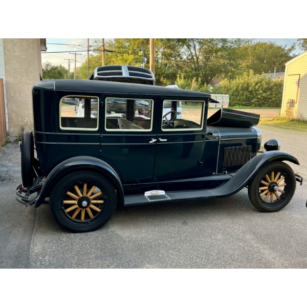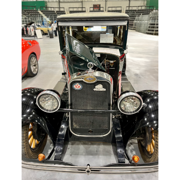 Features include four-wheel brakes, locking steering column, preheated carburetor air, and a dome interior light (introduced for the 1928 model year). Equipped with optional front and rear bumpers and a spare tire with rim.