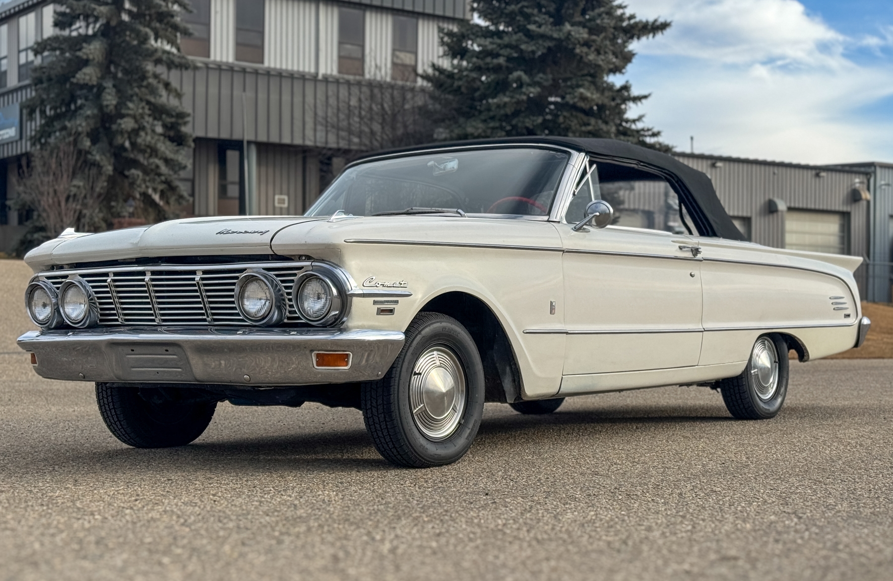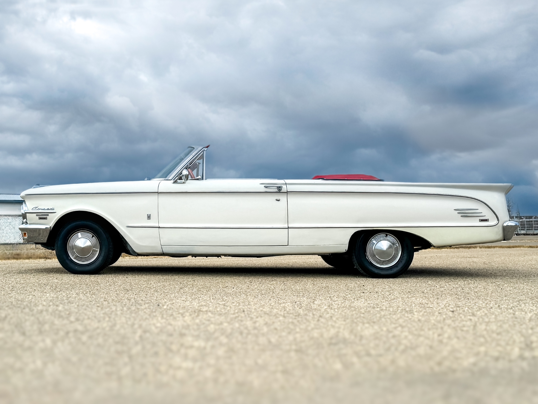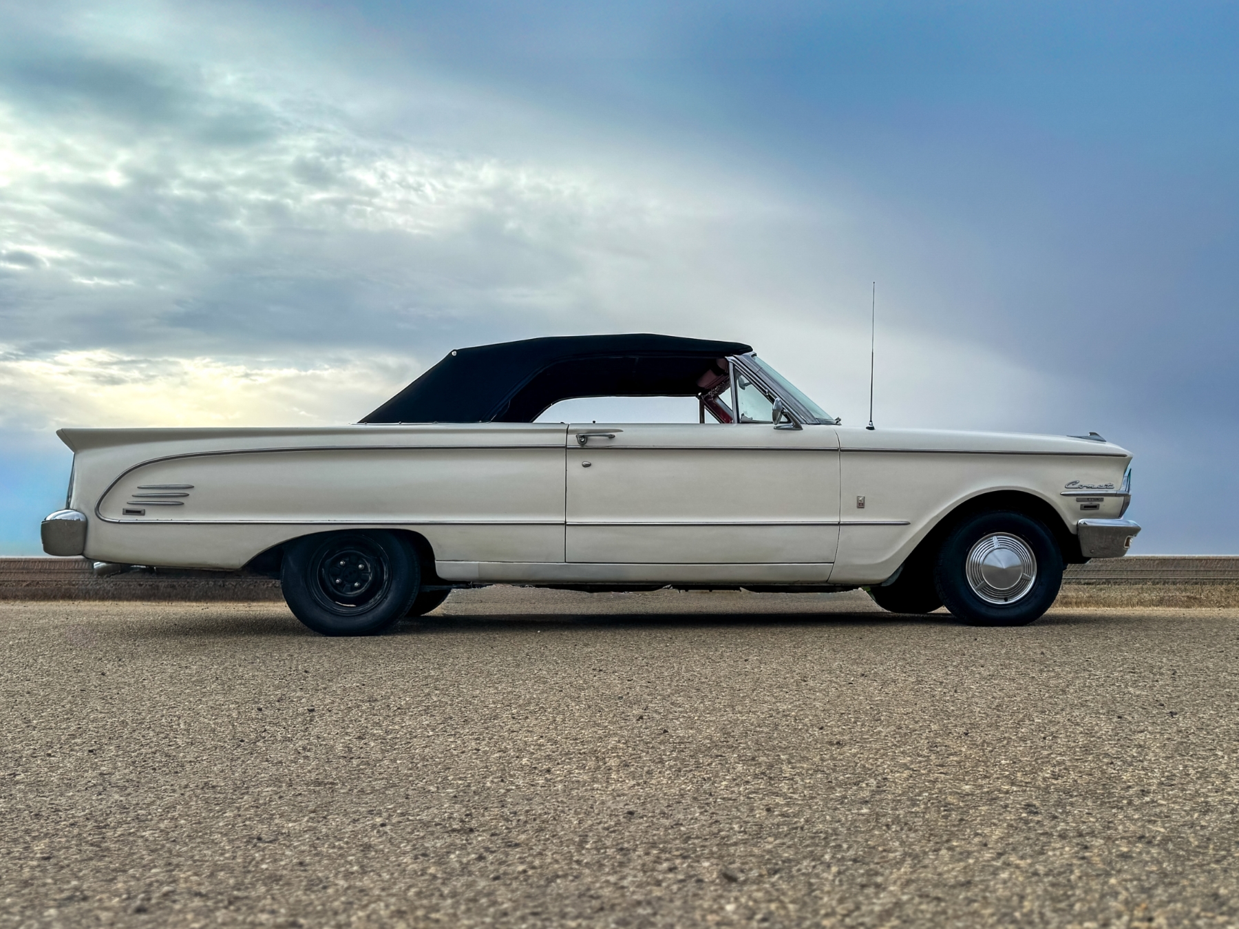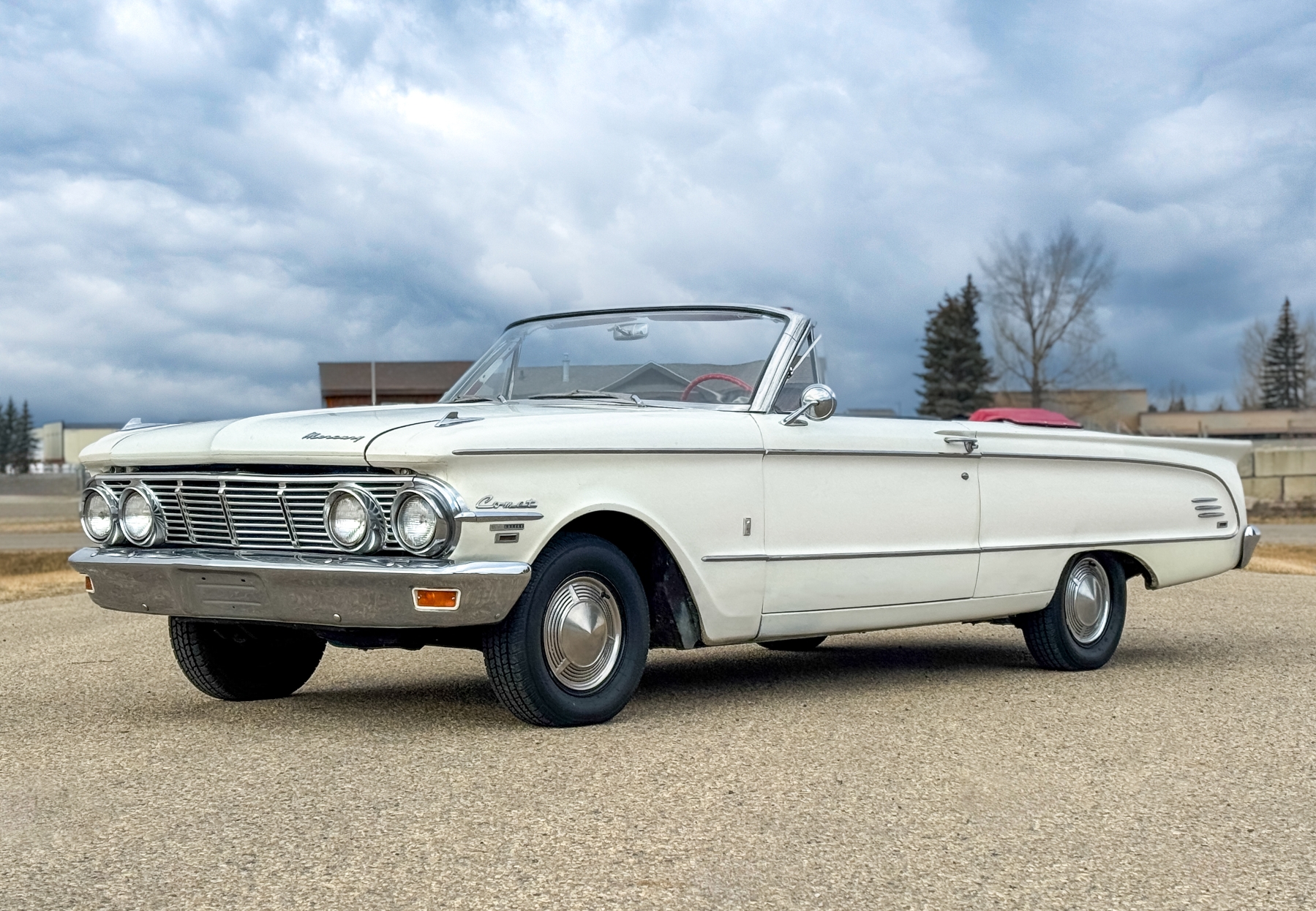 1963 Mercury Comet Convertible factory 170 cu in inline-six paired with the rare factory 4-speed manual transmission. Canadian-built in Wimbledon White over red and white interior, featuring a brand-new black convertible top. A clean early-’60s convertible with a rare manual setup that stands out from the typical automatic examples.
