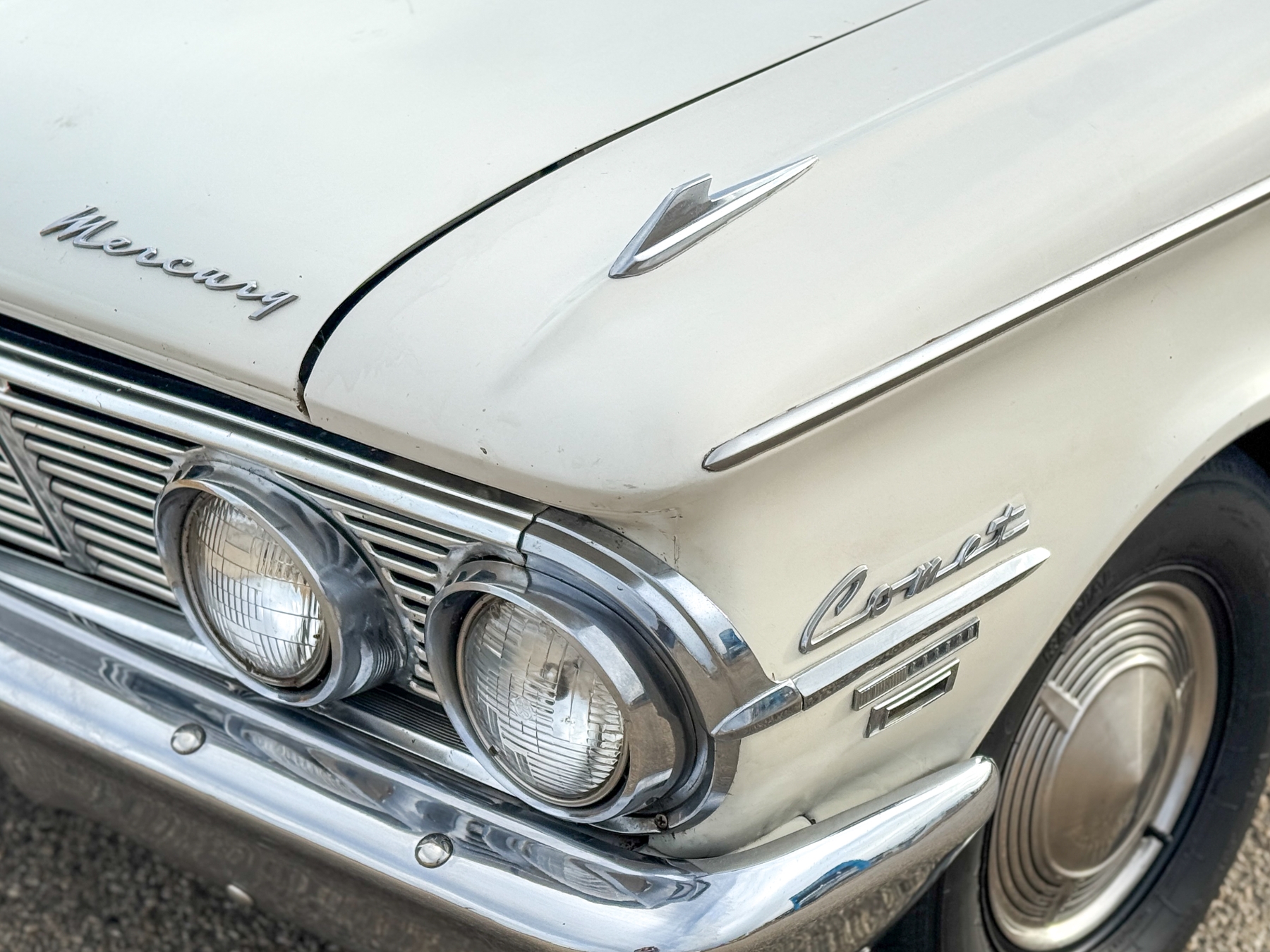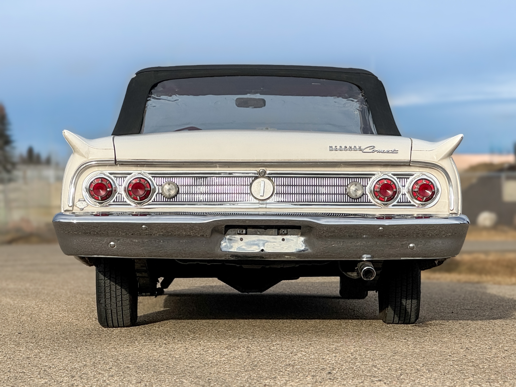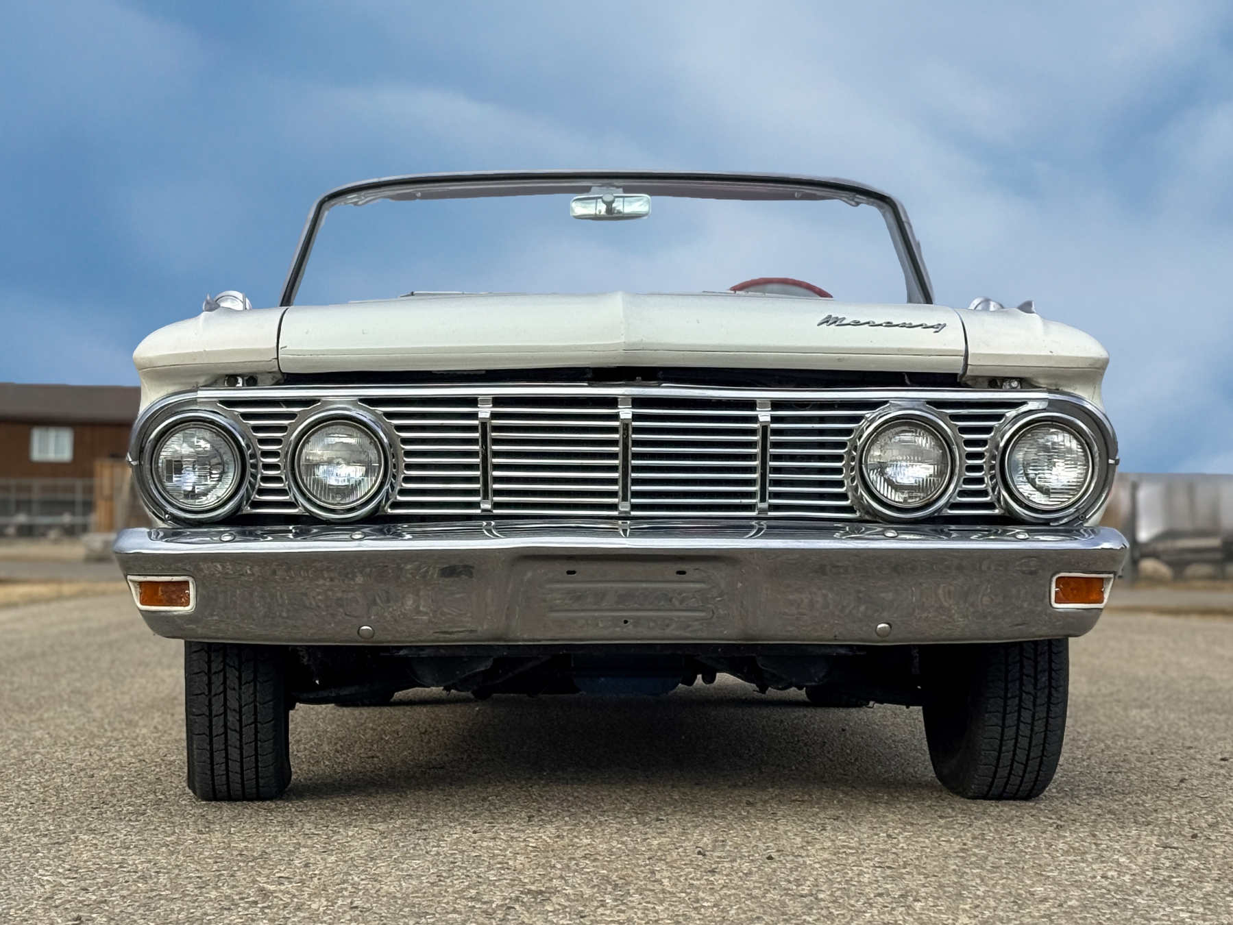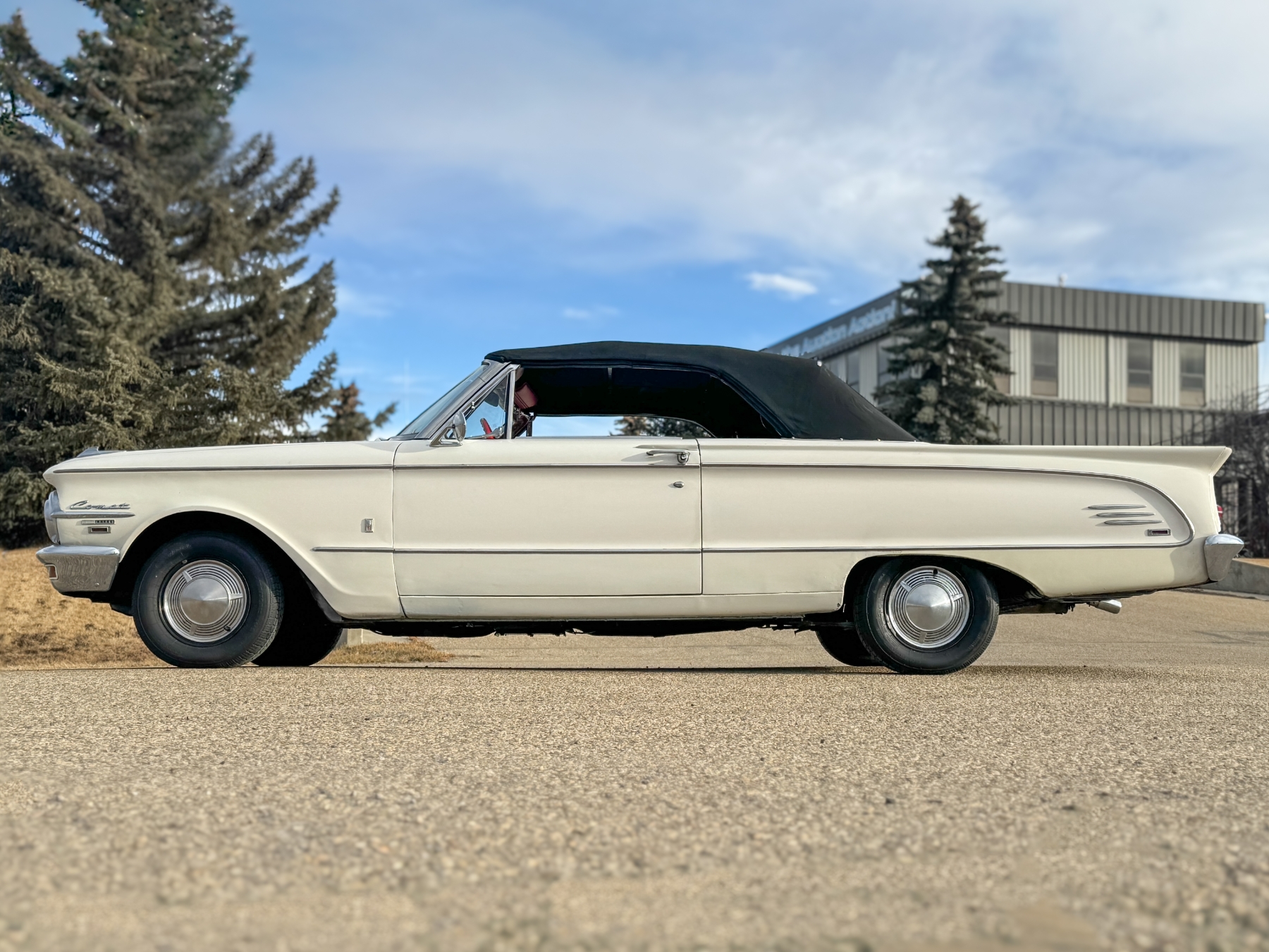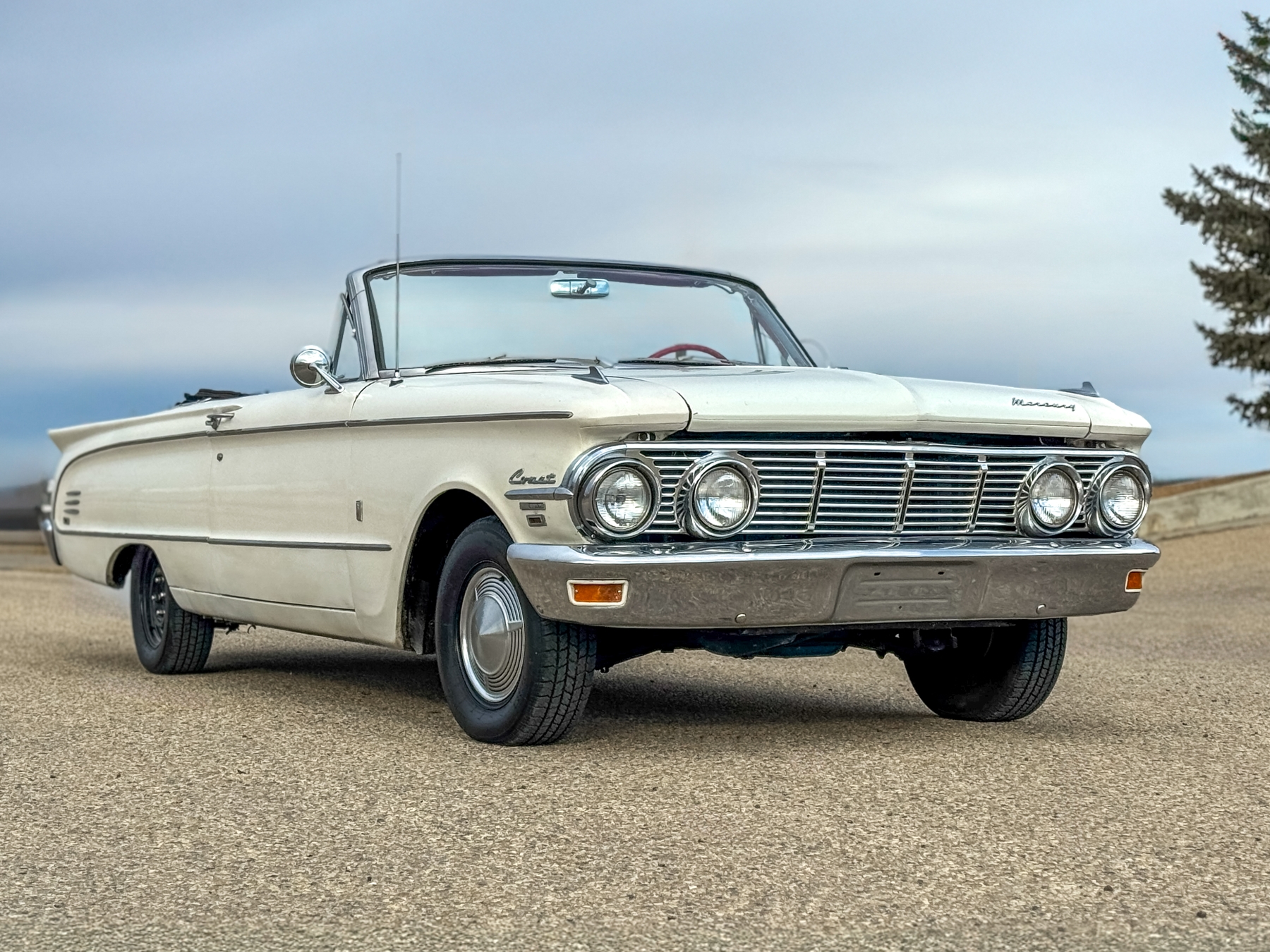 1963 Mercury Comet Convertible factory 170 cu in inline-six paired with the rare factory 4-speed manual transmission. Canadian-built in Wimbledon White over red and white interior, featuring a brand-new black convertible top. A clean early-’60s convertible with a rare manual setup that stands out from the typical automatic examples.