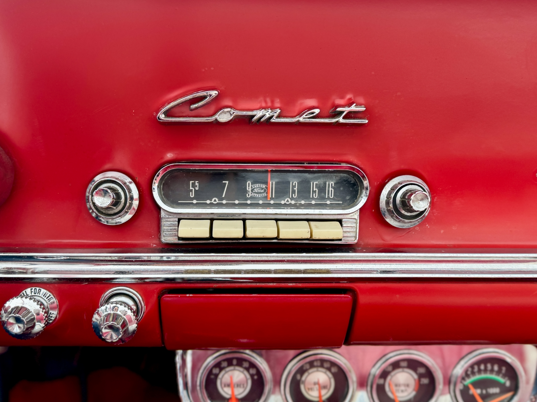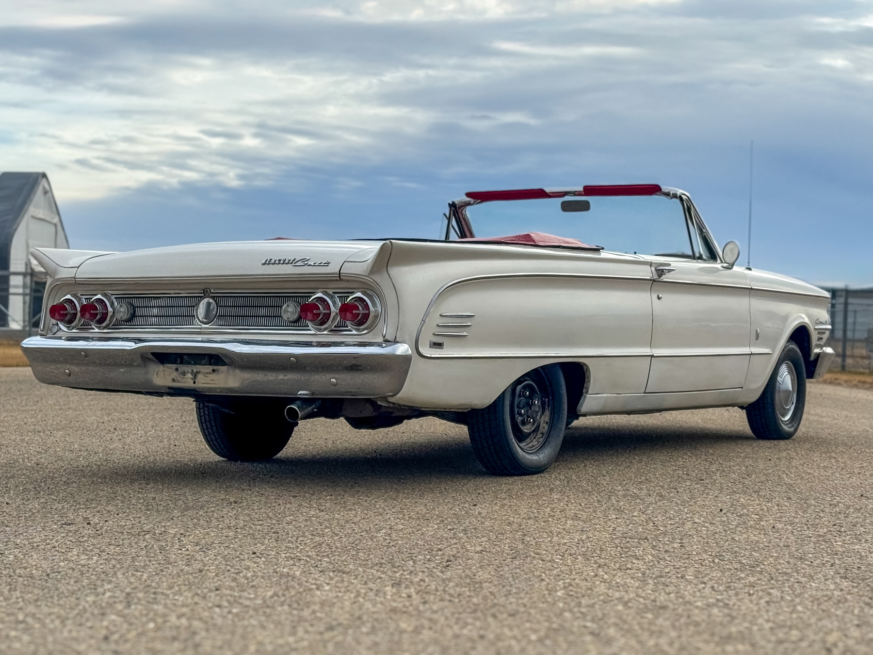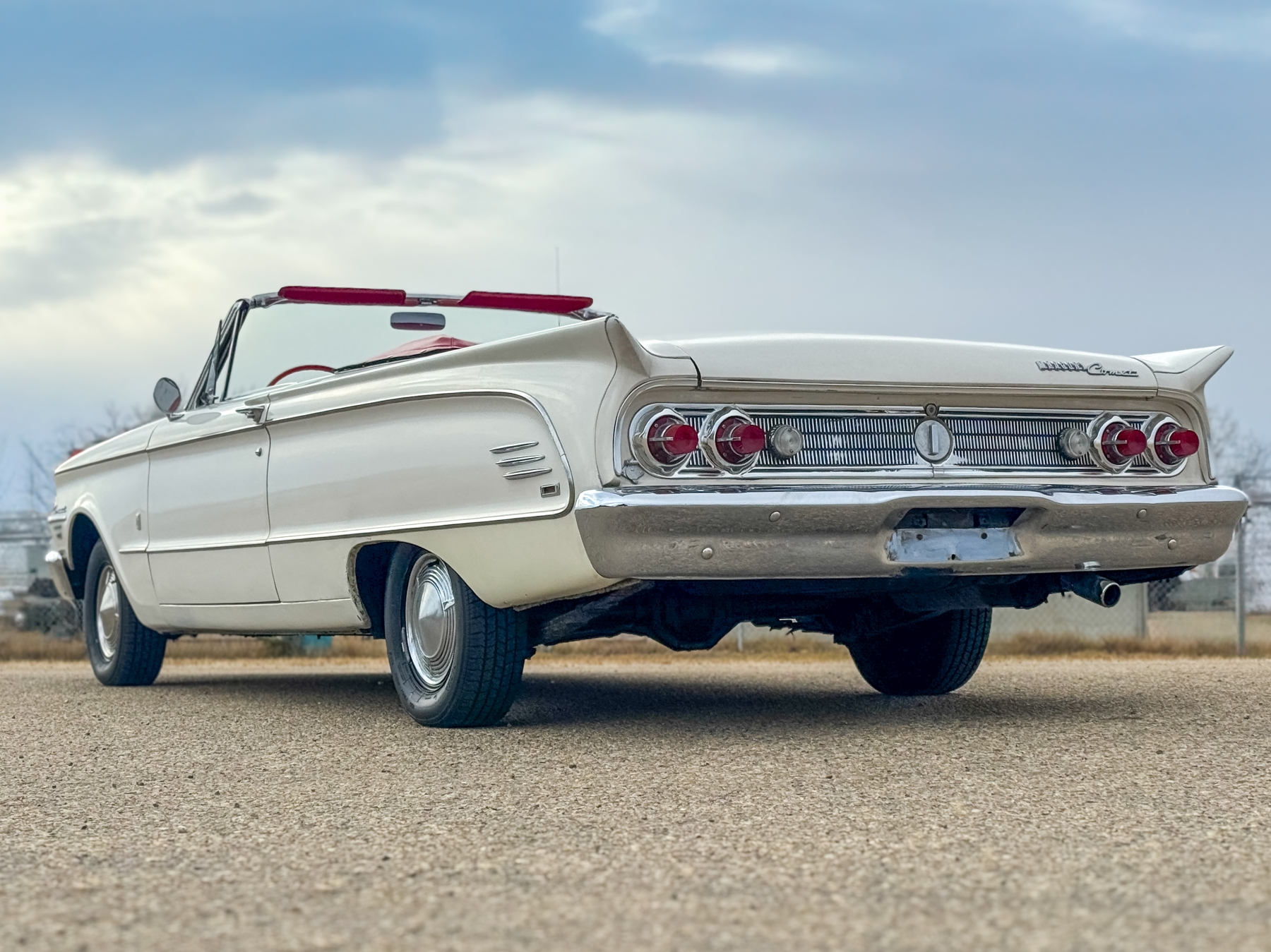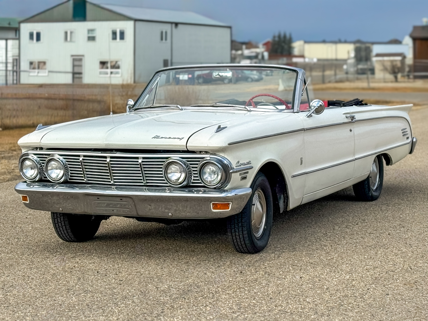 1963 Mercury Comet Convertible factory 170 cu in inline-six paired with the rare factory 4-speed manual transmission. Canadian-built in Wimbledon White over red and white interior, featuring a brand-new black convertible top. A clean early-’60s convertible with a rare manual setup that stands out from the typical automatic examples.