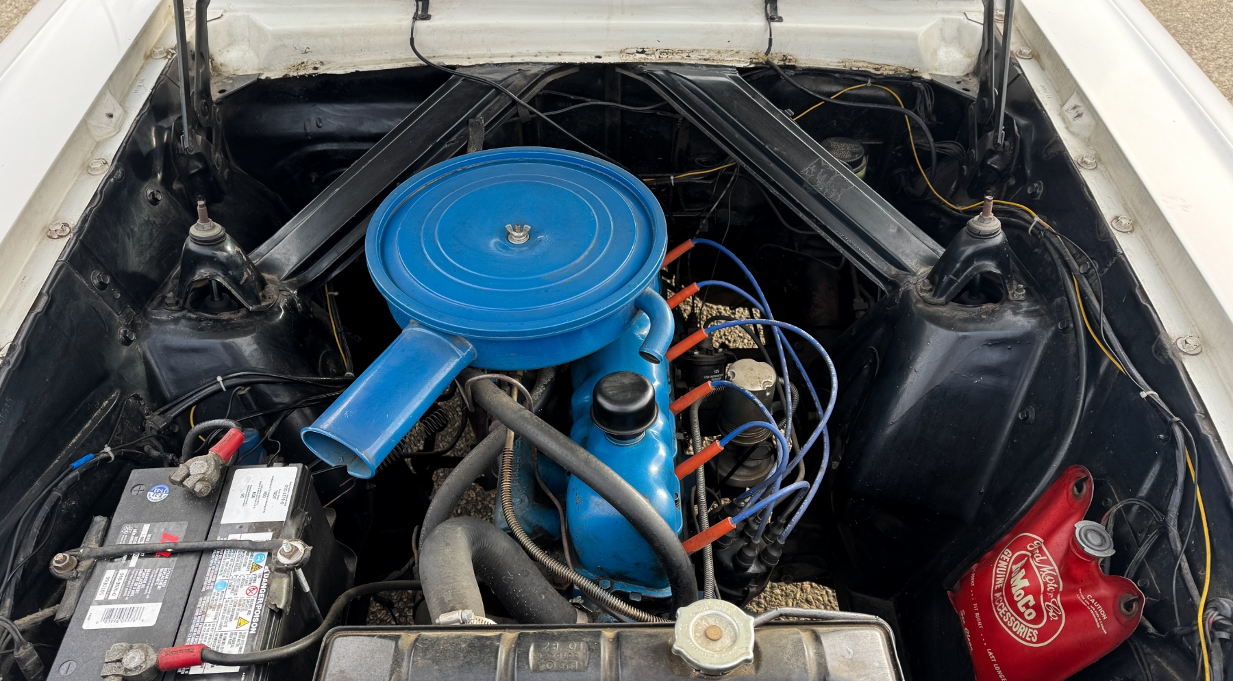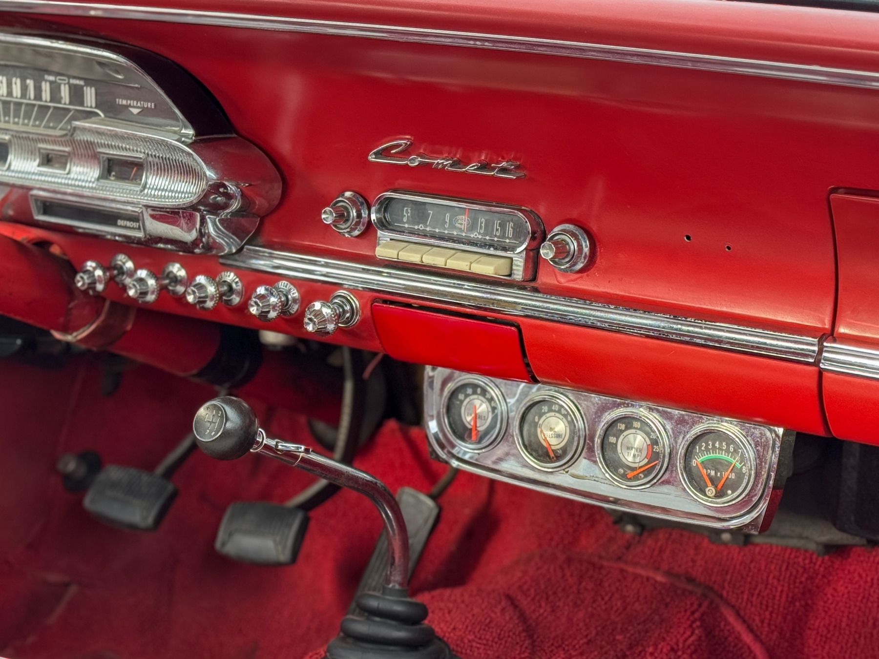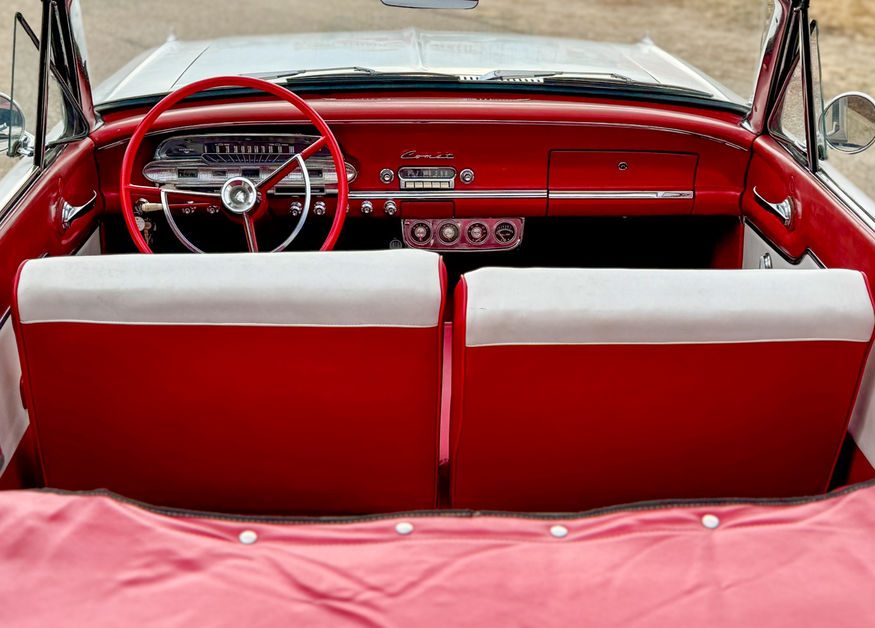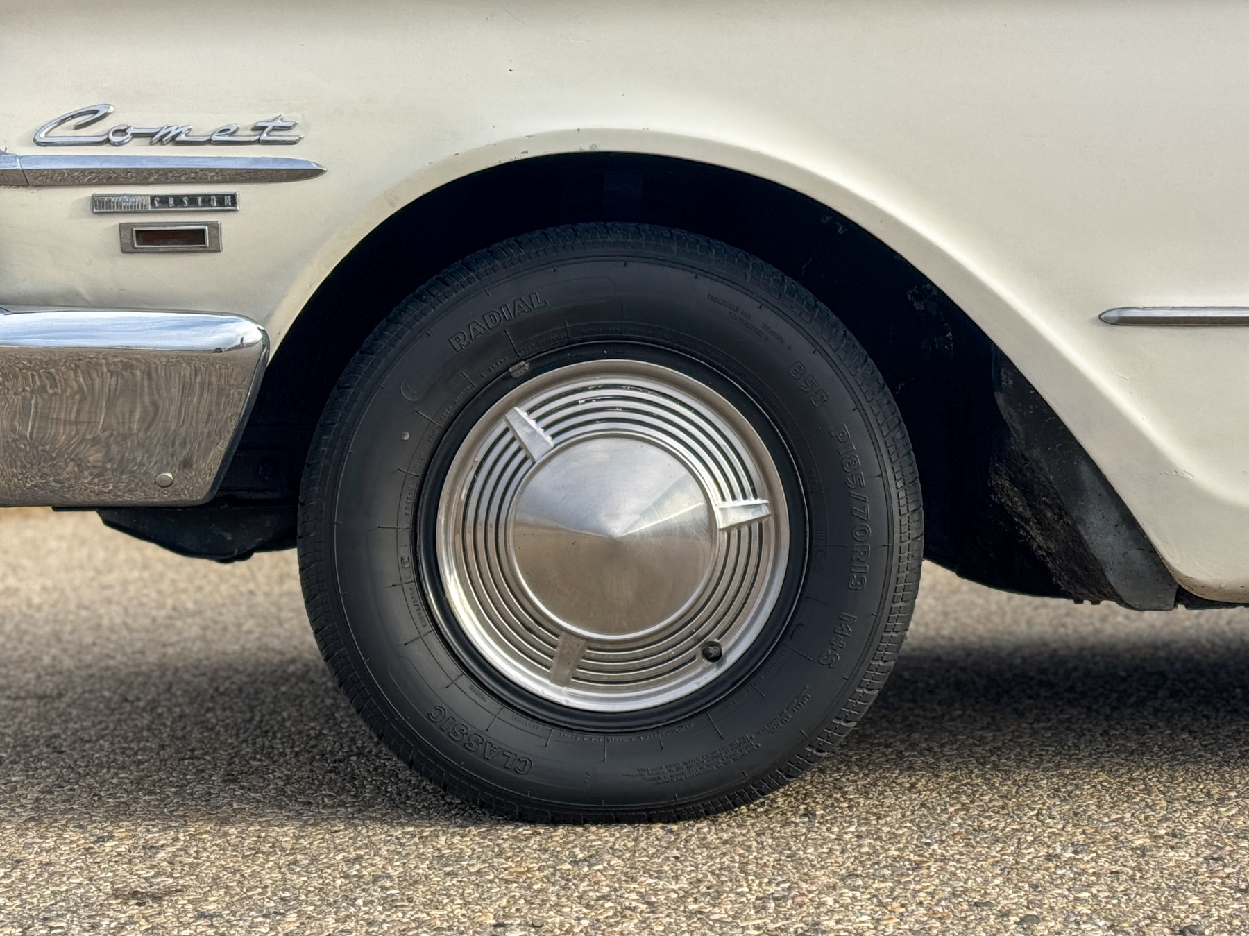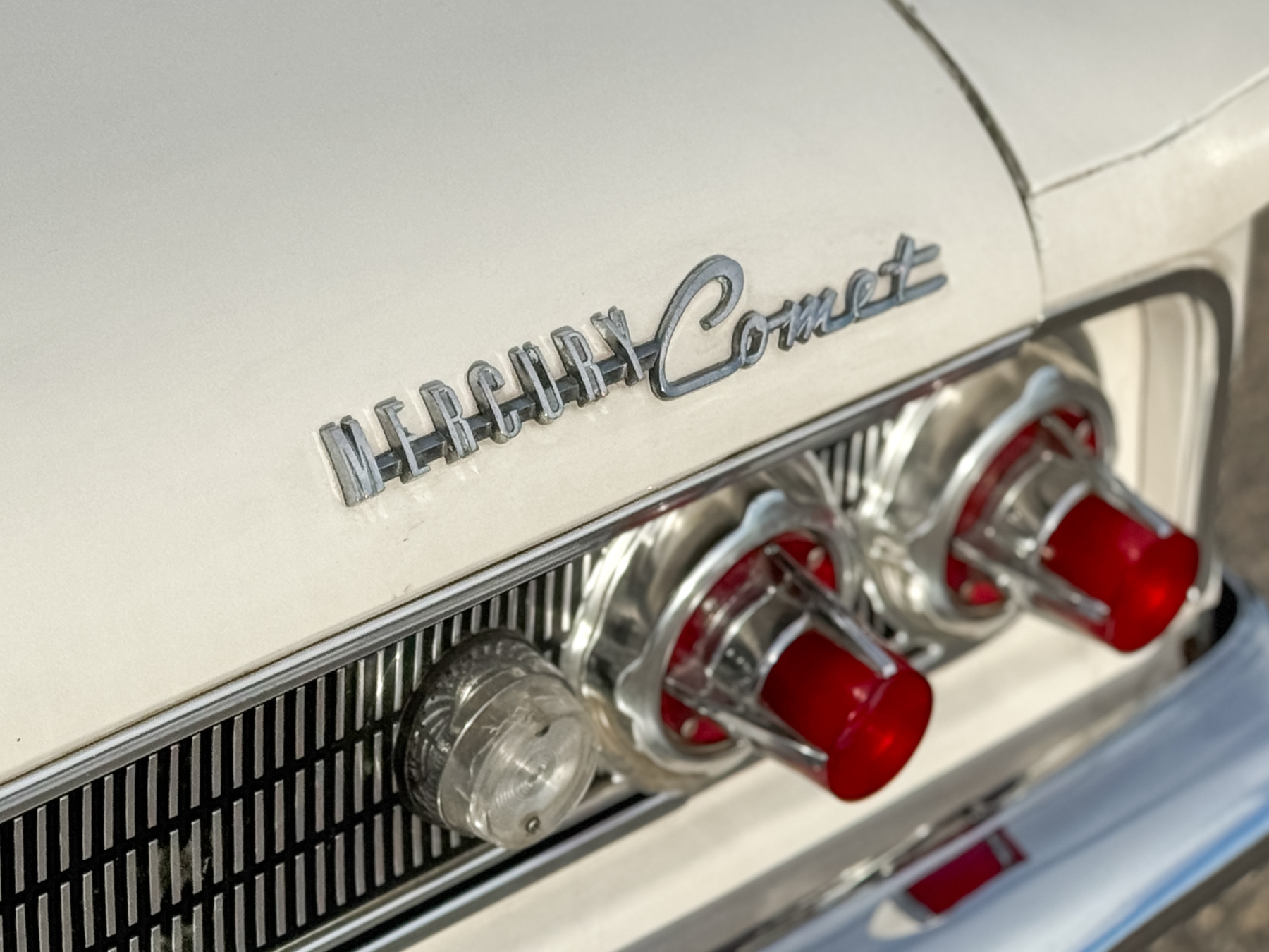 1963 Mercury Comet Convertible factory 170 cu in inline-six paired with the rare factory 4-speed manual transmission. Canadian-built in Wimbledon White over red and white interior, featuring a brand-new black convertible top. A clean early-’60s convertible with a rare manual setup that stands out from the typical automatic examples.