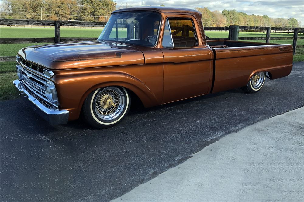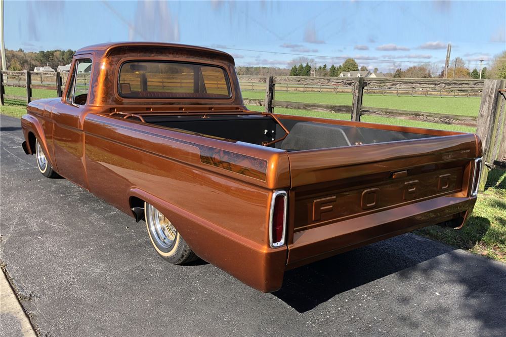 This 1965 Ford F250 is an air bagged hot rod pickup and completely custom inside and out. Its finished in House of Kolor Kandy Copper paint with custom airbrushing, shaved door handles and drip rail, and filled bed and cab seams. It comes equipped with a 1976 Camaro subframe clip, Firestone airbags, fully painted frame, custom trussed Chevy 5 lug, 10 bolt rear axle, and hot rod style 15x8 chrome Dayton wire wheels. This custom pickup is powered by a Chevy 350ci V8 engine with Edelbrock camshaft, intake and carburetor with Patriot headers and fishtail exhaust pipes. The engine is backed by a Turbo 350 automatic transmission with a BM shift kit and Ty Snyder Welding 2-piece driveshaft. The pickup features an OEM grille, taillamps and turn signal doors, and a custom airbrushed RCI 20 gallon aluminum fuel cell mounted in the bed. The full custom interior features a Speedway stainless steering column with quick disconnect, era-correct Stewart Warner gauges, and a subwoofer speaker and battery enclosure behind the cab along with two Orion amplifiers in the rear of the custom bed.