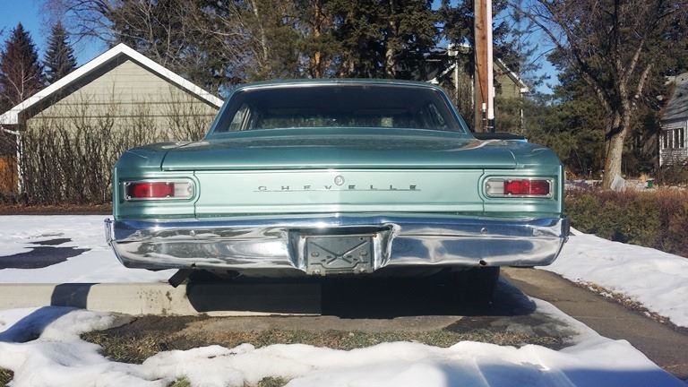 Newer 14 inch Malibu rallye wheels installed with white wall tires. Original wheels and poverty caps in the trunk.