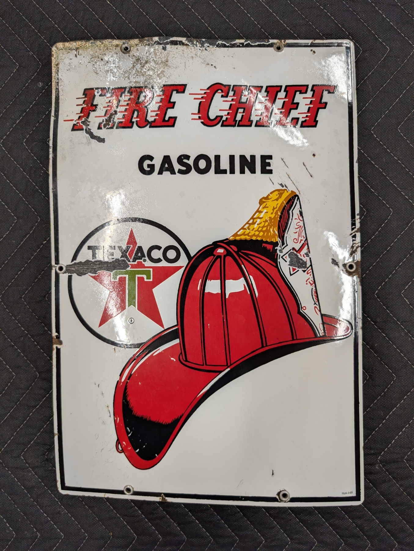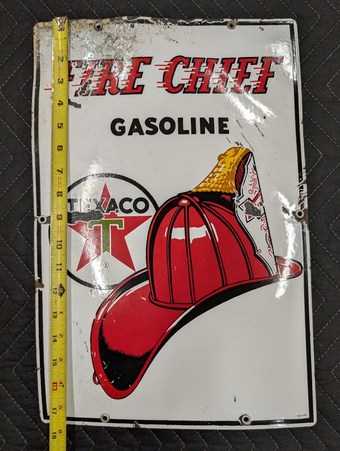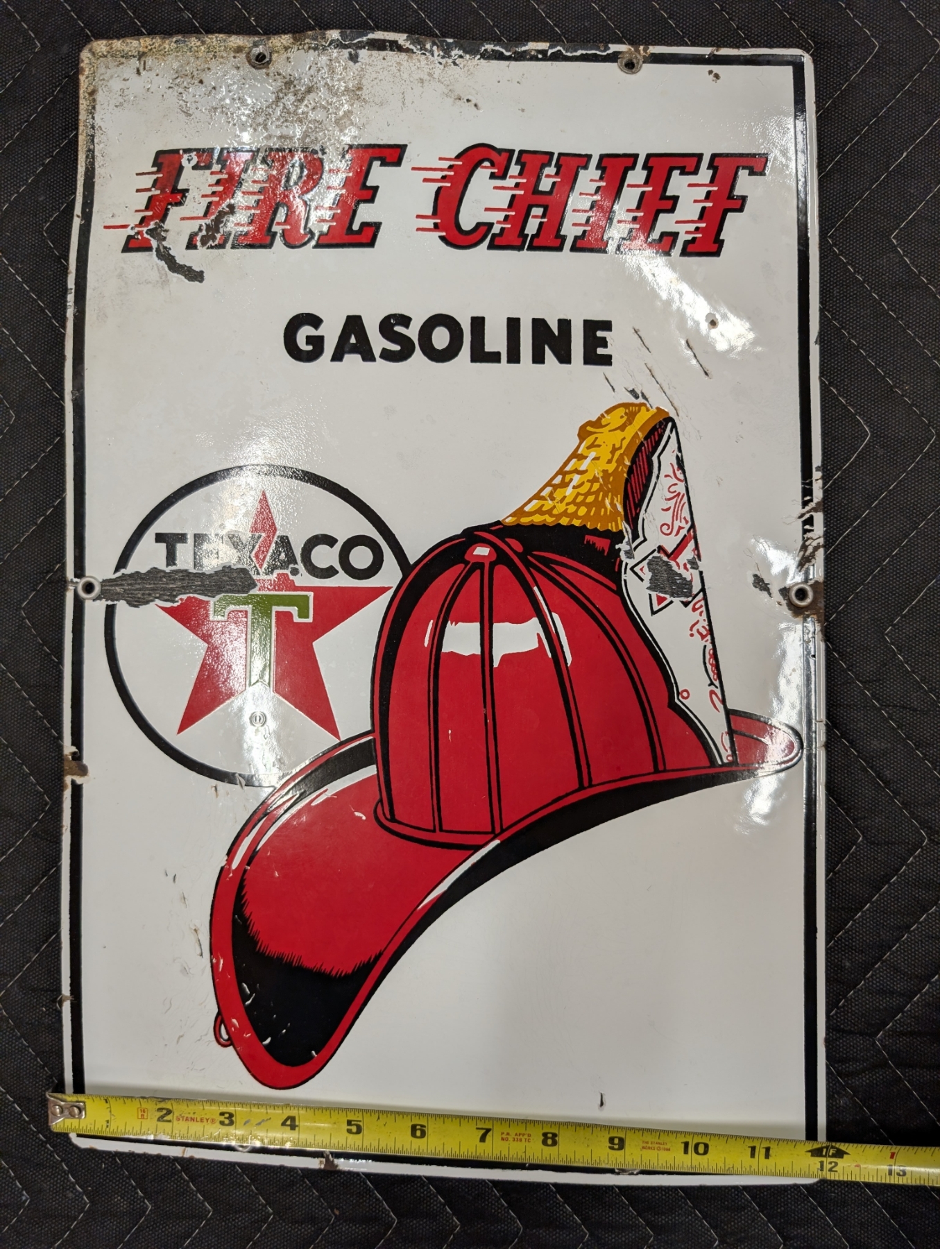 1966 Porcelain Texaco Fire Chief pump plate! Good colours and all grommets in place! 18 inches by 12 inches!