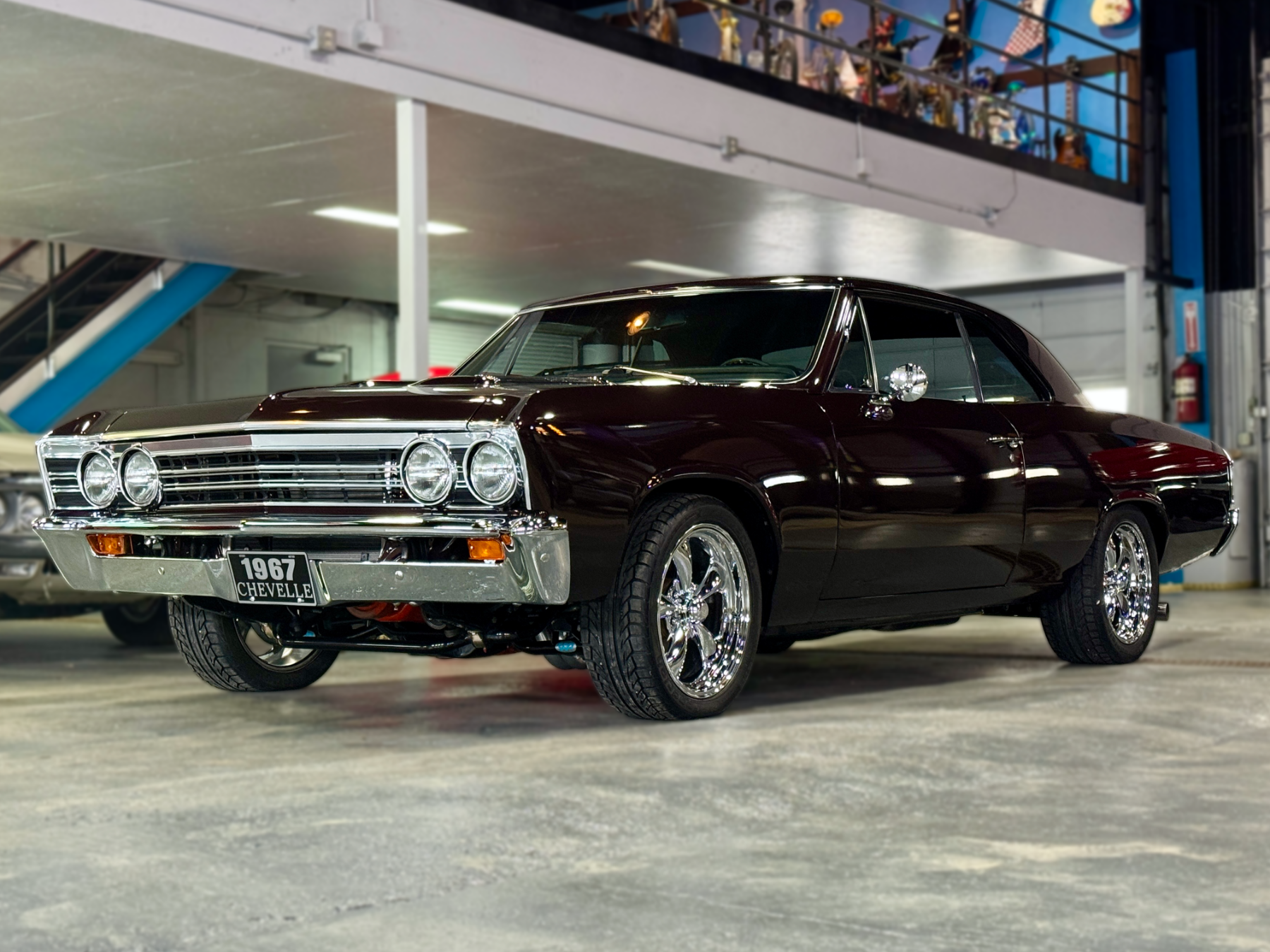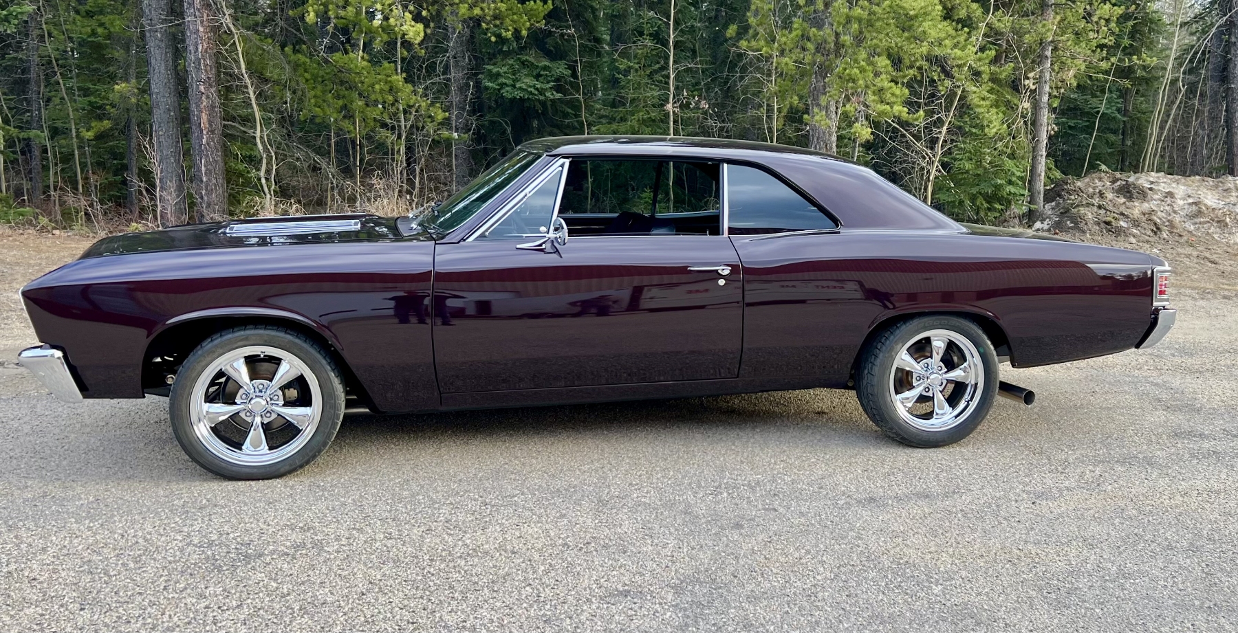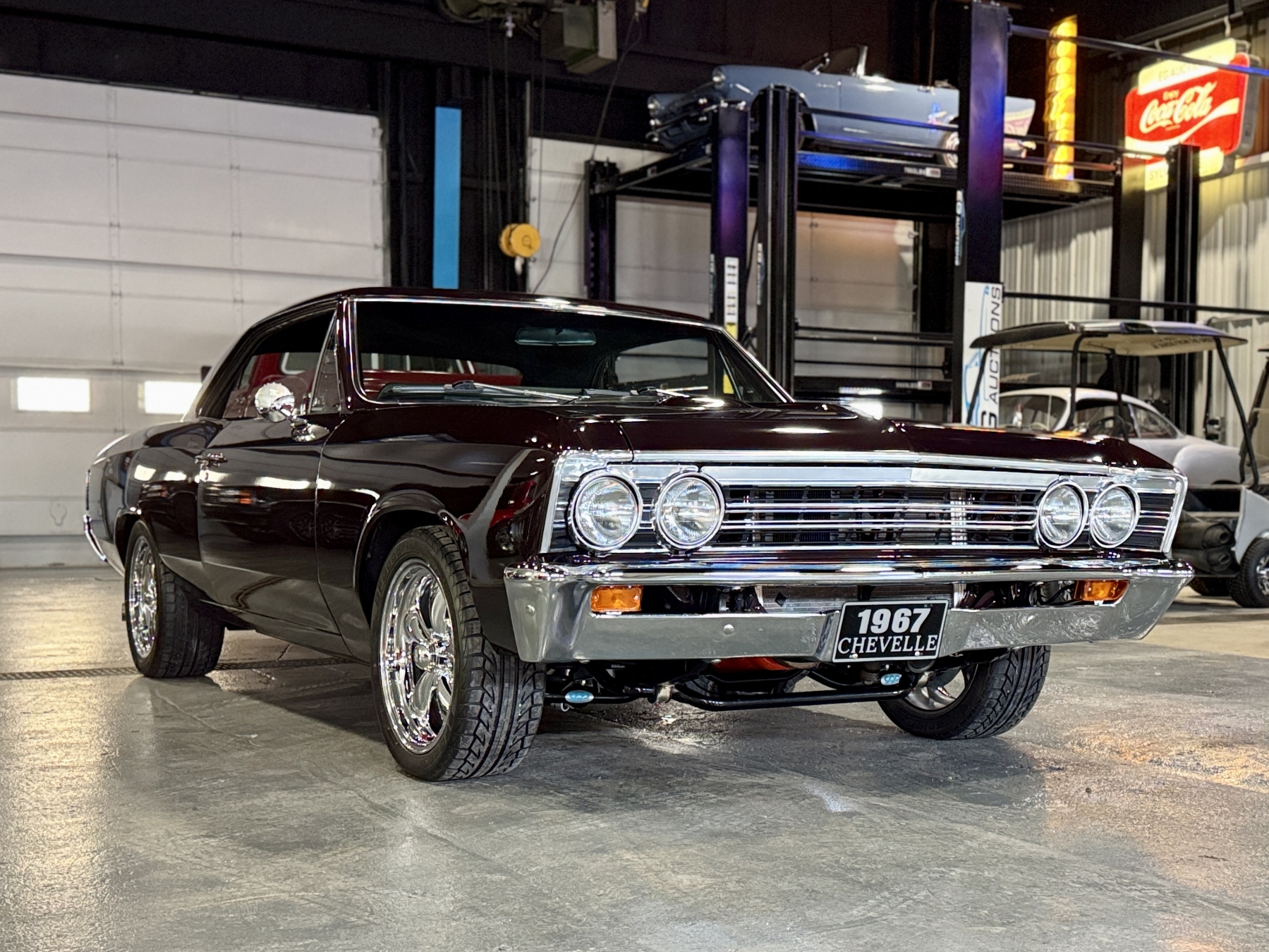 Stunning 1967 Chevelle Malibu, professionally completed frame-off restoration with less than 100 km driven since completion. Finished in a deep Black Cherry Pearl over an immaculate body featuring all new Goodmark Industries panels and a factory-style big block hood. This car blends classic muscle looks with modern drivability and performance upgrades throughout.