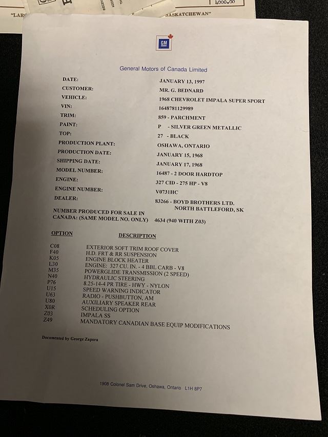 THIS CAR WAS PURCHASED NEW IN NORTH BATTLEFORD SK , THE ORIGINAL OWNERS PRIDE AND JOY. AFTER THEY DECIDED TO SELL, IT WENT TO THEIR NOW RETIRED GRANDSON. THE CURRENT REGISTERED OWNER. THIS CAR IS LIKE IT WAS WHEN ROLLED OFF THE FACTORY FLOOR EXCEPT, THE BEAUTIFUL PAINT JOB THAT WAS DONE IN 2001, BACK TO THE ORIGINAL COLOR . THIS CAR HAS NEVER BEEN DAMAGED OR RUSTY .