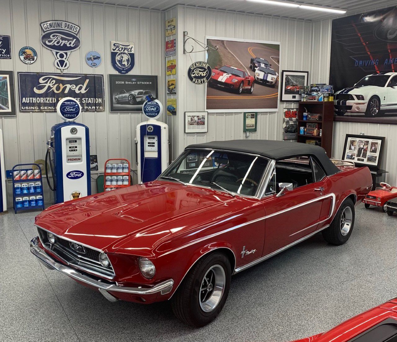 1968 Ford mustang convertible. Factory 289 C code V8 engine. Factory three speed automatic transmission. Finished in Candy Apple Red with mustang GT accents. Rides on a brand new magnum 500 wheels. Alberta registered