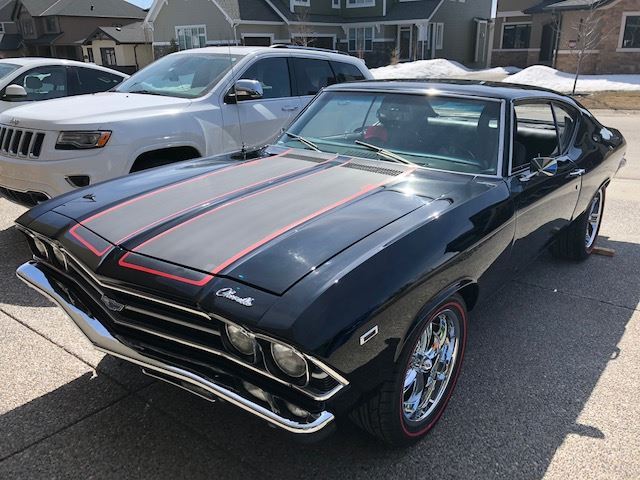 1969 Chevelle Malibu RestomodRebuilt; full frame off rotisserie body restoration402 Big Block New Rebuild by Precision in Calgary 4 speed Super T10 TransmissionHedman Headers and 3 Pypes Stainless Exhaust SystemMBM four wheel drilled and slotted disc brake system12 bolt rear end with Auburn posi unit18 Ridler Chrome Rims with 2 dropped suspension springs and Jet Black Valspar base clear, colour sanded and polishedMatte black finish rally stripes with red accentsFrame boxed-in coated in matte finish base coat clear coatCustom black and red leather interior including accent leather by CoachModern bucket seats for style and comfortCustom dash cluster