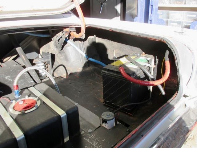 Original body panels, all glass windows with crank mechanisms, chrome bumpers, front and rear window trim, original grill, fibreglass hood with aero scoop and carburetor tray. Rear wheel wells cut to accept slicks. One rust spot that I have found as shown in photos, needs exterior paint. 4” Centerlines front with Mickey T’s, 10.5 Centerline rears with Hoosier 29.0 X 11.0 X 15 slicks screwed to rim. Long studs on all 4 corners.