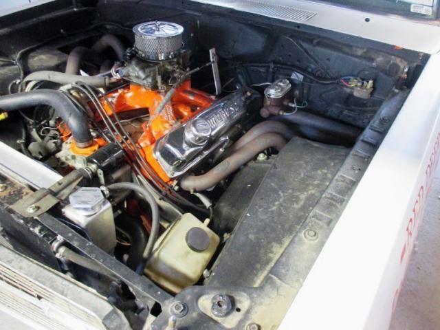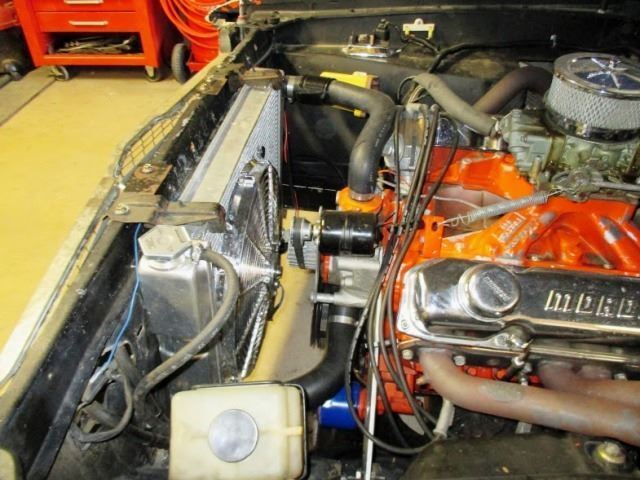 Edelbrock Torker intake, 850 Holly annular discharge Double pumper, 1” phenol carburetor spacer, Holley pressure regulator, Holly 350 race fuel pump, SS braided fuel lines. Mopar electronic ignition, chrome box MSD wires, Accel coil, alternator. Hooker Competition 2” fender well headers with EGT gauge bungs wended in #1,2,7 & 8 tubes.