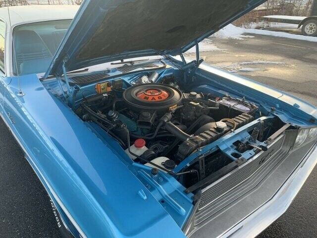 This is one of the most striking cars we've had -- finished in its correct (EB5) blue with (V1W) white gator top, (V7W) white stripes all over-top of the correct (H6B5) blue bucket seat interior. It is running the numbers matching (E61) 383 big block matched to the original (D32) 727 automatic. Some additional options correct to the car include (A01/A04) light and radio groups, (H51) air conditioning, (G11) tinted glass, (W21) rallye wheels, (M85) front/rear bumper guards, and (C16/C55) bucket seats with console. The body and interior are in amazing condition.