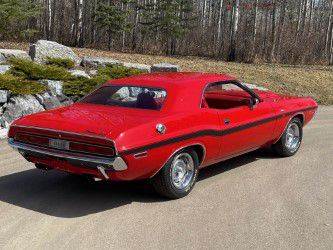1970 Dodge Challenger RT 440. This stunning factory RT has underwent a complete rotisserie show quality restoration starting with only 59,000 original miles. This car was completely restored with only approximately 100 show miles on it currently. 440 U code magnum engine and is a factory red red car with bucket seats and consul. These color combinations are extremely rare and it is believed to be one of one in this color combination. The 440 RT is documented with its factory build. This stunning, one-of-a-kind RT challenger retains its original data tag and VIN number. The other side of the car is as nice as the top with everything restore to factory specifications Including The Trunk compartment. 375hp engine complimented to its factory, torque flight automatic, three speed transmission. The engine bay has been detailed to complete factory specifications. Alberta Registered