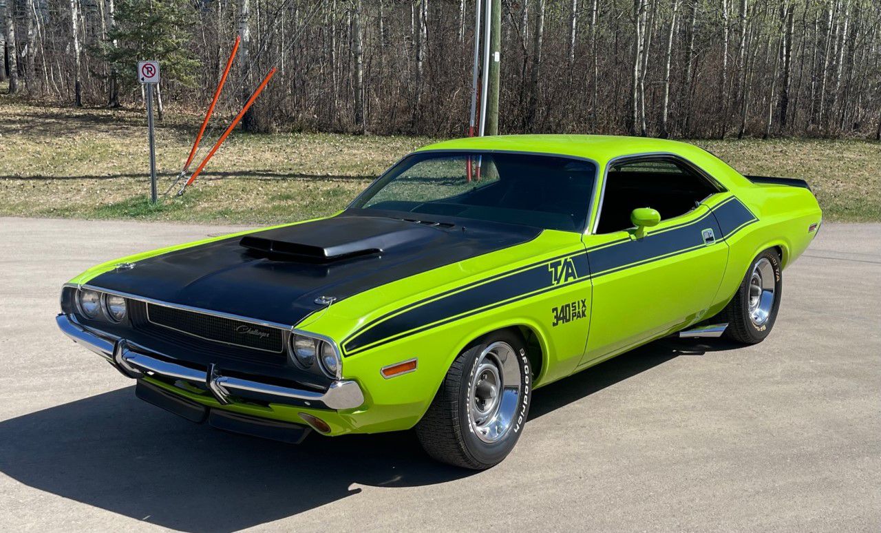 1970 Dodge Challenger, TA 340 6 pack. 4 speed manual transmission. This stunning 1970 Dodge Challenger complete restoration is beautifully finished in sublime green from top to bottom. The underside is painted body colour and the engine is detailed to show quality. Even the trunk is beautifully done. Select offering from the Wild Rose Collection.
