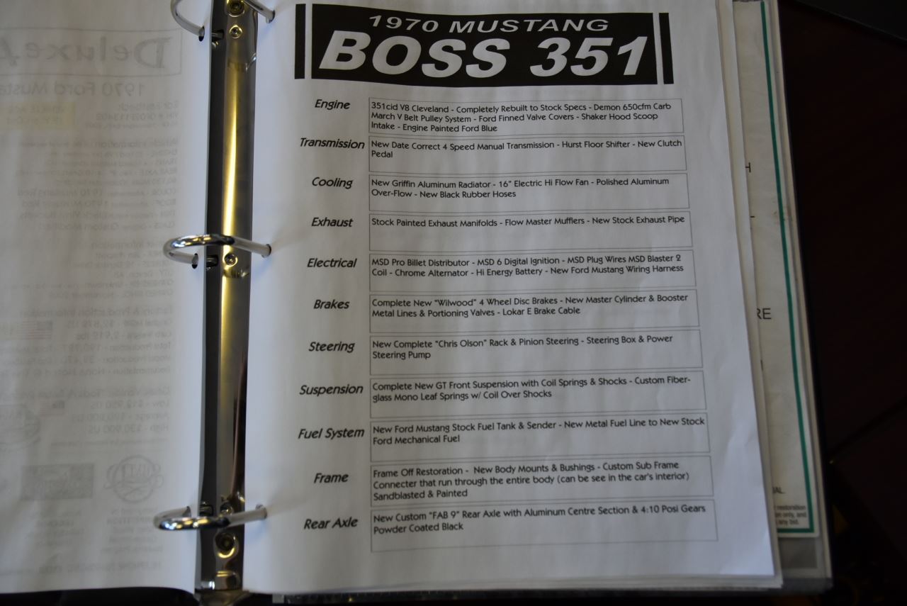 1970 Ford Mustang Boss 351 Tribute. Frame Off Restoration. New Body Mounts and Bushings. Custom Sub Frame connector that runs through the entire body. New Custom Fab 9. Rear Axle with Aluminum Center Section 4:10 Posi Gears. Power Coated black interior. Complete New Stock Mustang Interior. Black Vinyl Seat Covers. Headliner, Carpet, Door Panels, Floor Pedals, Arm Rests, Rear Shelf, Chrome Door Sill Plates, Chrome Hardware Seat Belts. And Rear View MirrorDash. New Dash Pad - Original Factory Dash Original Factory GaugesMustang GT Foam Padded Steering Wheel, New Steering Column. New 15 Ford Magnum 500 Chrome . Steel Wheels New Firestone Radial Tires. Tire Size Front P235/60/R15. Rear P275/50/R15
