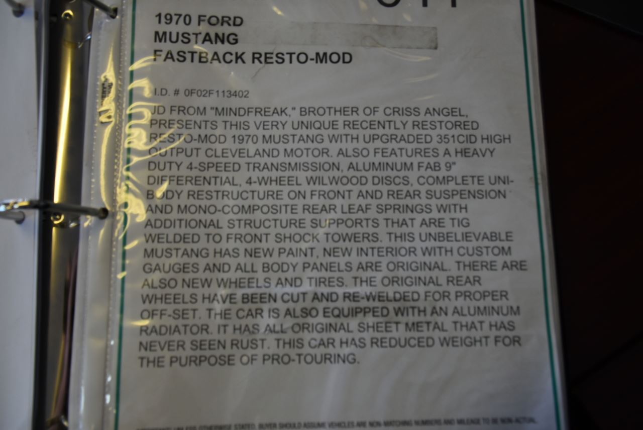 MSD Pro Billet Distributor. MSD 6 Digital Ignition. MSD Plug Wires, MSD Blaster 2 Coil. Chrome Alternator. New Ford Mustang Wiring HarnessComplete New Wilwood 4 Wheel Disk Brakes. New Master Cylinder Booster. Metal Lines Porting Valves. Lokar E Brake Cable. Complete New GT Front Suspension with Coil Springs Shocks. Custom Fiberglass Mono Leaf Springs w/Coil Over ShocksNew Ford Mustang Stock Fuel Tank Sender. New Metal Fuel Line to New Stock Ford Mechanical Fuel.This Mustang was restored or created for or by Criss Angel's older brother DJ and sold at the Las Vegas Barrett Jackson.