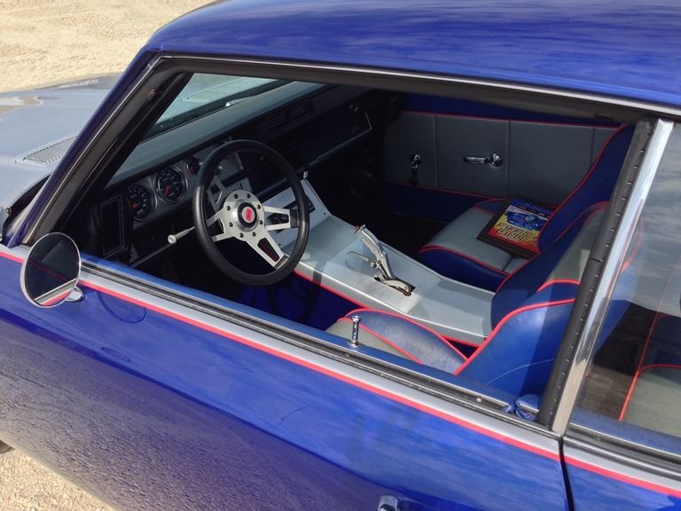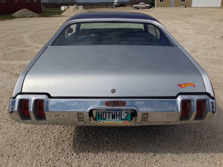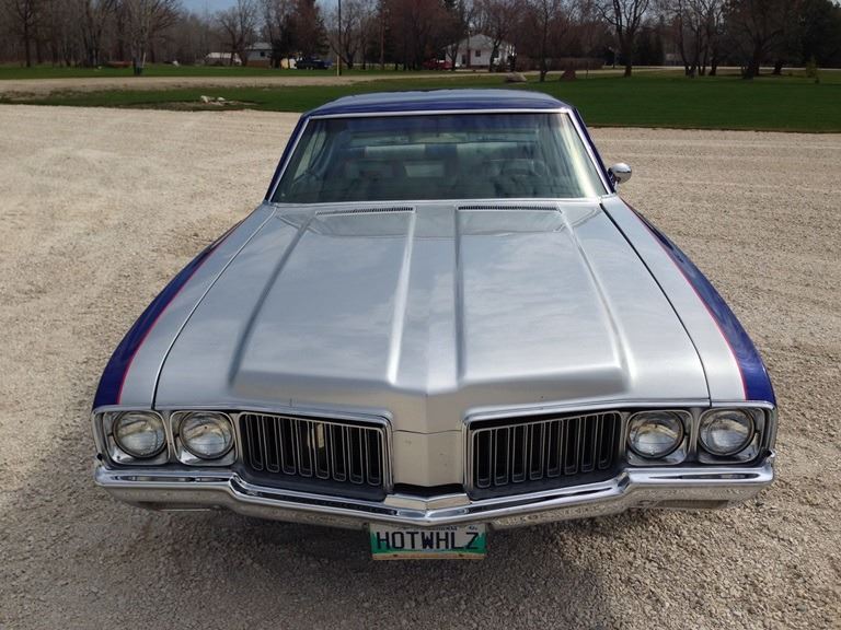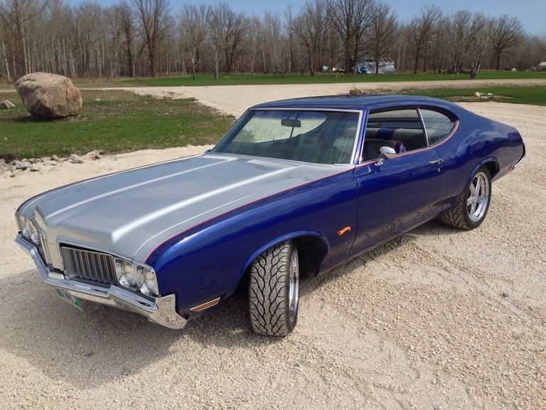 1970 “Hotwheels” Oldsmobile Cutlass S. Frame off restoration. Powder coated frame. All steel panels. Custom metal flake/pearl blue grey paint. Rebuilt Oldmobile 455 X block. Eliminator intake with 750 Holly carb. Aluminum rad with electric fan. Pro Comp Ceramic headers. Freshly rebuilt turbo 350 transmission. Moser 9 in rear differential. BFG 275/40 ZR18 tires on the rear, 245/45 ZR 17 on the front. Custom 3 in stainless steel exhaust with cut outs. Line lock. Hurst pistol grip shifter. Custom “Hotwheels” interior with custom centre council. Alpine stereo, speakers and amp. MTX subs with Rockford Fosgate amp.
