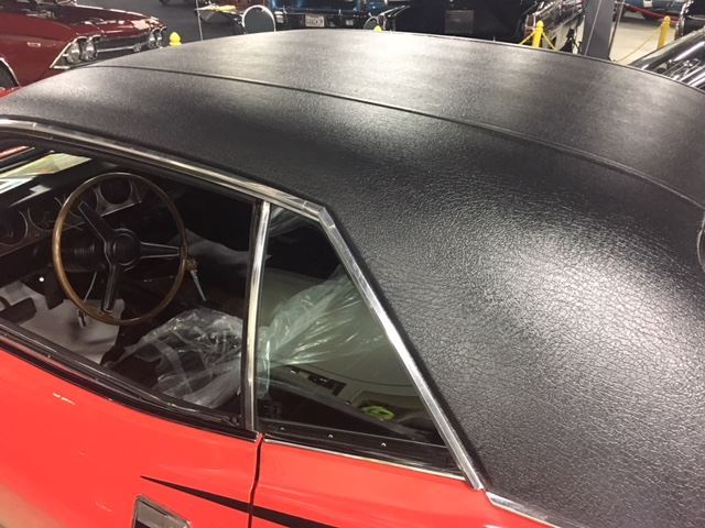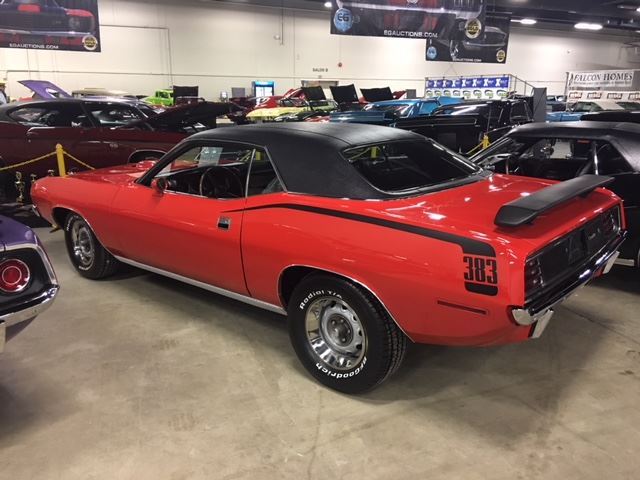 This is an original big block cuda finished in its original FE5 bright red over black bucket seat interior. The car came out of southern USA, so the body is in excellent condition. Car has shaker hood option. Comes with black vinyl roof, road wing, rally wheels, radial T.A. tires, hockey stick stripe and fish gill rockers. Very solid recent frame up restoration.