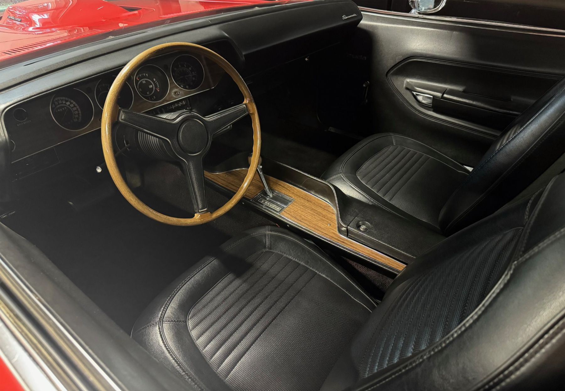 Inside, the Hemi Cuda offers a driver-focused cockpit with high-back bucket seats, a center console, and a rally instrument cluster featuring a 150 mph speedometer and an 8000 rpm tachometer. The interior could be customized with various trim levels and options, including leather seats and woodgrain accents.