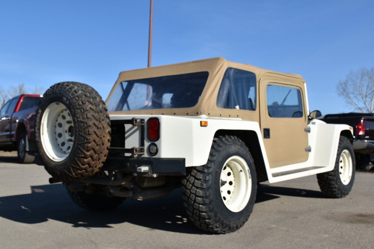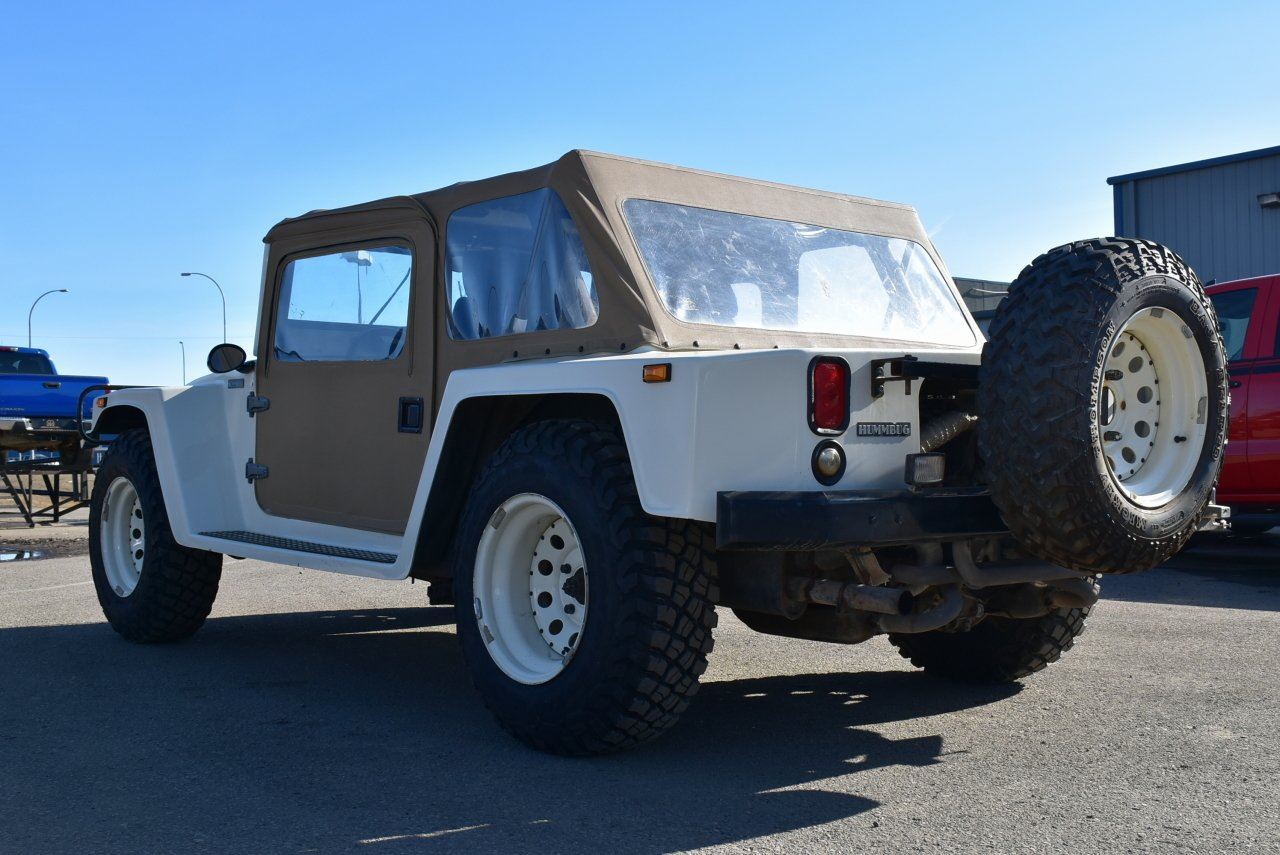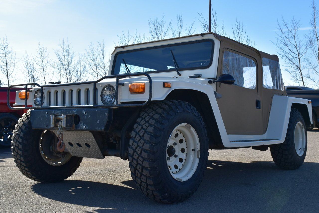 The cloth top is removable for cruising the strip/lakeshore. With bucket seats in the front and bench seat in the back. Complete with front mounted Superwinch LT2000 and the 15" rims wrapped in 30x9.5 BFG Baja Mud Terrain tires to really complete that iconic H1 look.