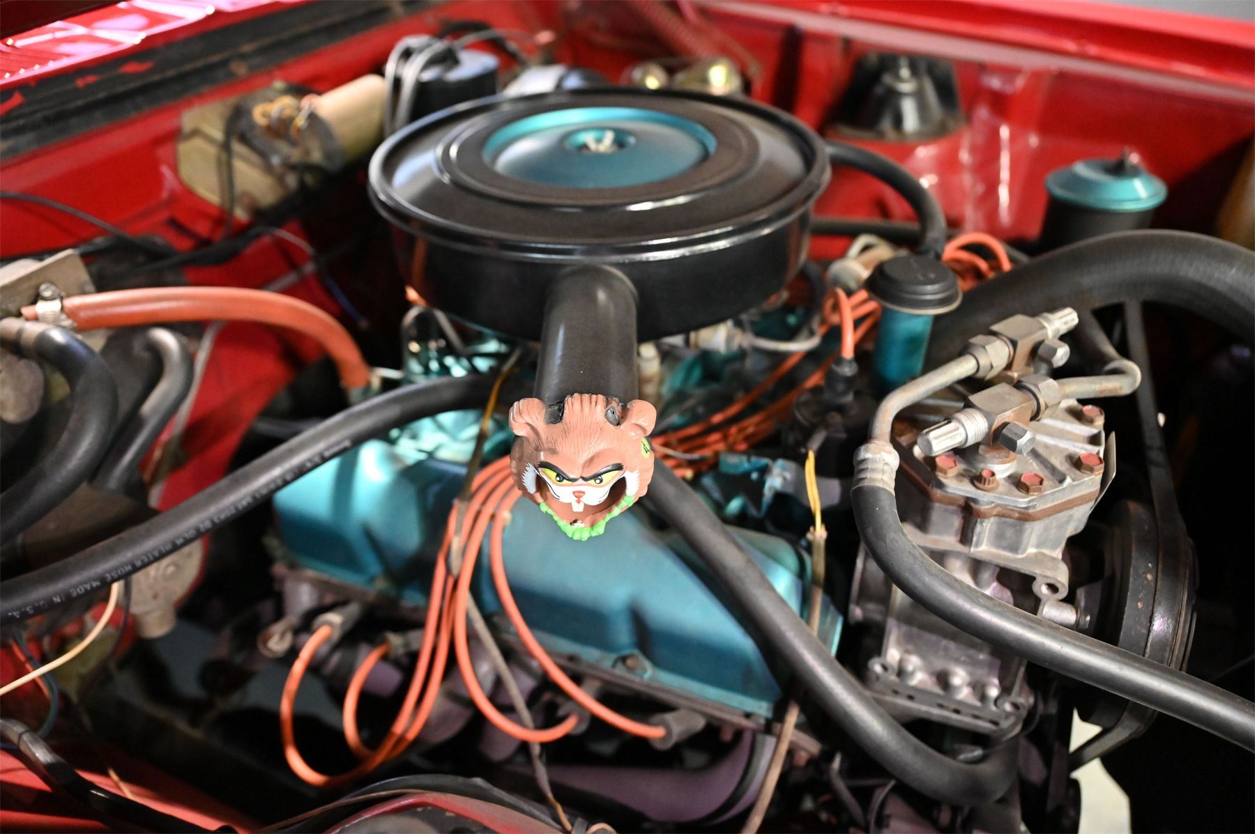 Custom Wire Spoke Wheels accent the abundance of Chrome that is in very nice condition also Comes with the original Hub Caps should a traditionalist wish to recreate the Factory look.