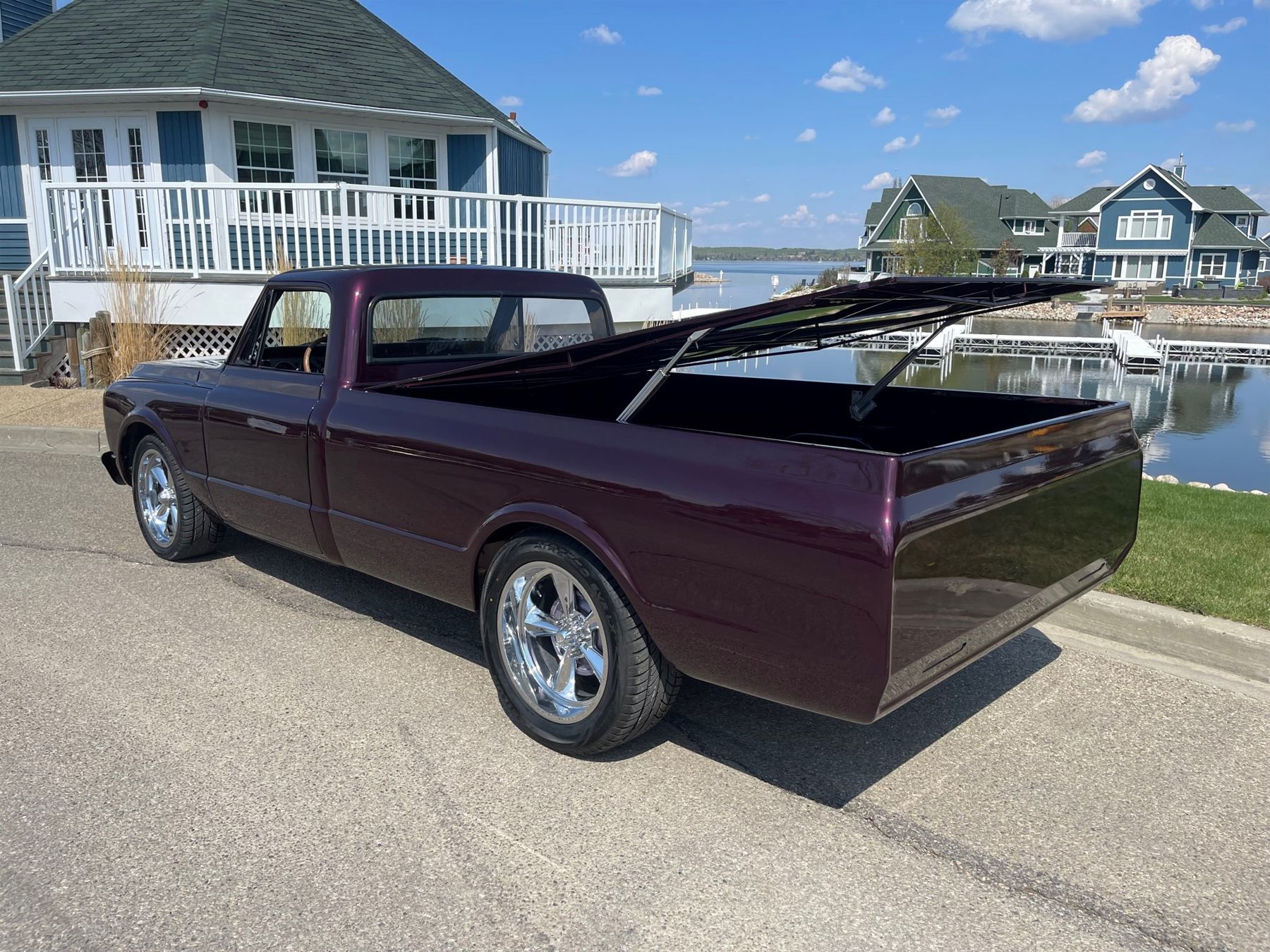 1971 Chevrolet C 10 custom. Five-year build custom long box C 10. Hydraulic box cover. Dakota digital gauges. Power steering with custom cruise high-performance, 350 engine automatic transmission GT Grant, custom steering wheel, beautiful, metallic, maroon paint with subtle ghost, flames, full custom wheels and lower to perfection. Subtle professional custom build touches on grill side panels rear end and custom chop roof. AC and front disc brakes. After market gauge set has to be set up.