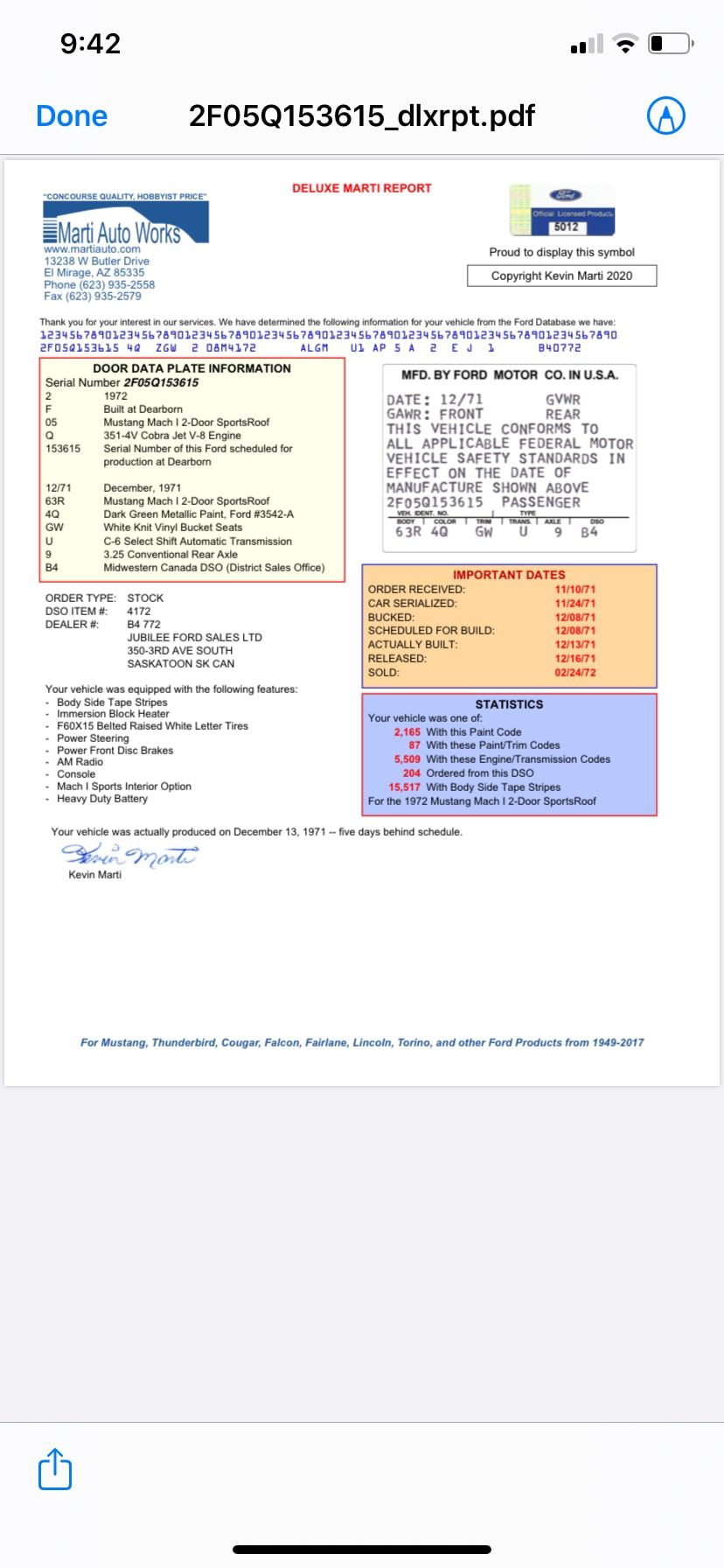 COMES WITH COPY OF ORIGINAL BILL OF SALE , ORIGINAL FORD WARRANTY CARD, ORIGINAL OWNERS MANUAL, MUSTANG SALES BROCHURE.