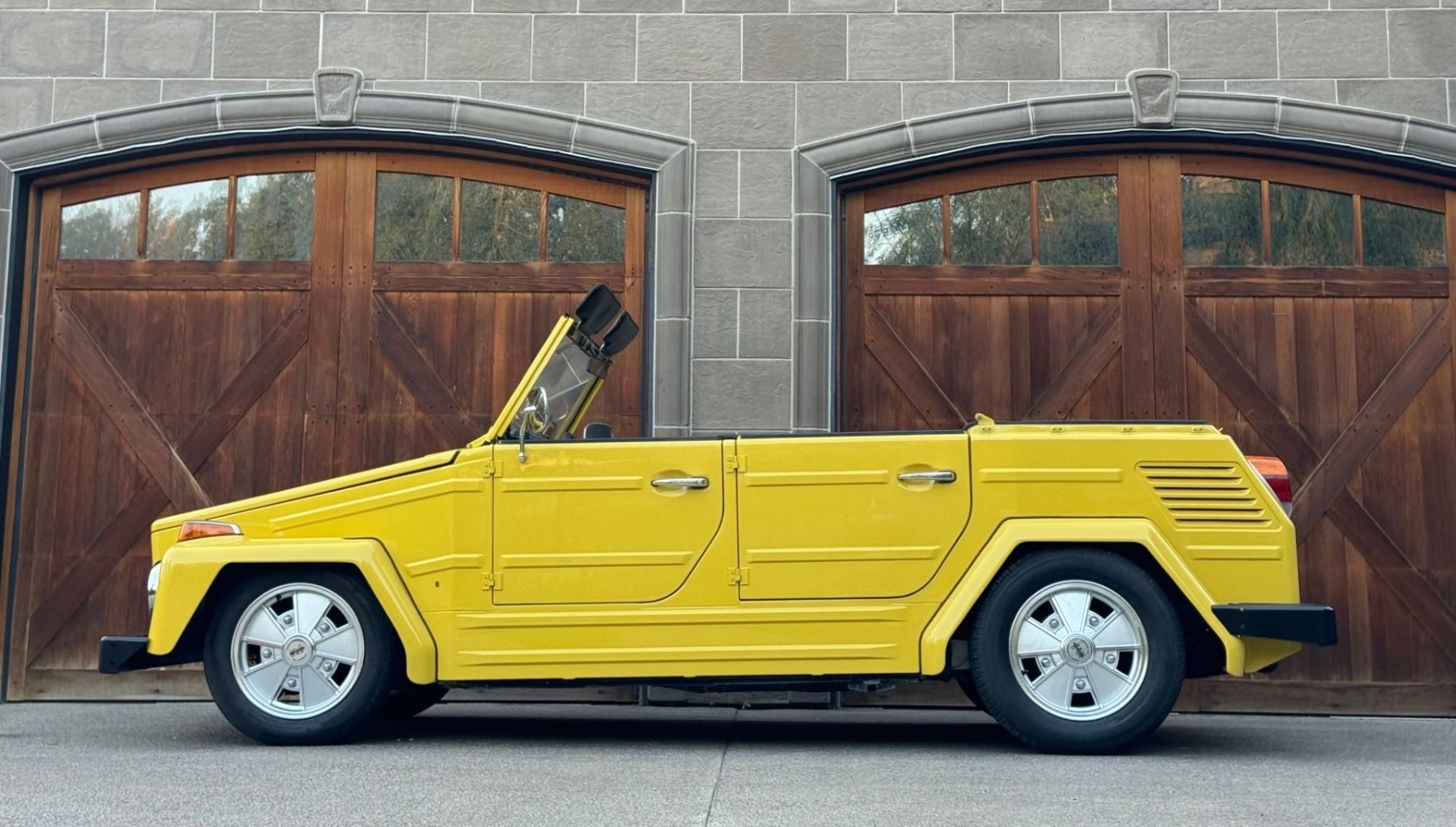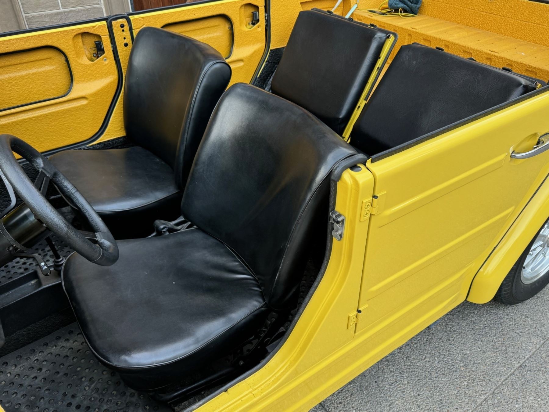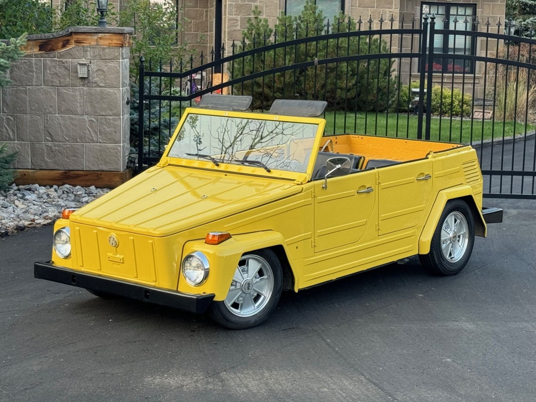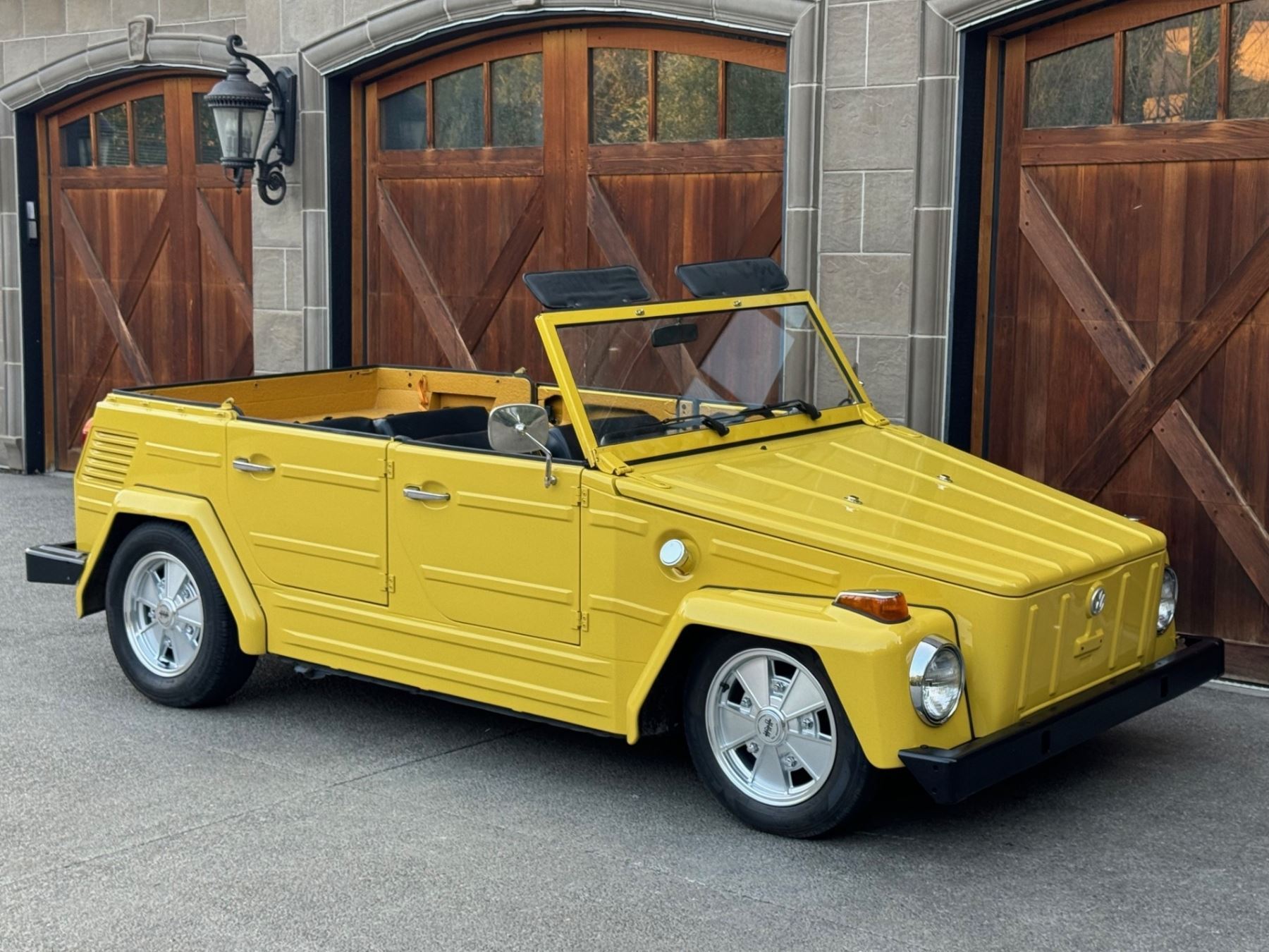 1973 Volkswagen Thing is powered by a 1.6-liter flat-four paired with a four-speed manual transaxle and is finished in yellow over black leatherette. A refurbishment is said to have been completed in 2020, and work included refinishing the exterior and the installation of a lowered suspension, 15? BRM Speedwell wheels, and a Tri-Mil exhaust. The car is also equipped with a removable hardtop, a heater, removable doors, and folding rear seats