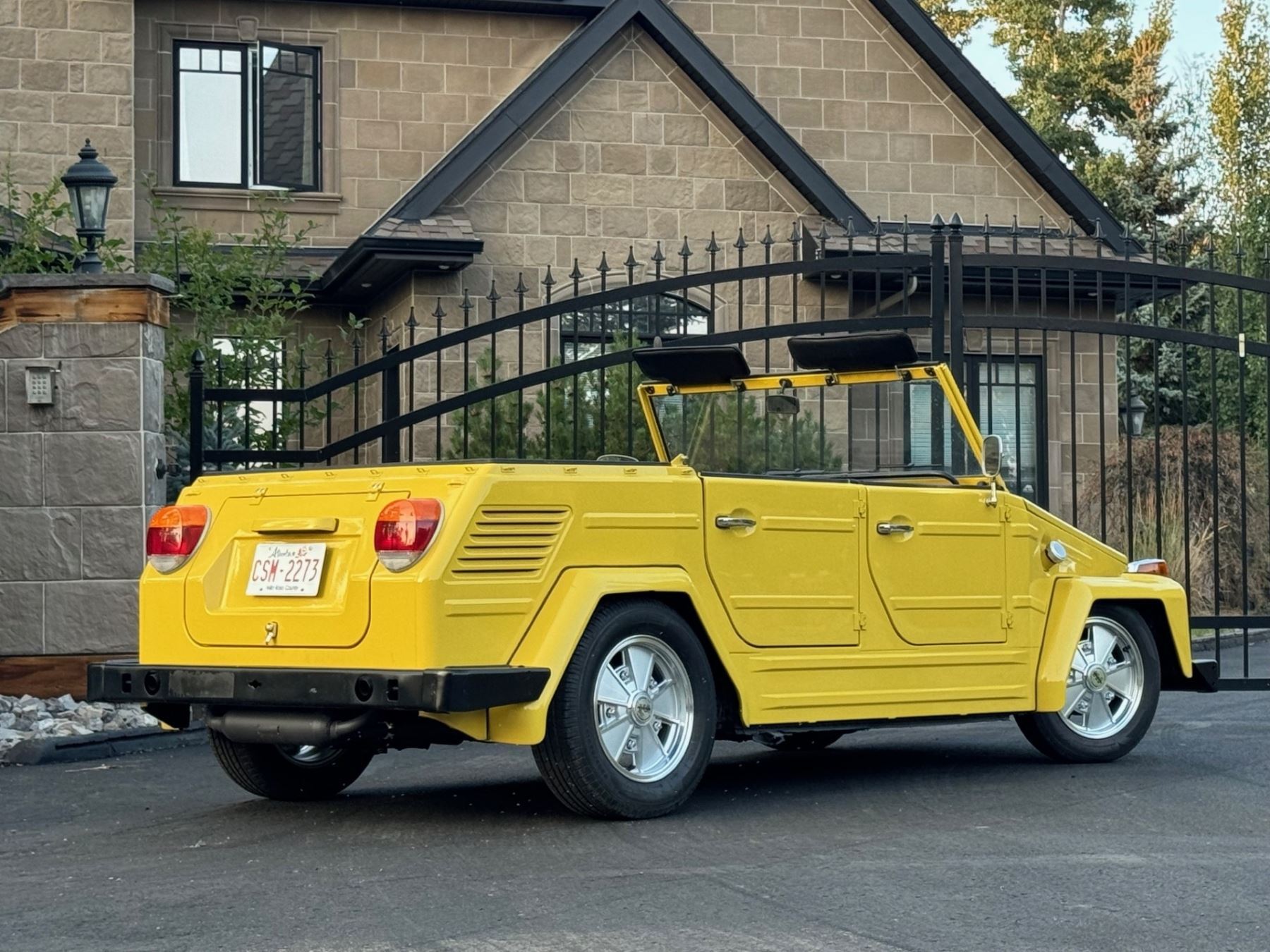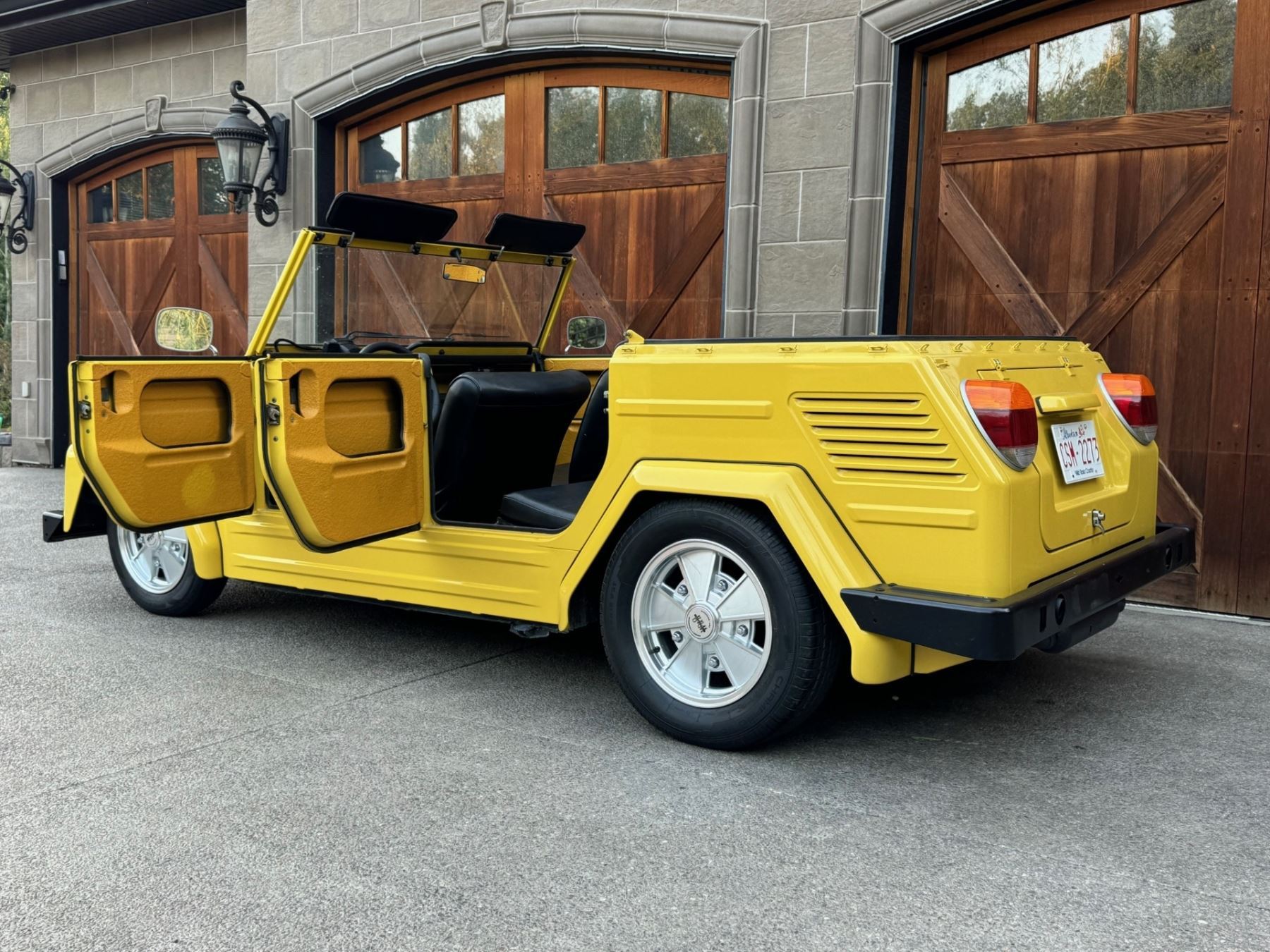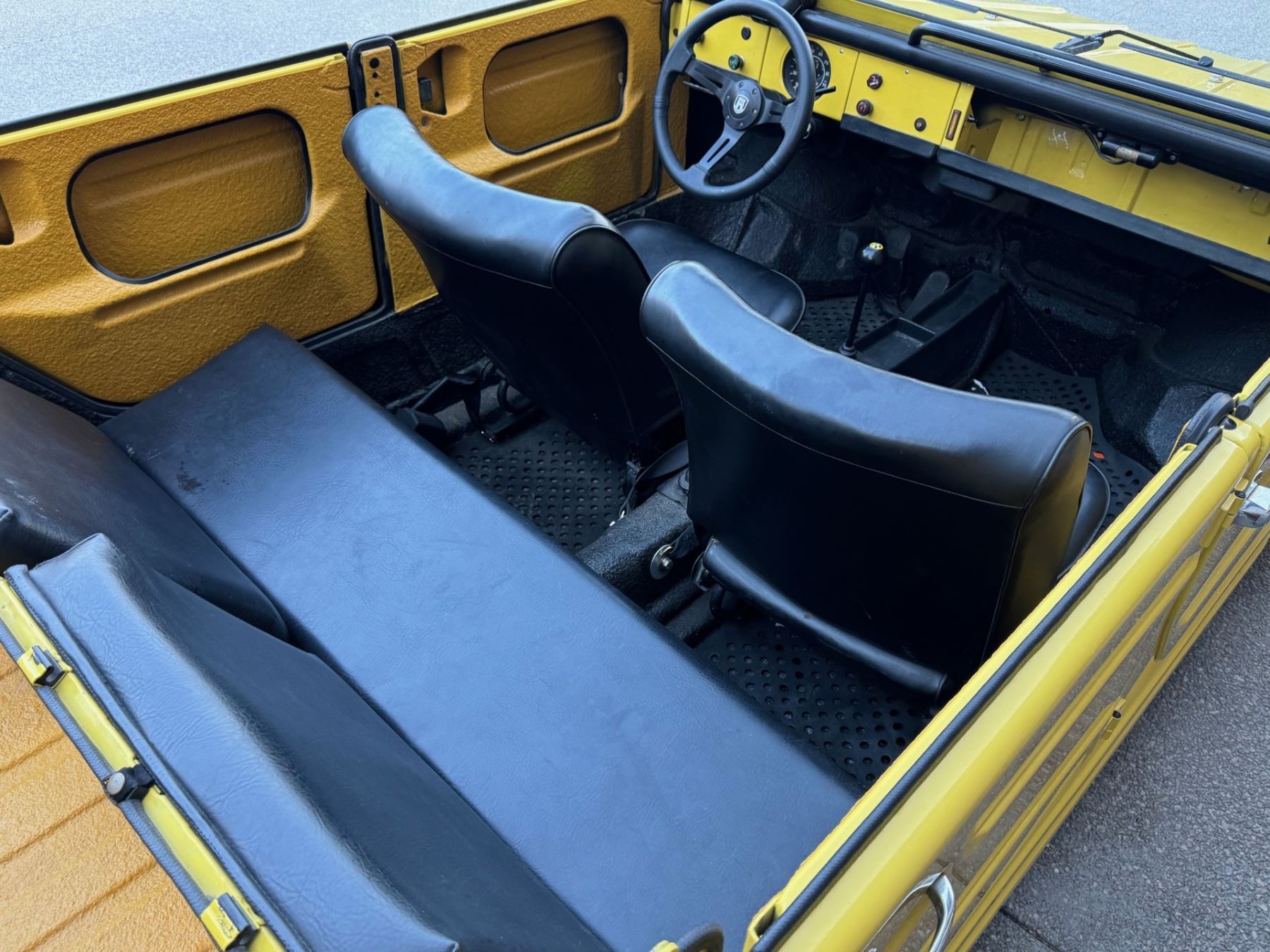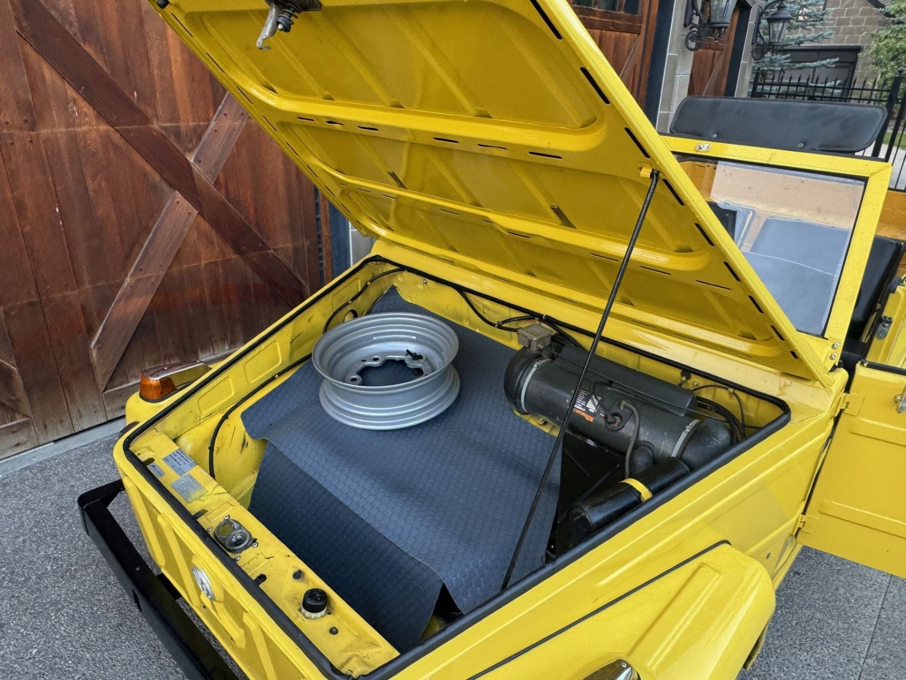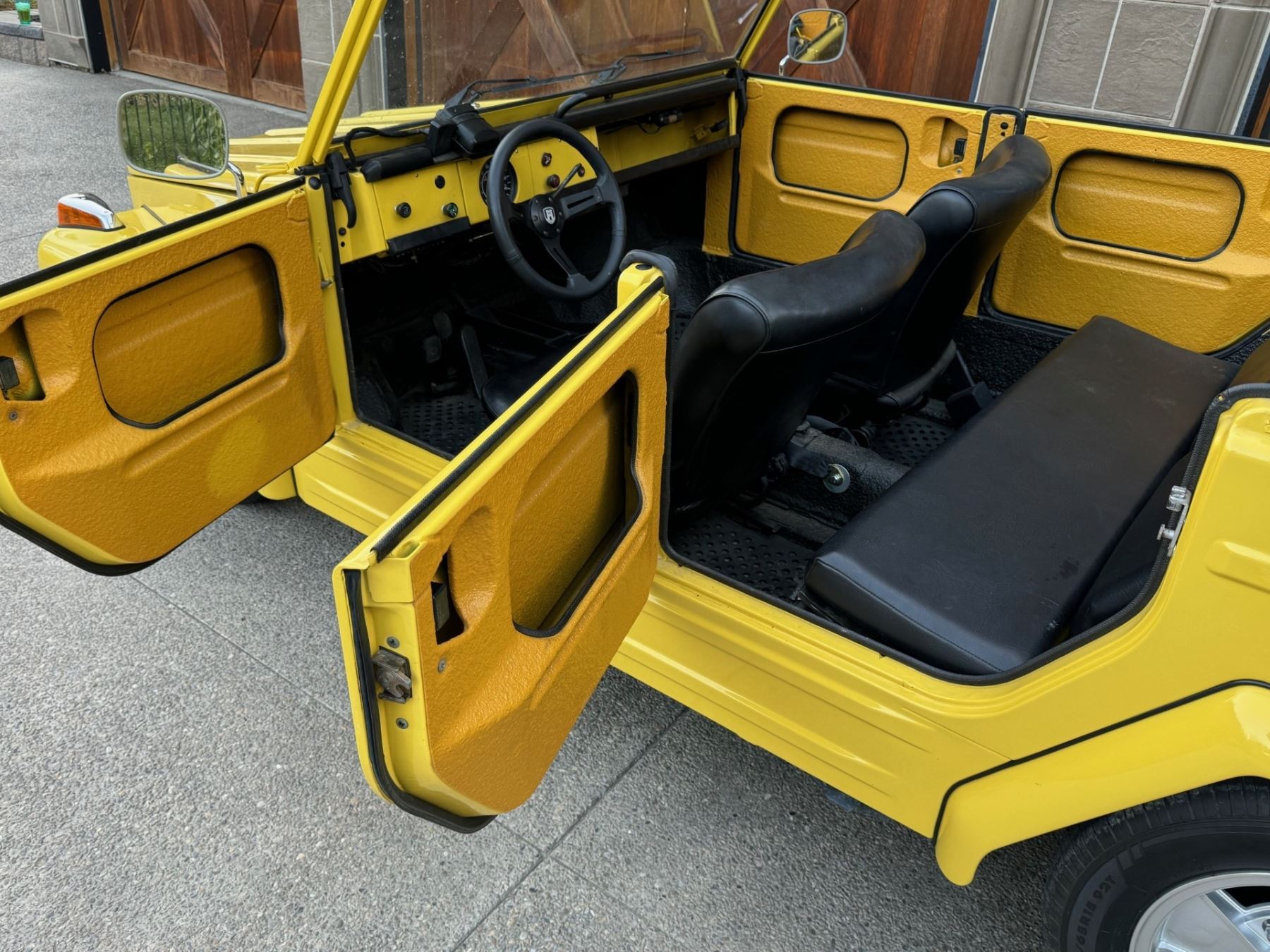 1973 Volkswagen Thing is powered by a 1.6-liter flat-four paired with a four-speed manual transaxle and is finished in yellow over black leatherette. A refurbishment is said to have been completed in 2020, and work included refinishing the exterior and the installation of a lowered suspension, 15? BRM Speedwell wheels, and a Tri-Mil exhaust. The car is also equipped with a removable hardtop, a heater, removable doors, and folding rear seats