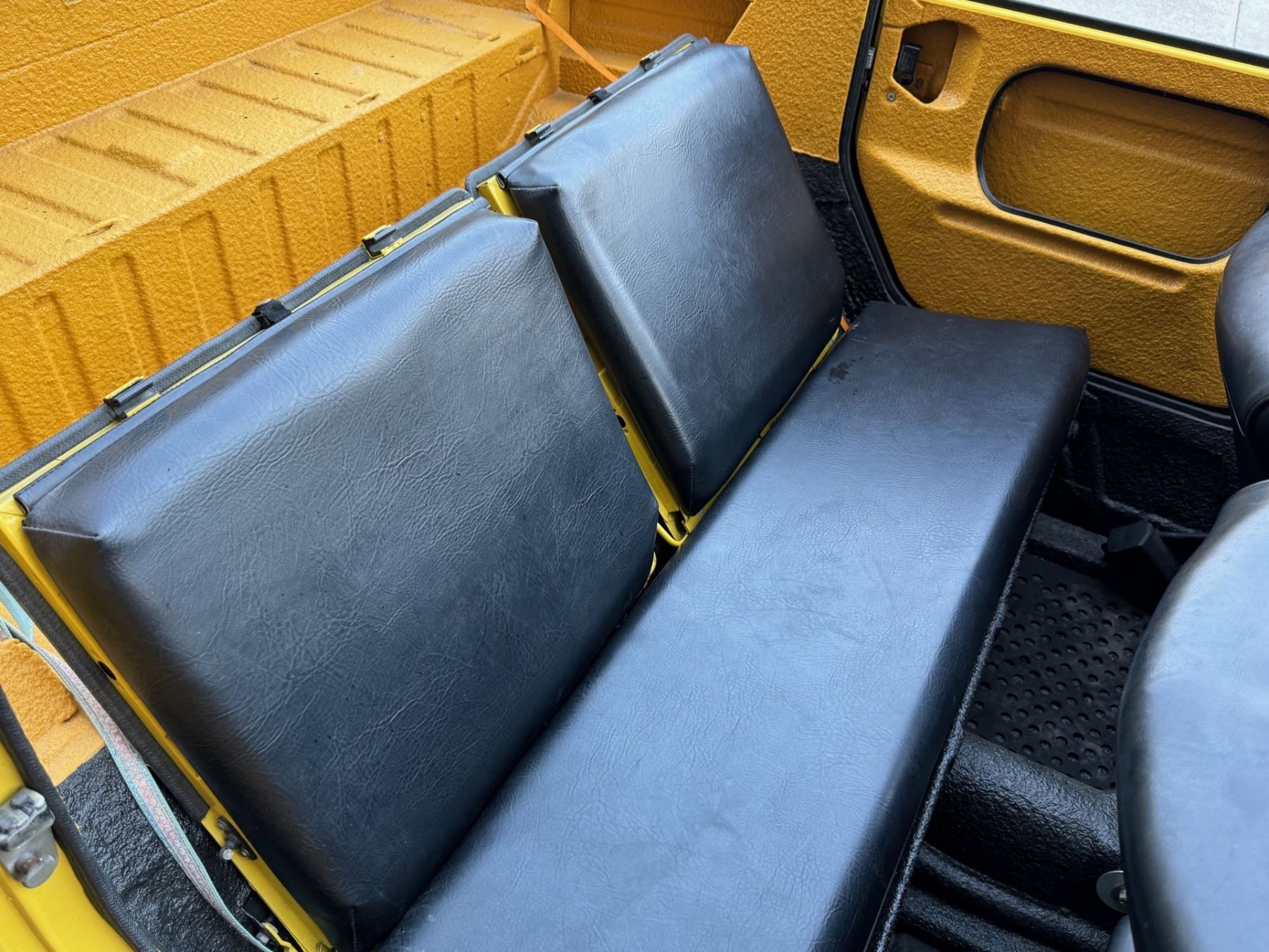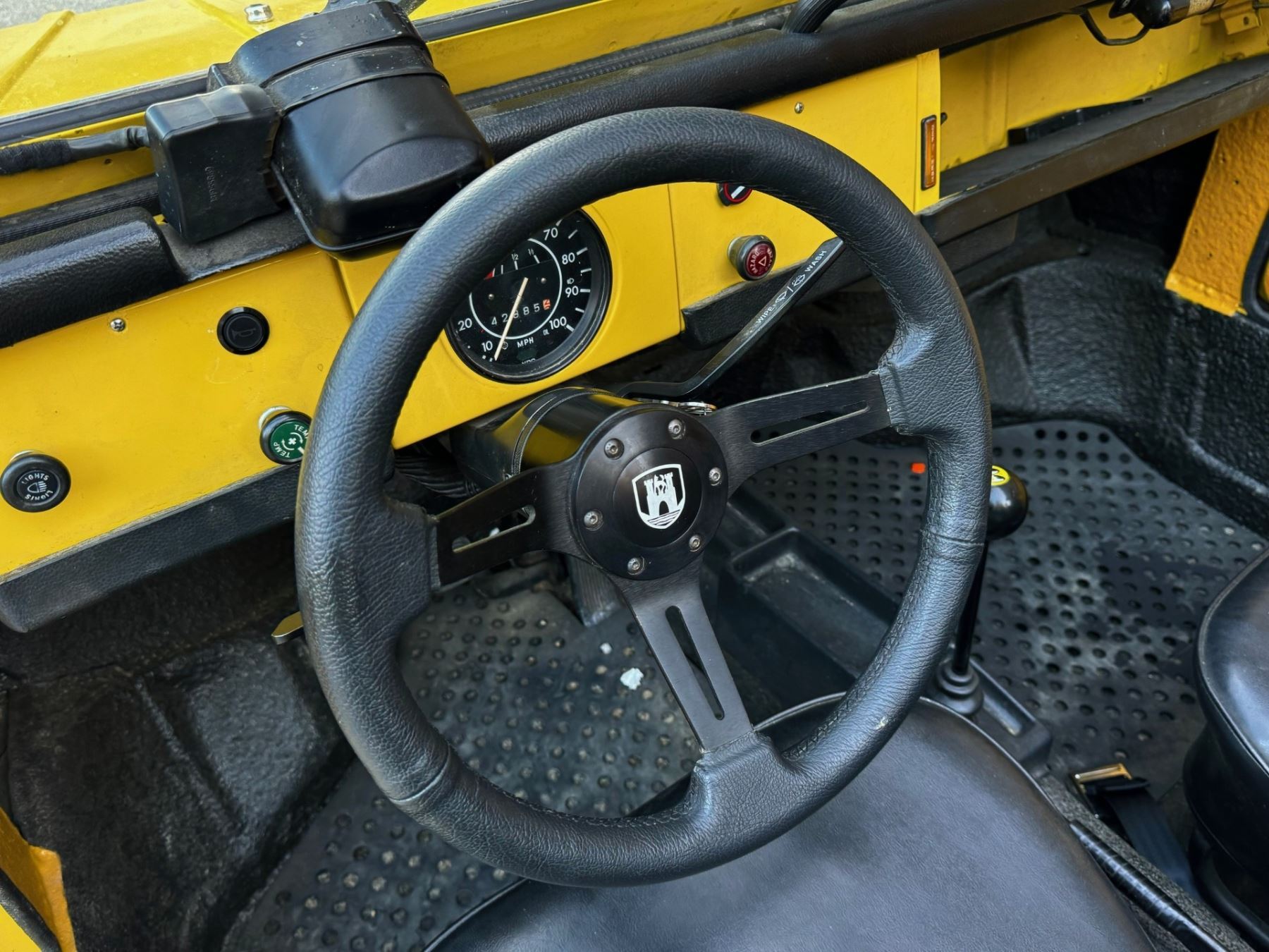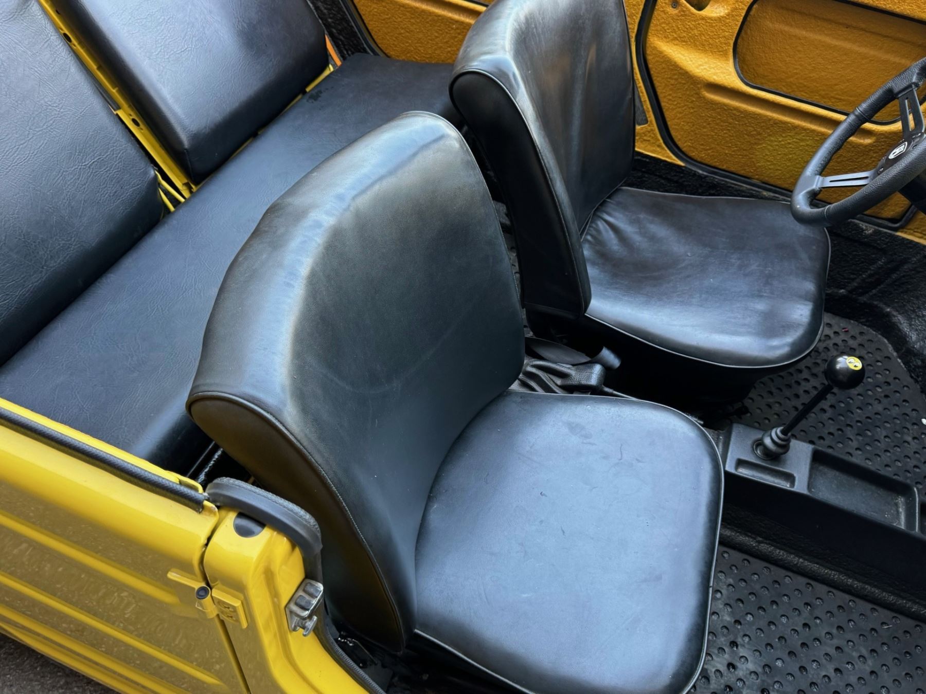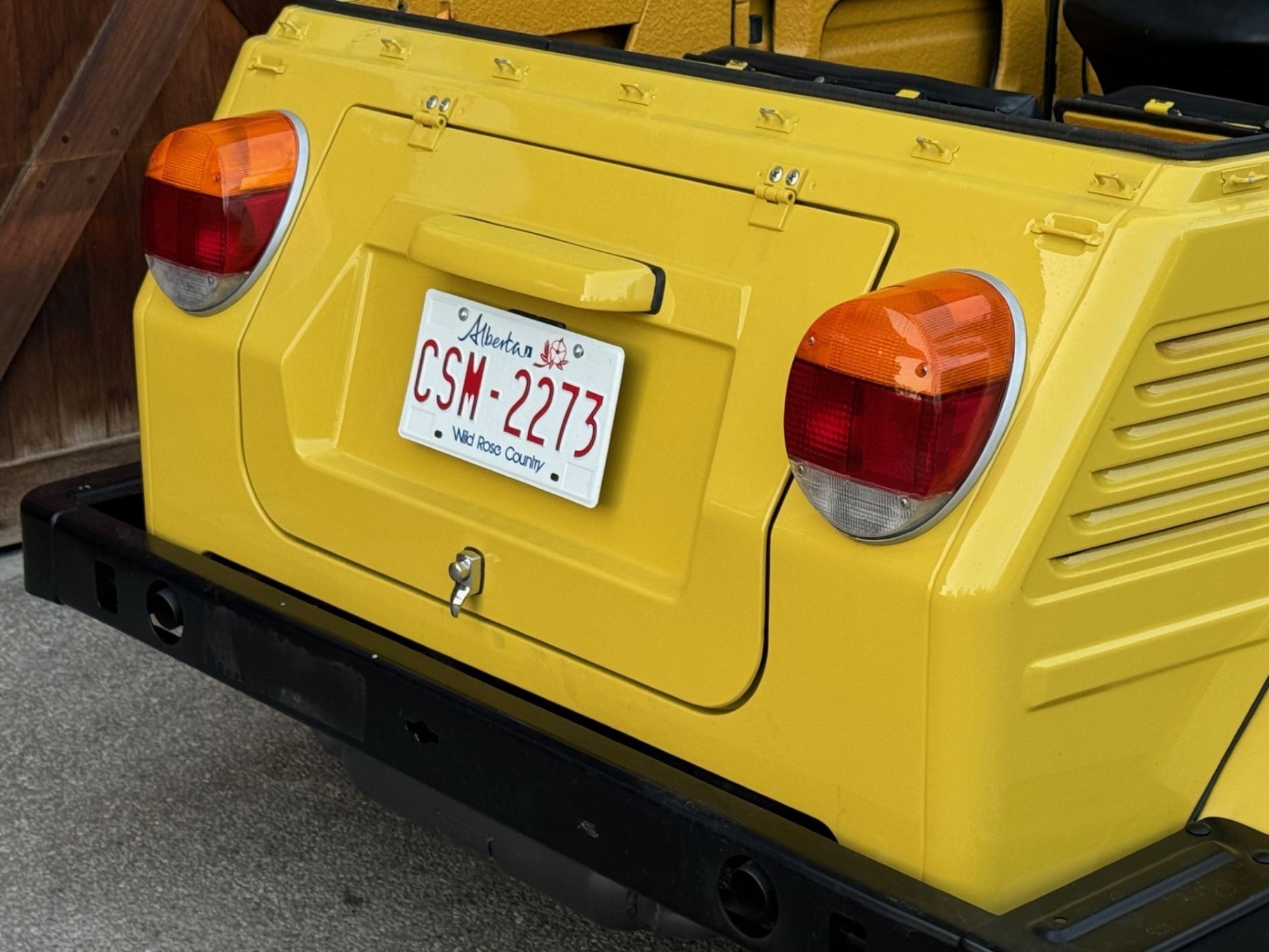 1973 Volkswagen Thing is powered by a 1.6-liter flat-four paired with a four-speed manual transaxle and is finished in yellow over black leatherette. A refurbishment is said to have been completed in 2020, and work included refinishing the exterior and the installation of a lowered suspension, 15? BRM Speedwell wheels, and a Tri-Mil exhaust. The car is also equipped with a removable hardtop, a heater, removable doors, and folding rear seats