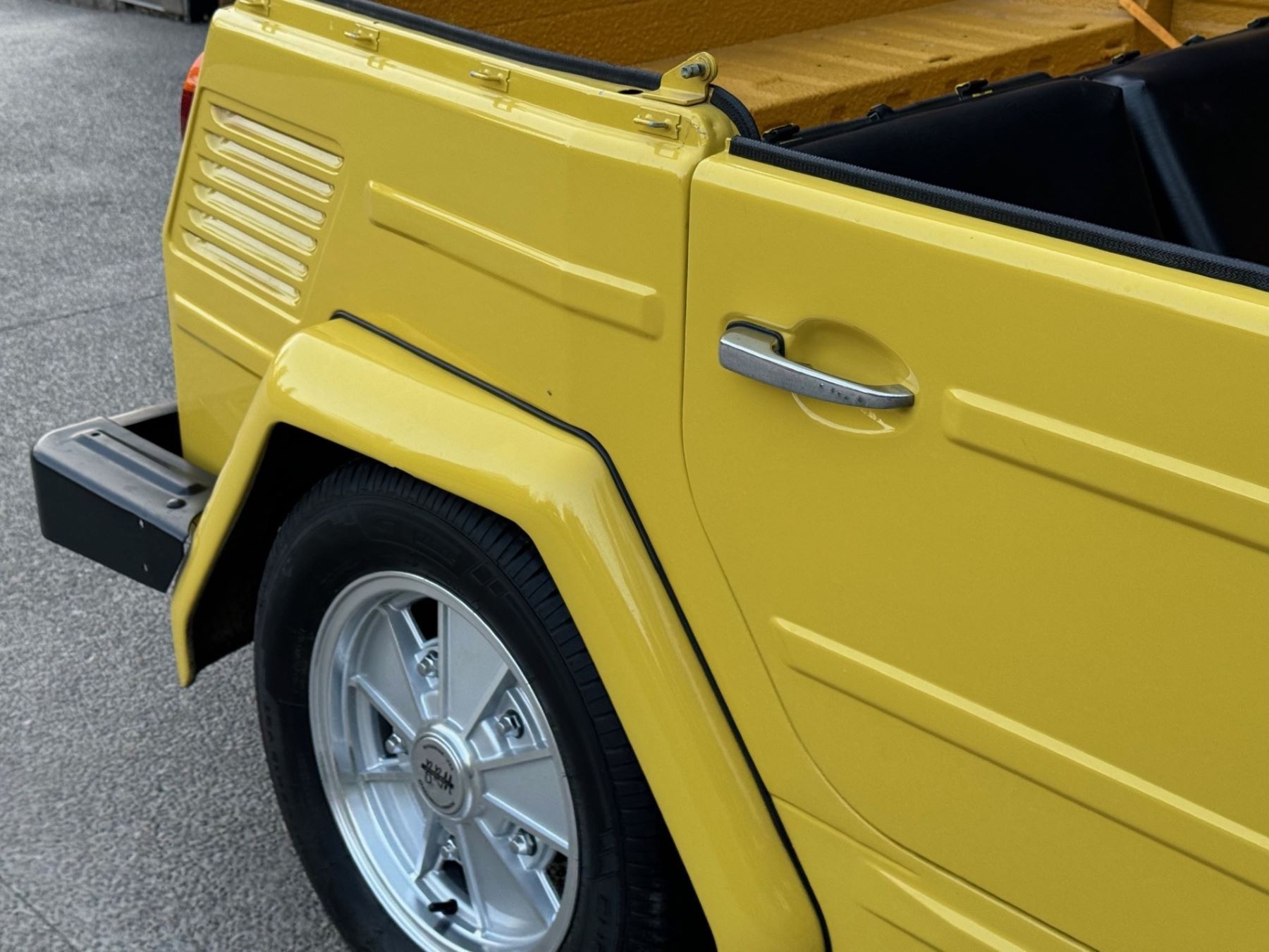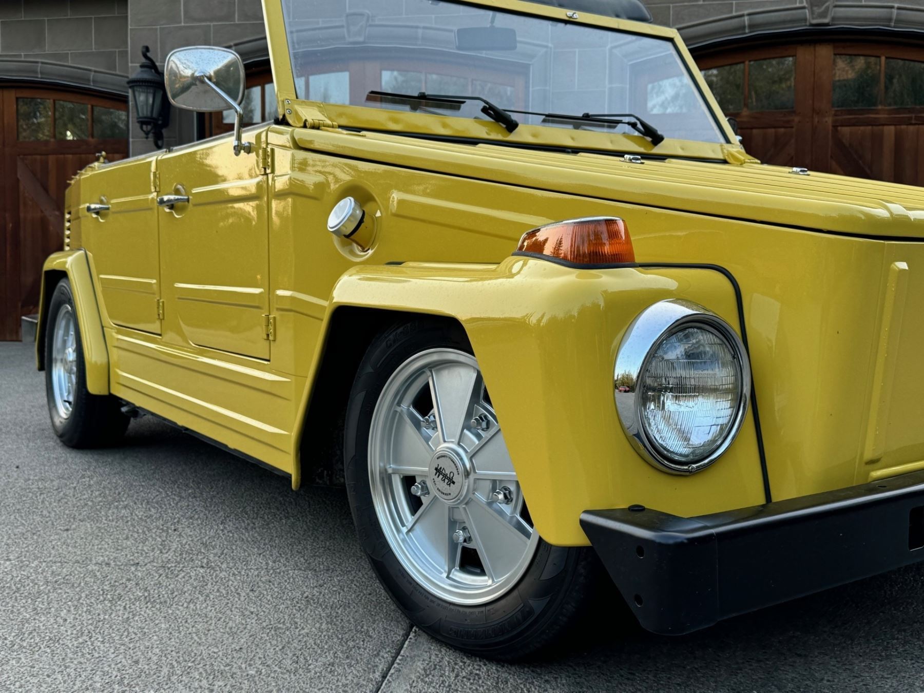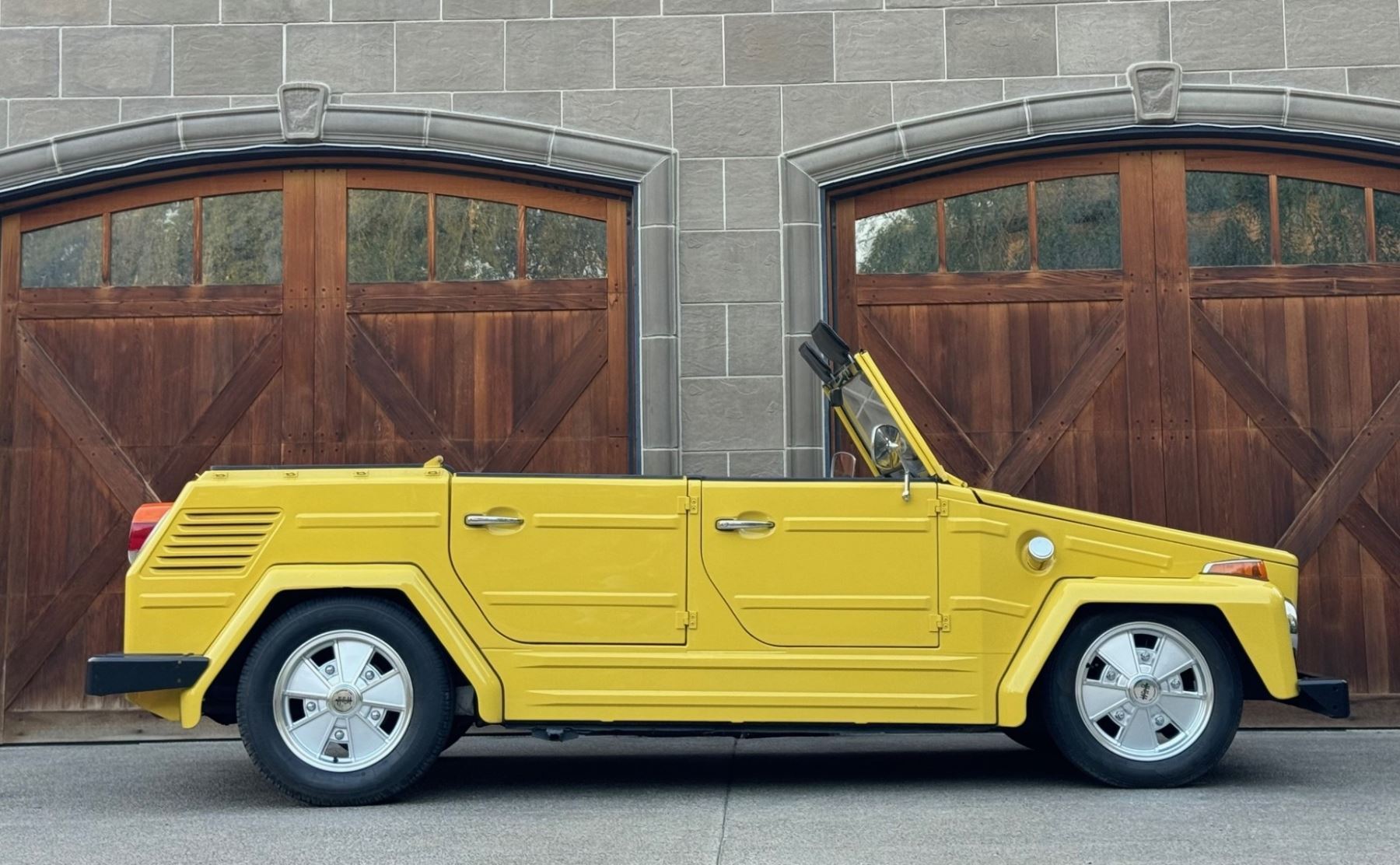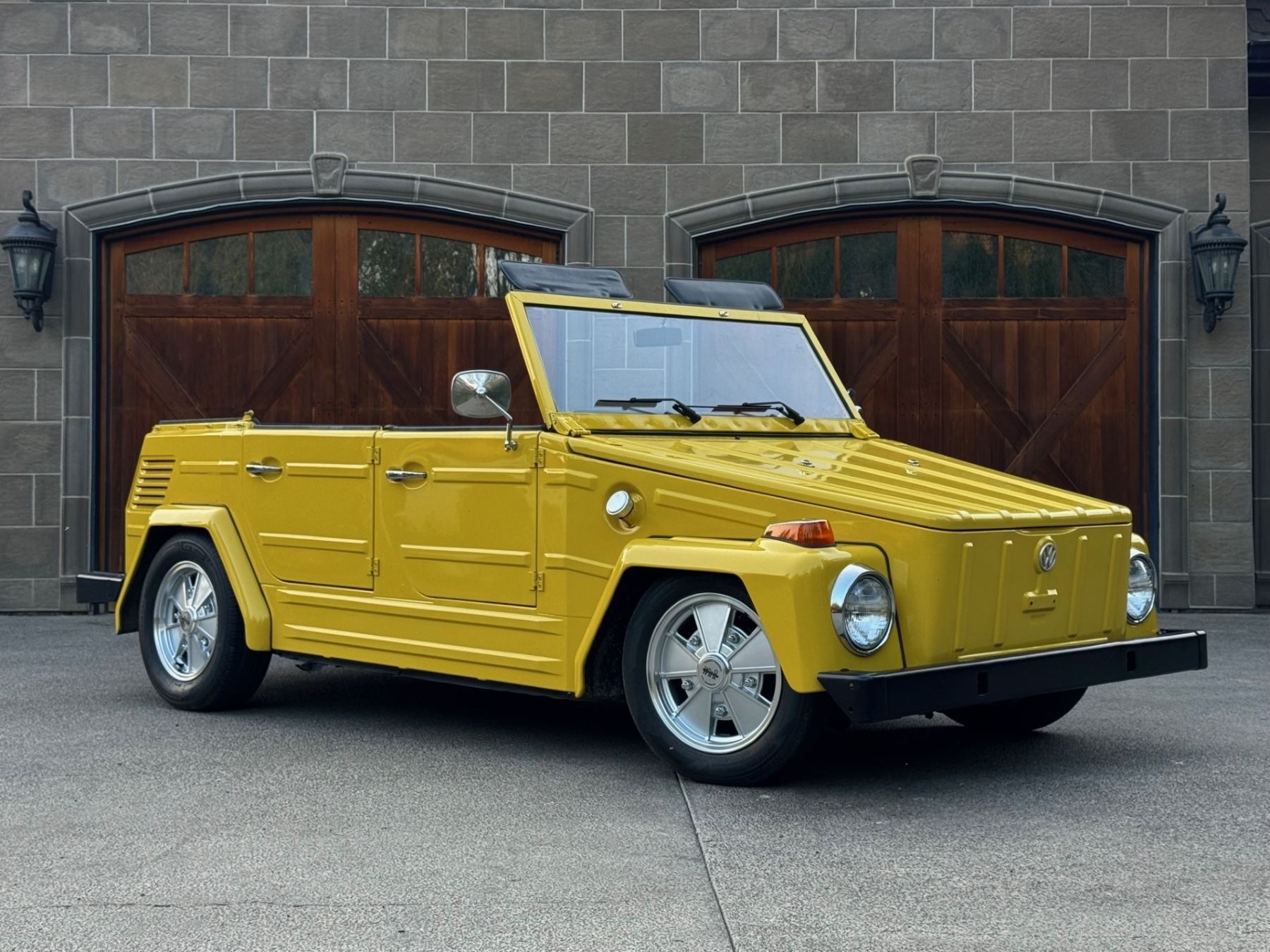 1973 Volkswagen Thing is powered by a 1.6-liter flat-four paired with a four-speed manual transaxle and is finished in yellow over black leatherette. A refurbishment is said to have been completed in 2020, and work included refinishing the exterior and the installation of a lowered suspension, 15? BRM Speedwell wheels, and a Tri-Mil exhaust. The car is also equipped with a removable hardtop, a heater, removable doors, and folding rear seats