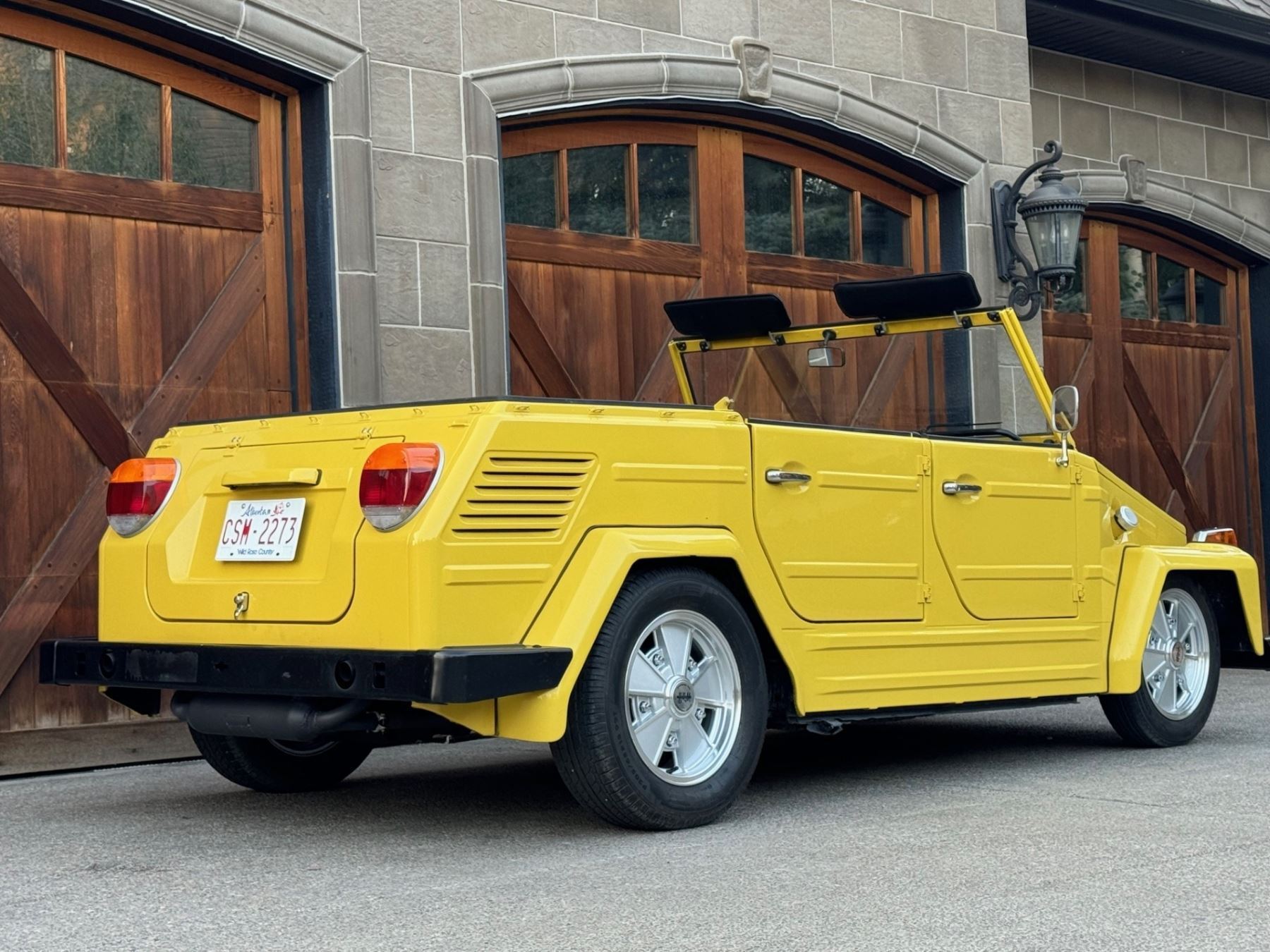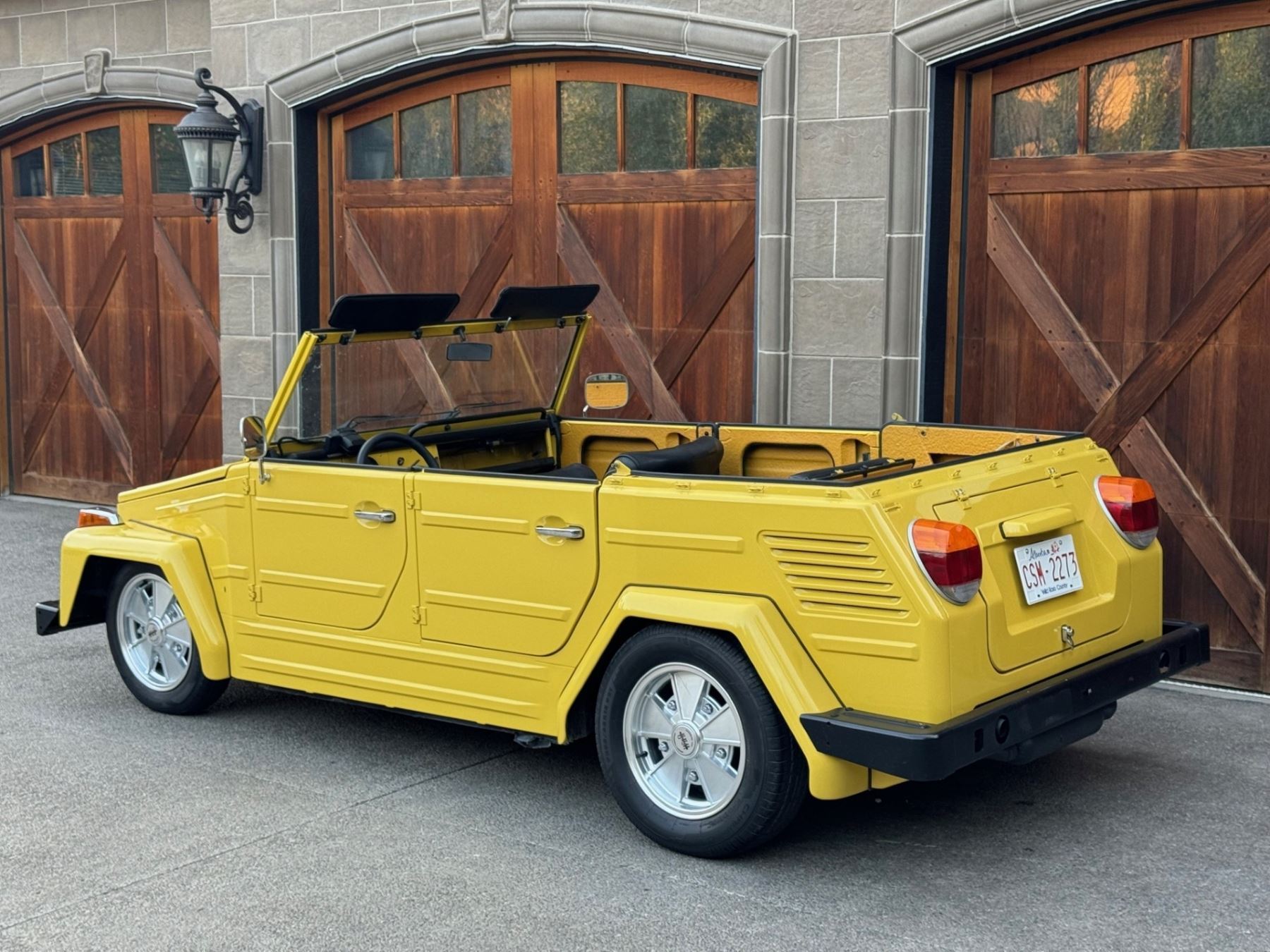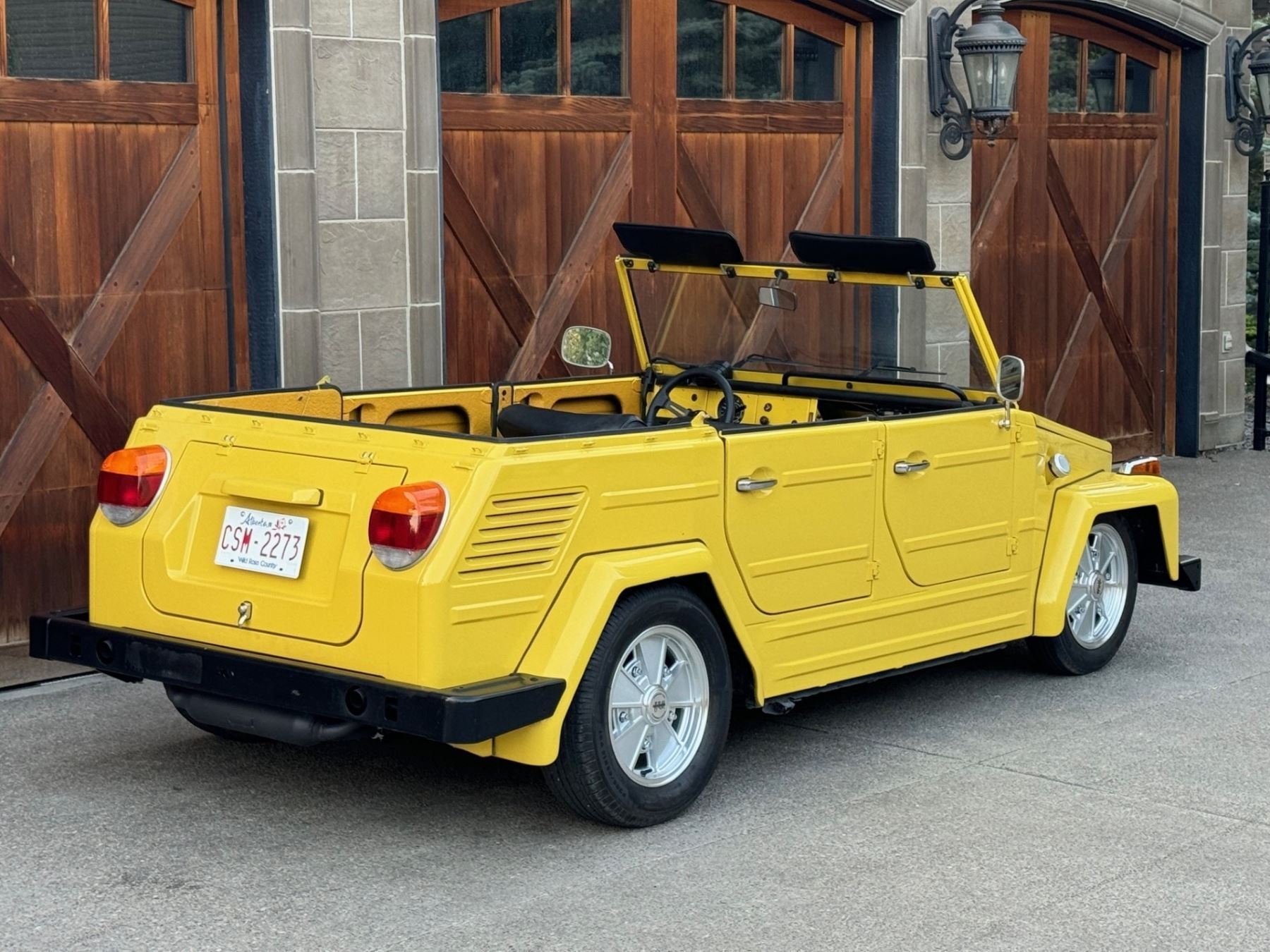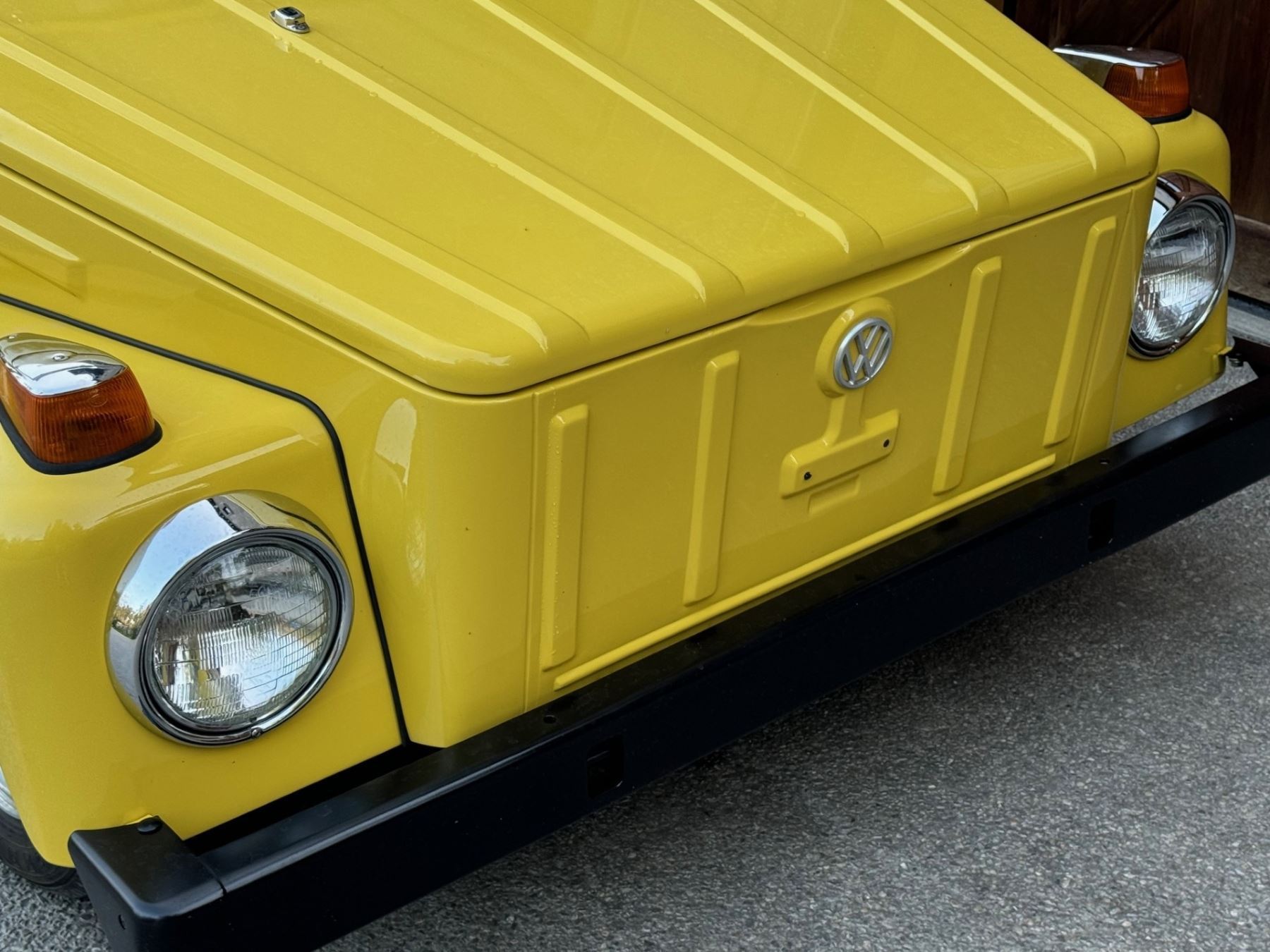 1973 Volkswagen Thing is powered by a 1.6-liter flat-four paired with a four-speed manual transaxle and is finished in yellow over black leatherette. A refurbishment is said to have been completed in 2020, and work included refinishing the exterior and the installation of a lowered suspension, 15? BRM Speedwell wheels, and a Tri-Mil exhaust. The car is also equipped with a removable hardtop, a heater, removable doors, and folding rear seats