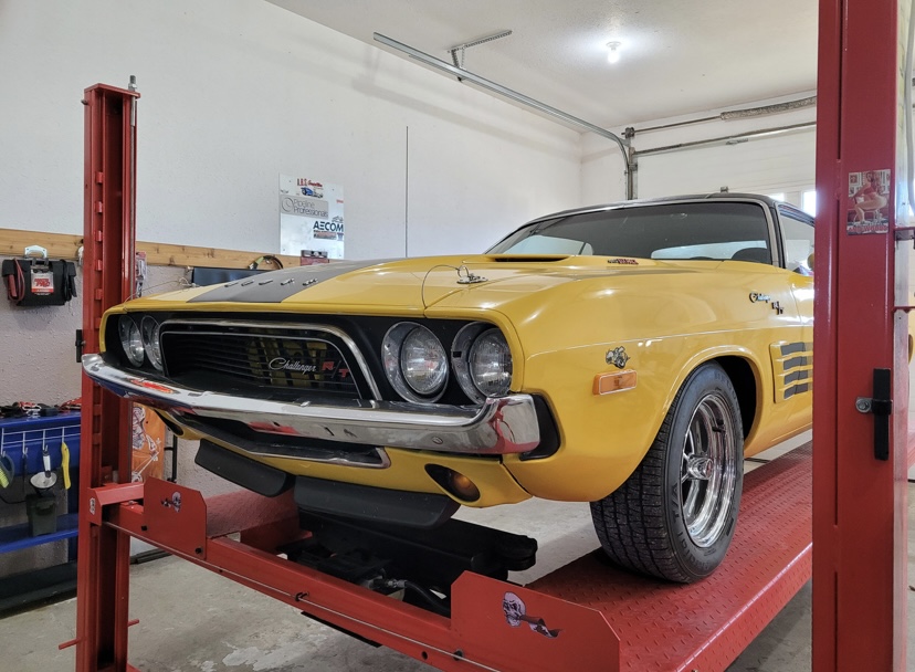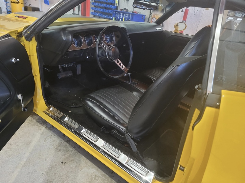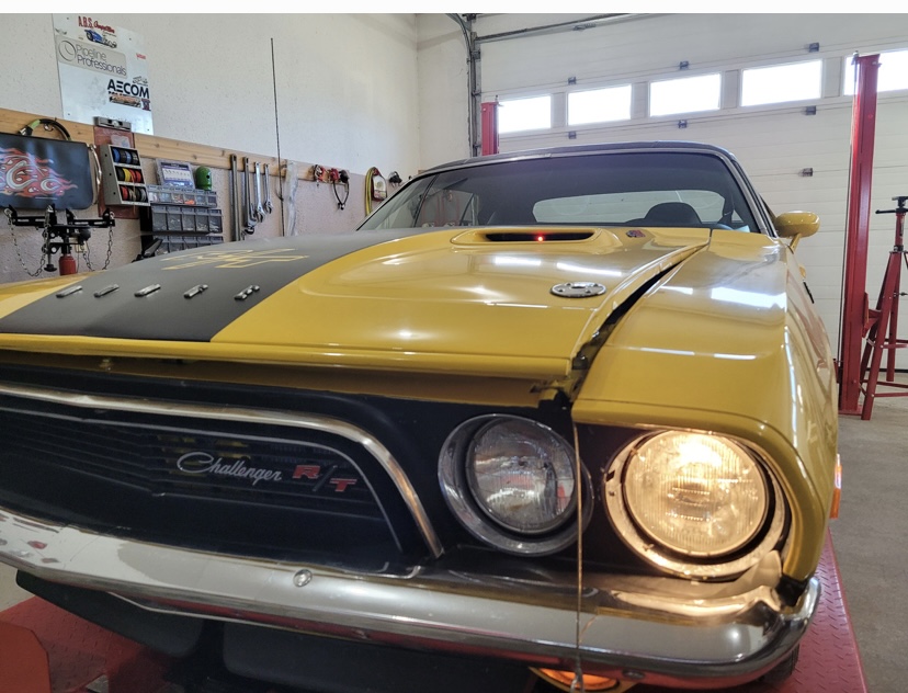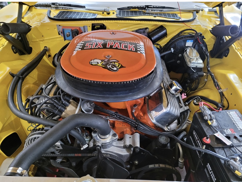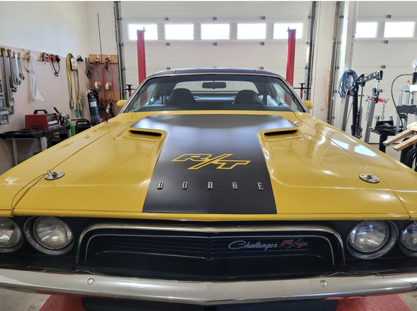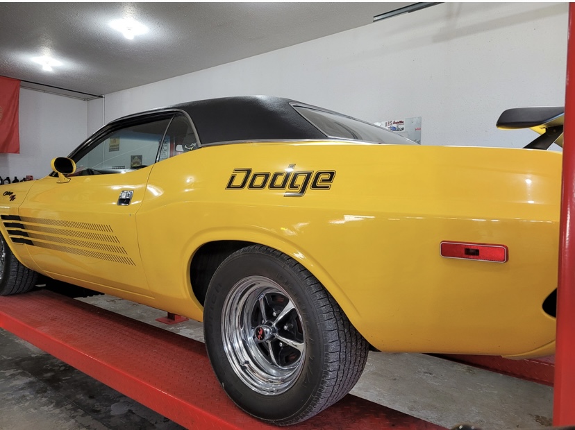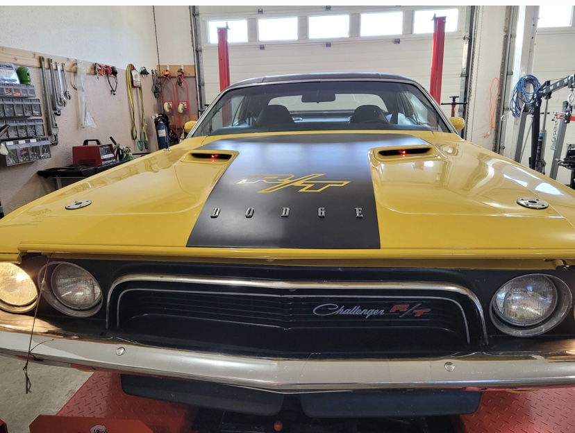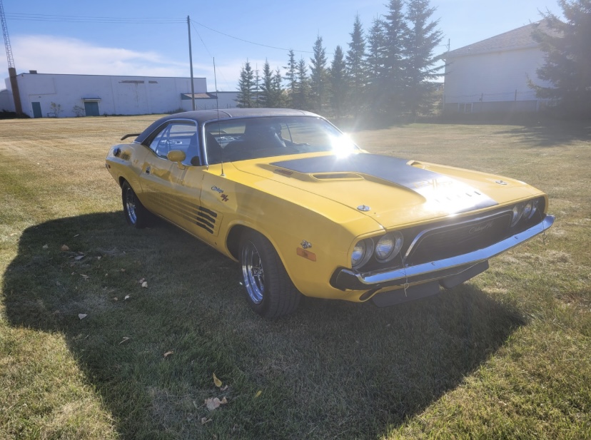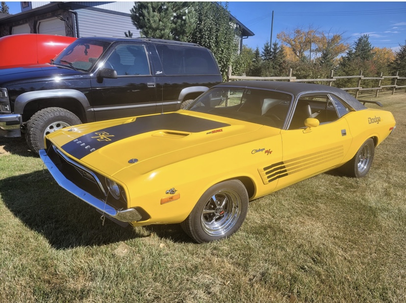 1974 Dodge Challenger. Yellow with Black interior. 440 Magnum Six Pack, Rear Air Suspension, Upgraded Speakers / Stereo, Less than 12,000 miles since restoration, Top in Perfect Shape. Cloned to a 1970 Challenger with the Decals, Bumpers, Go-wing, Shaker Hood with Pins. 1970 HP Block - Very strong.