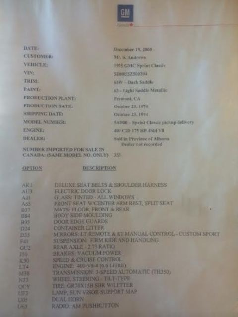 This is a rare 1975 GMC sprint classic with the factory deluxe package. One owner all documents & professionally restored. Under the hood she boasts the numbers matching 175 hp 400 cid small block V8 with a new 4bbl edelbrock carburettor.