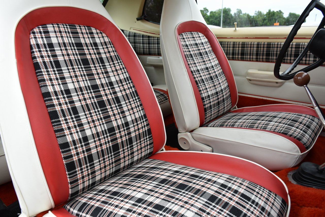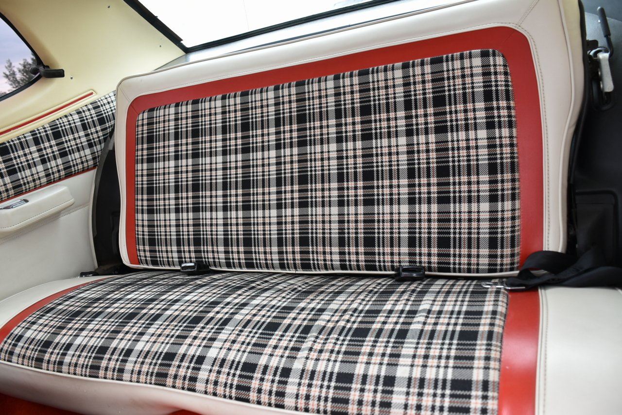This car has a rare factory interior option with the red and white upholstery, carpet floors and a exhilarating 4 speed shifter between the bucket seats.