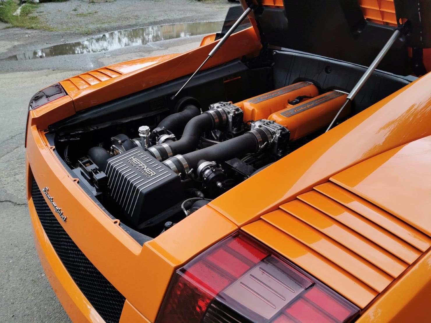 The Heffner turbo charged Gallardo is about 650HP to the rear wheels and around 750 at the crank while still maintaining the factory reliability! Even with the increase on power the car doesn't lose any drivability and can still be used for trips to the grocery store or for a cruise around town, all you have to do is turn the key and this beast roars to life!