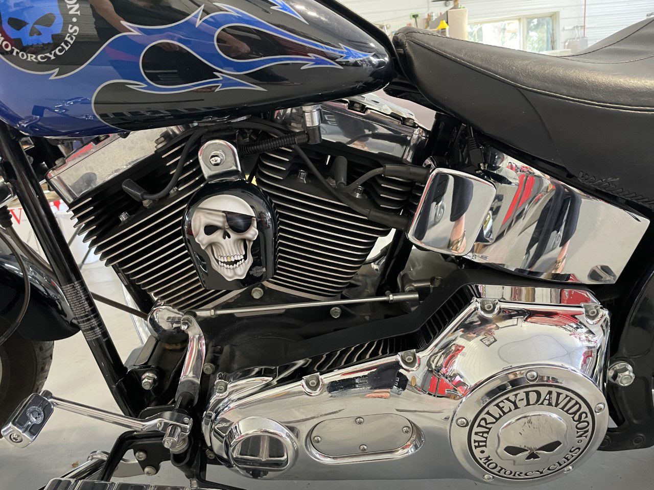 2005, 10TH ANNIVERSARY LIMITED EDITION FATBOY NUMBERED 141/200. 1690CC SCREAMING EAGAL, TWIN CAM 103 V-TWIN, 2 CYLINDER, 5 SPEED. 15,584 KMS, CUSTOM PAINT, BLACK WITH BLUE FLAMES. BLACK LEATHER SEATS. CUSTOM WHEELS, RAISED CHROME HANDLEBARS, LOTS OF CHROME AS WELL AS NUMEROUS SKULLS. THIS BIKE HAS HARDLEY BEEN RIDDEN AND HAS BEEN KEPT IN THE SHOP SINCE PURCHASE.