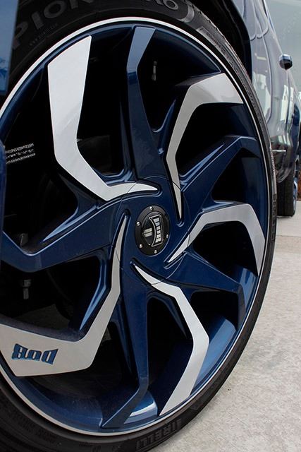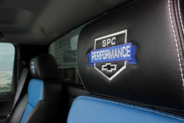 With over $35,000 in accessories, this low slung short box has been transformed into a sports truck enthusiasts dream. Dropped with a McGaughy’s Suspension 4/7” lowering kit, and sitting on Pirelli Asimmetrico tires with custom painted DUB Sleeper 24” wheels, the Blue Devil is sure to stand out in a crowd! The exterior has been infused with custom vinyl work, from the silver racing stripes to the color matched bowties. Inside, the cloth seats have been reupholstered with heated black and blue Katzkin leather highlighted with SPC Performance badging on the headrests.