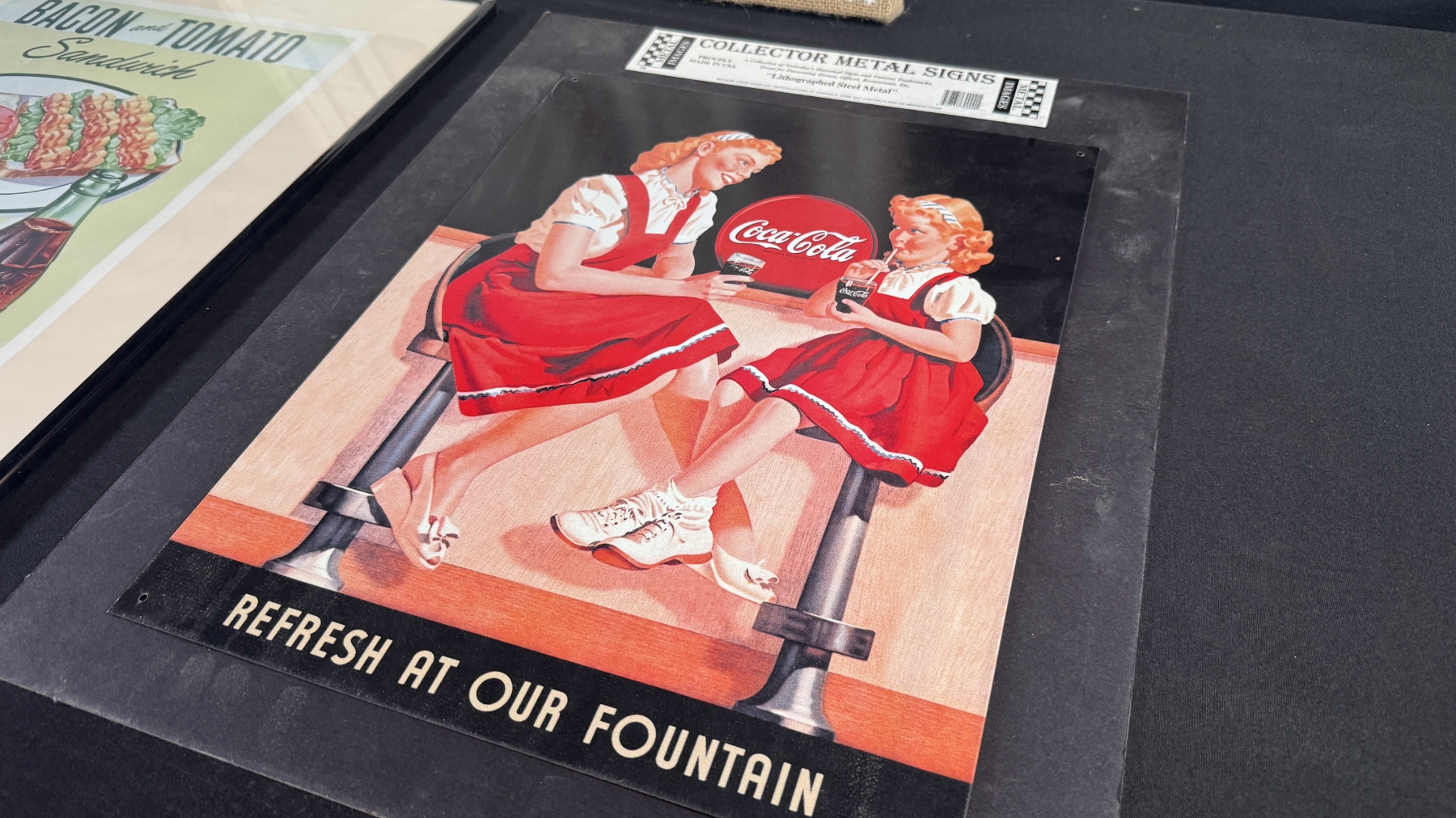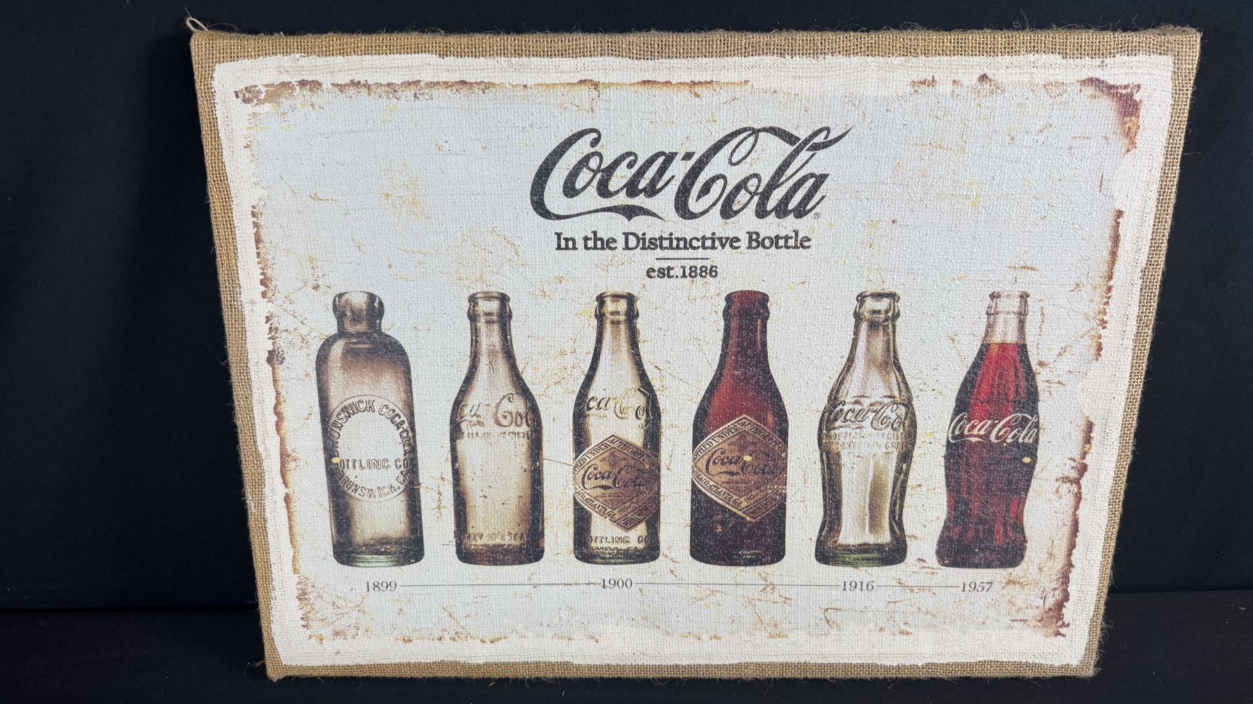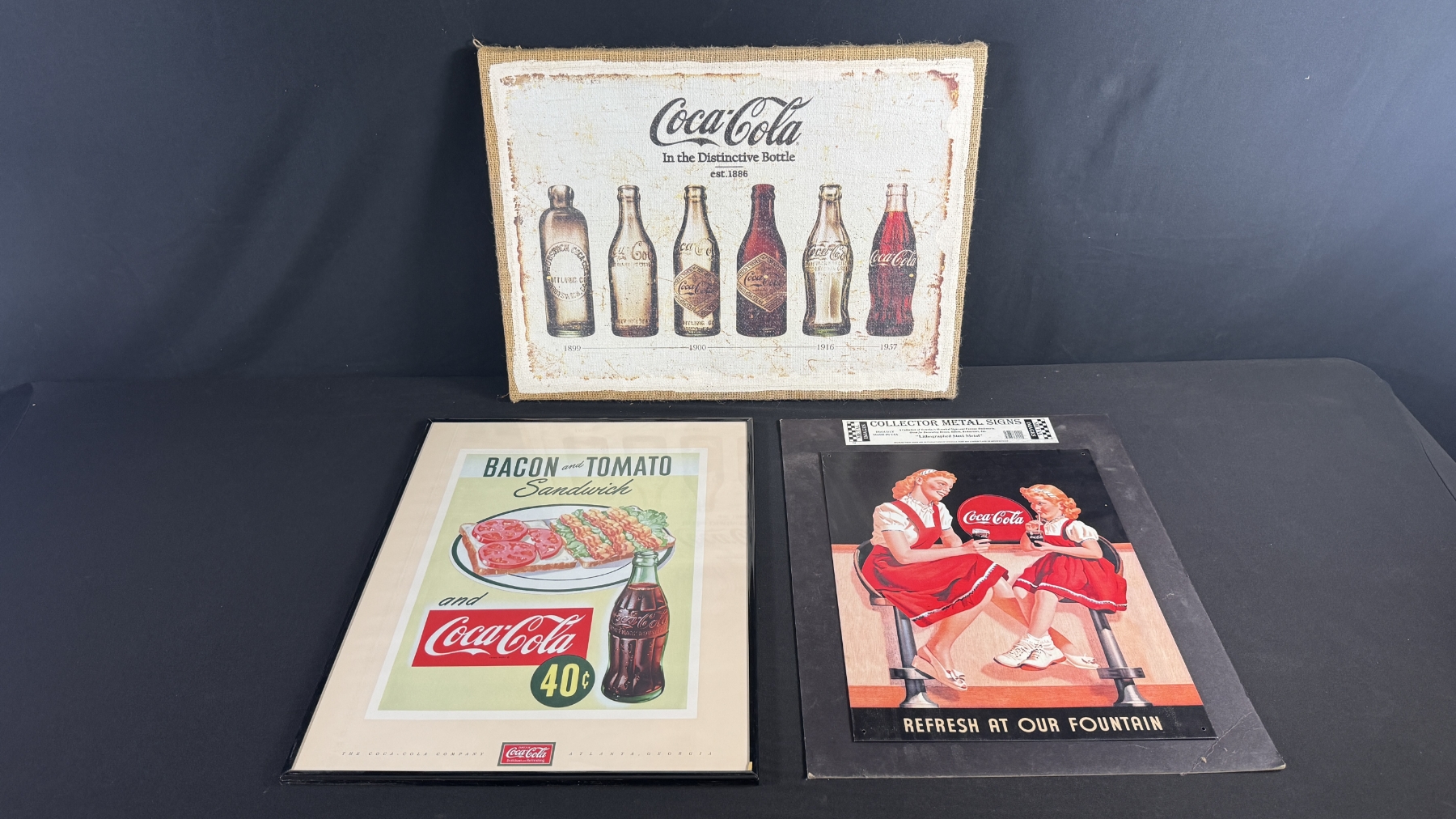 3 COCA-COLA ADVERTISING SIGNS (CANVAS, FRAMED PROMO, METAL SIGN) 23" X 16"