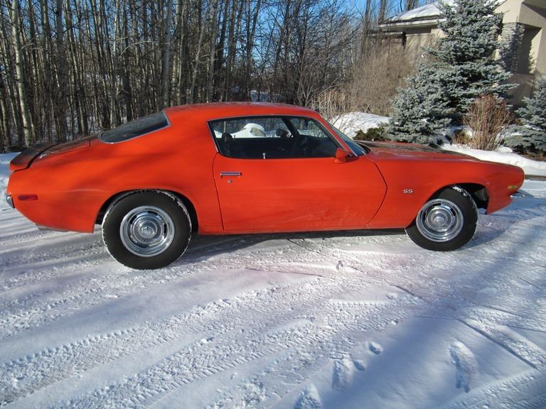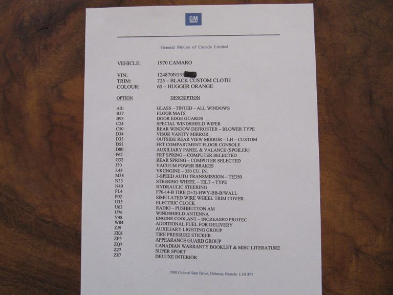 Documented Canadian 1970 Z27 Camaro SS, built in Norwood, Code 65 Hugger Orange, non numbers matching. See attached GM Canada heritage documentation. Have Protecto-Plate. Car is an original Calgary car. Frame on restoration in 2006, retains original deluxe black cloth interior in very good condition. Rare options include D34 visor vanity mirror, C50 rear defroster, N33 tilt wheel, and ZJ9 auxiliary lighting group. Factory 150 Mph speedometer. Body in good shape including floors and trunk, is in need of paint with a couple of faded spots and chips.