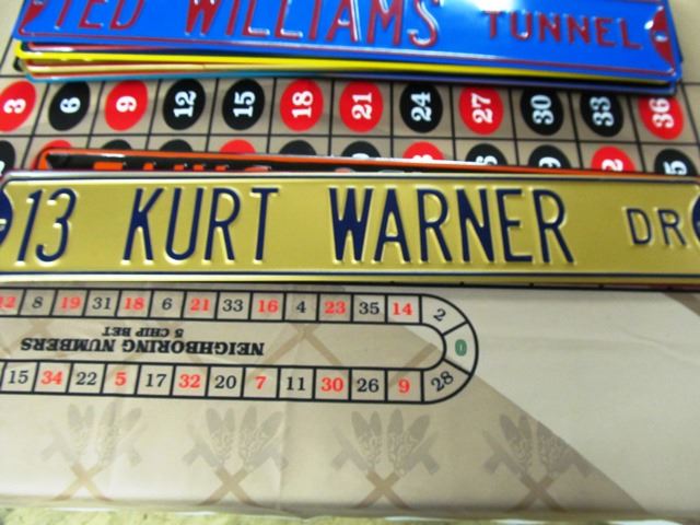 4 STEEL STREET SIGNS - TED WILLIAMS TUNNEL, 13 KURT WARNER DR, PATRICK ROY BLVD, 73 BONDS DRIVE