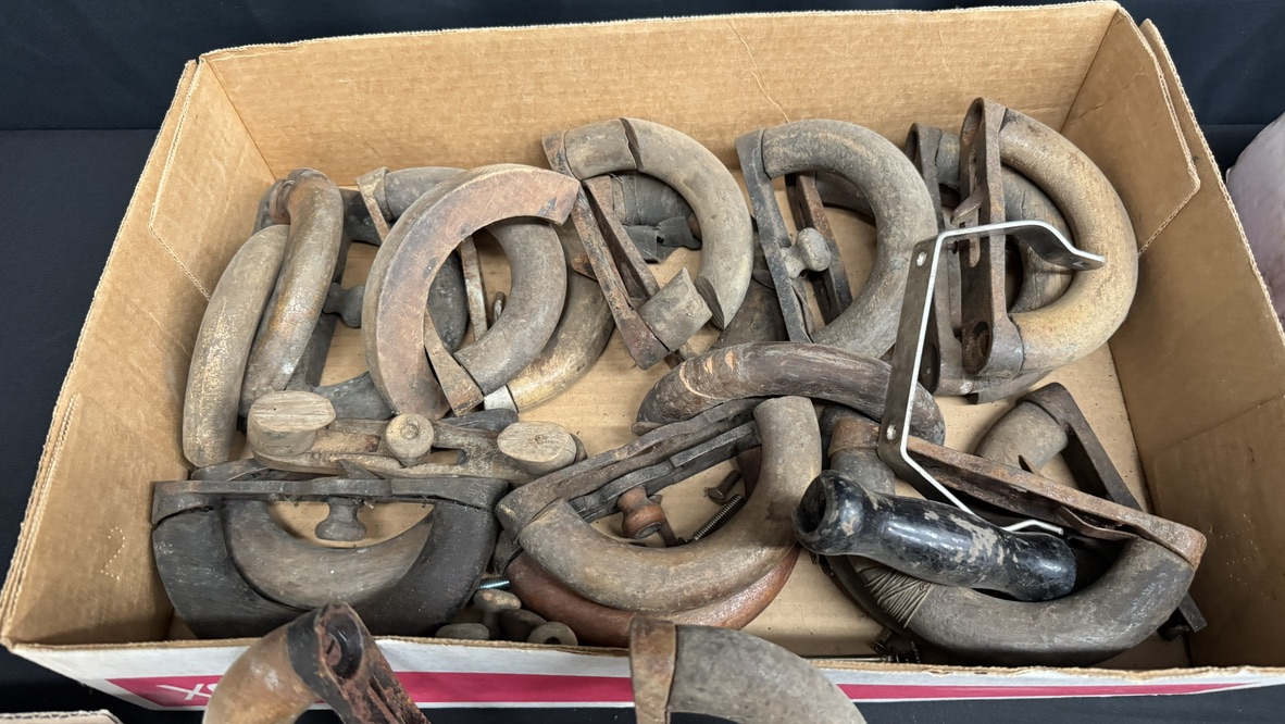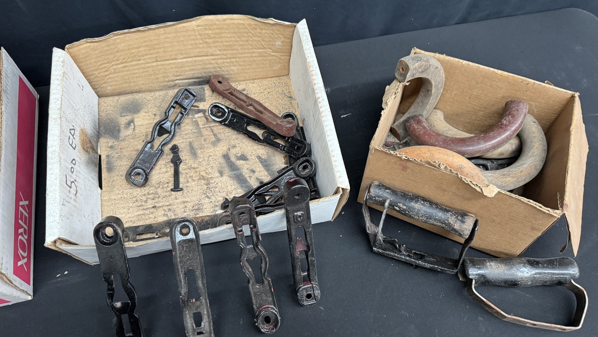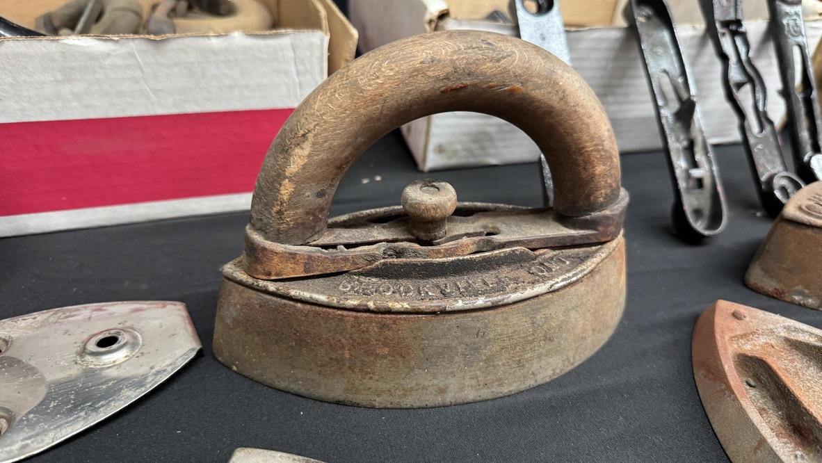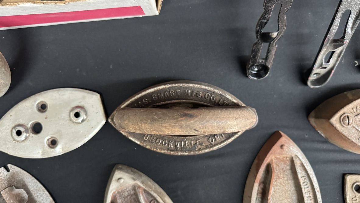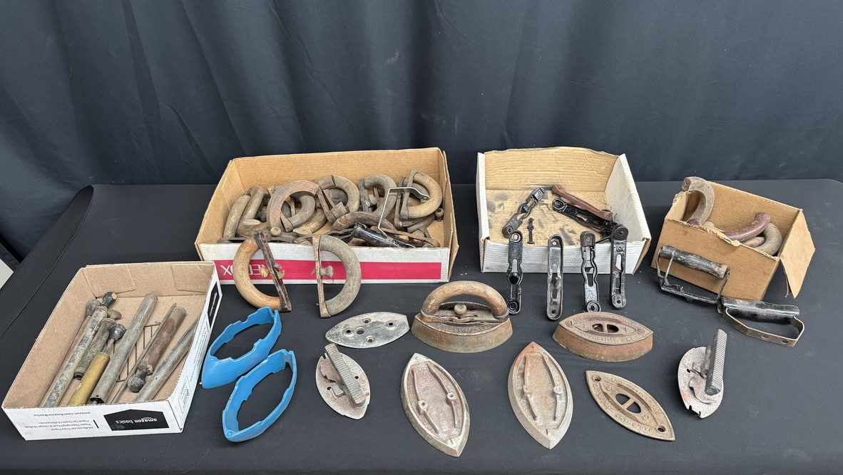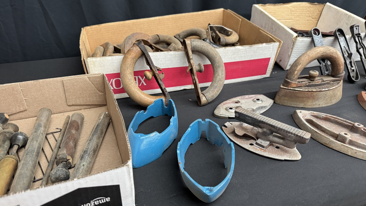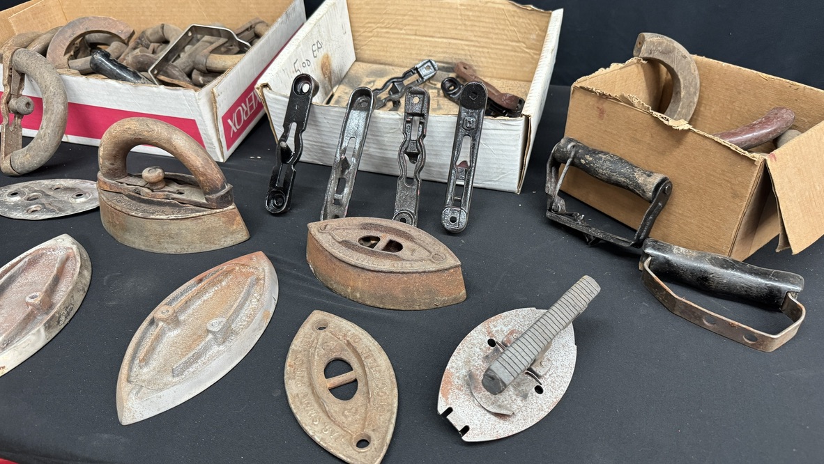 ANTIQUE CAST-IRON SAD IRONS W/ TRIVETS, HANDLES & ATTACHMENTS