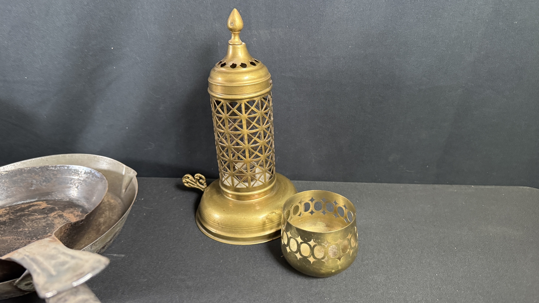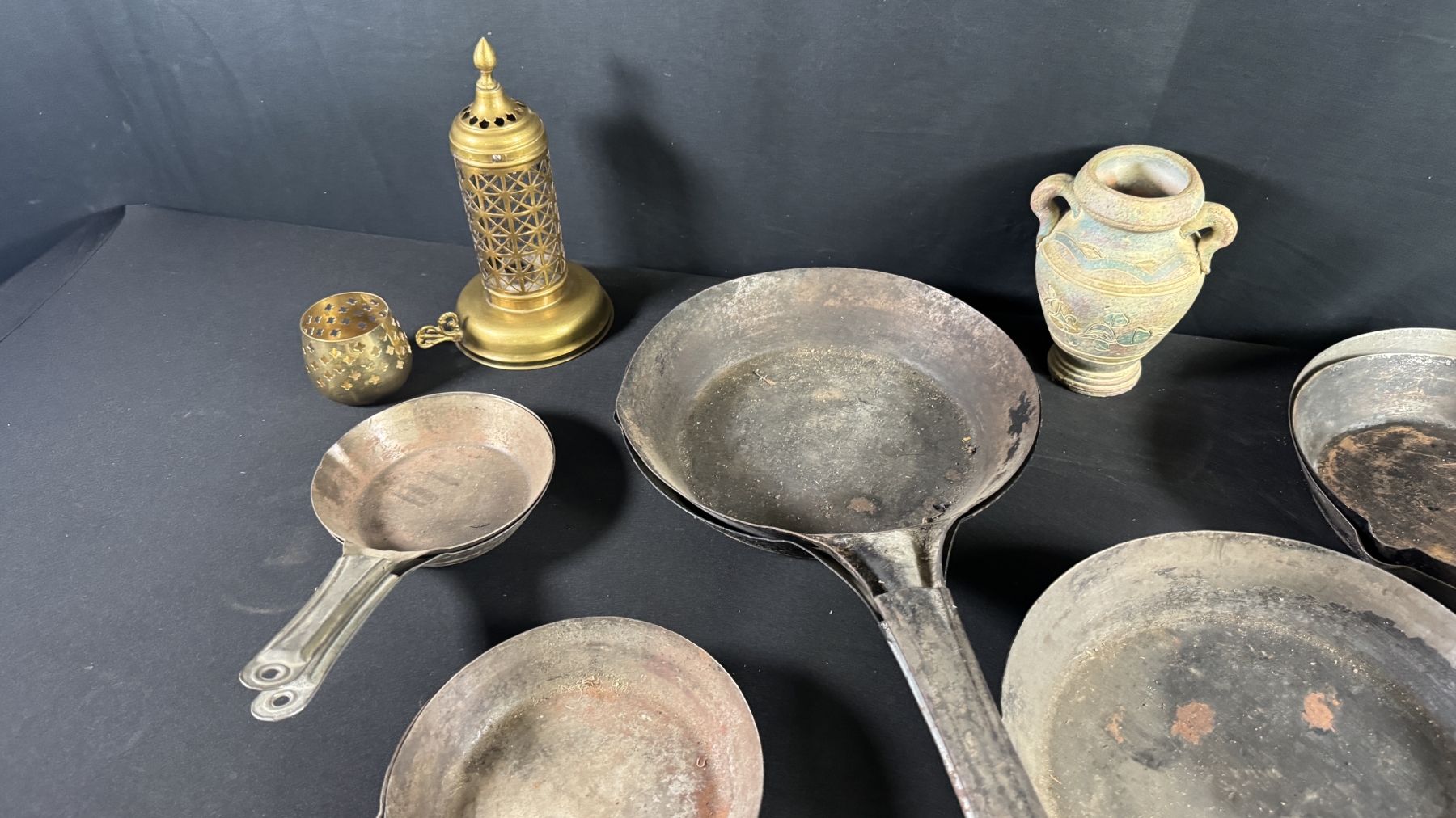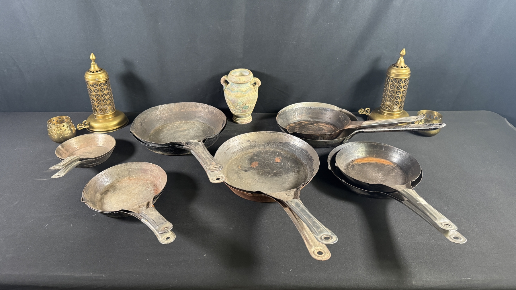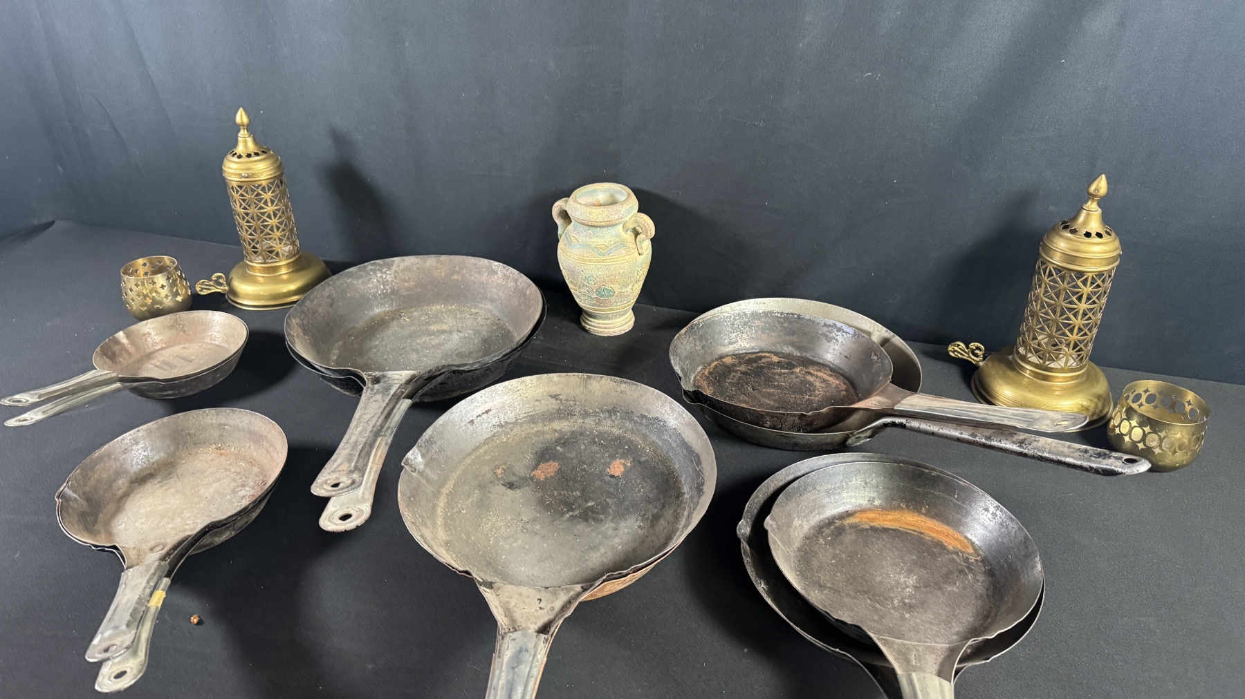 ANTIQUE PRESSED METAL FRYING PANS & BRASS DECOR