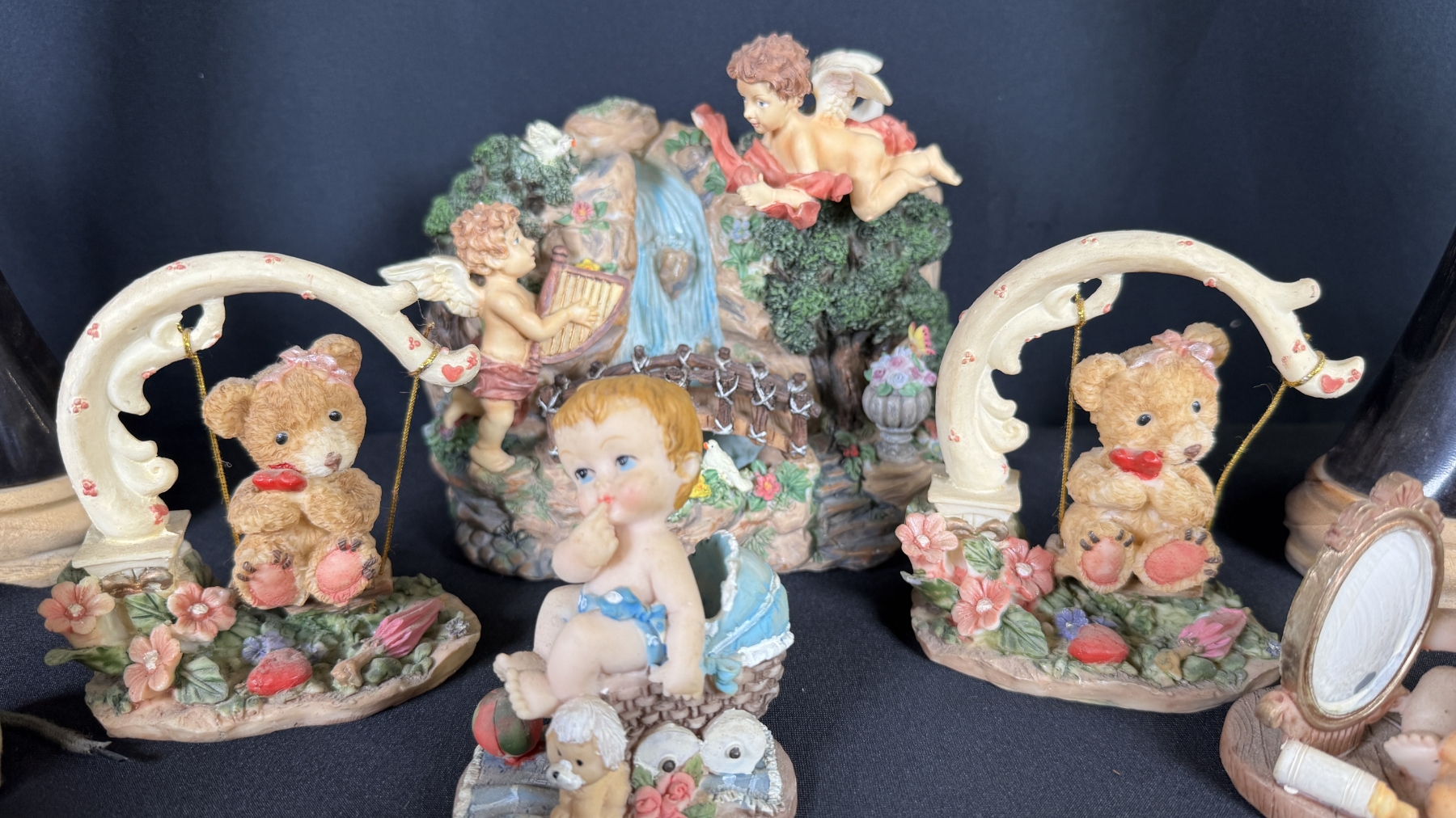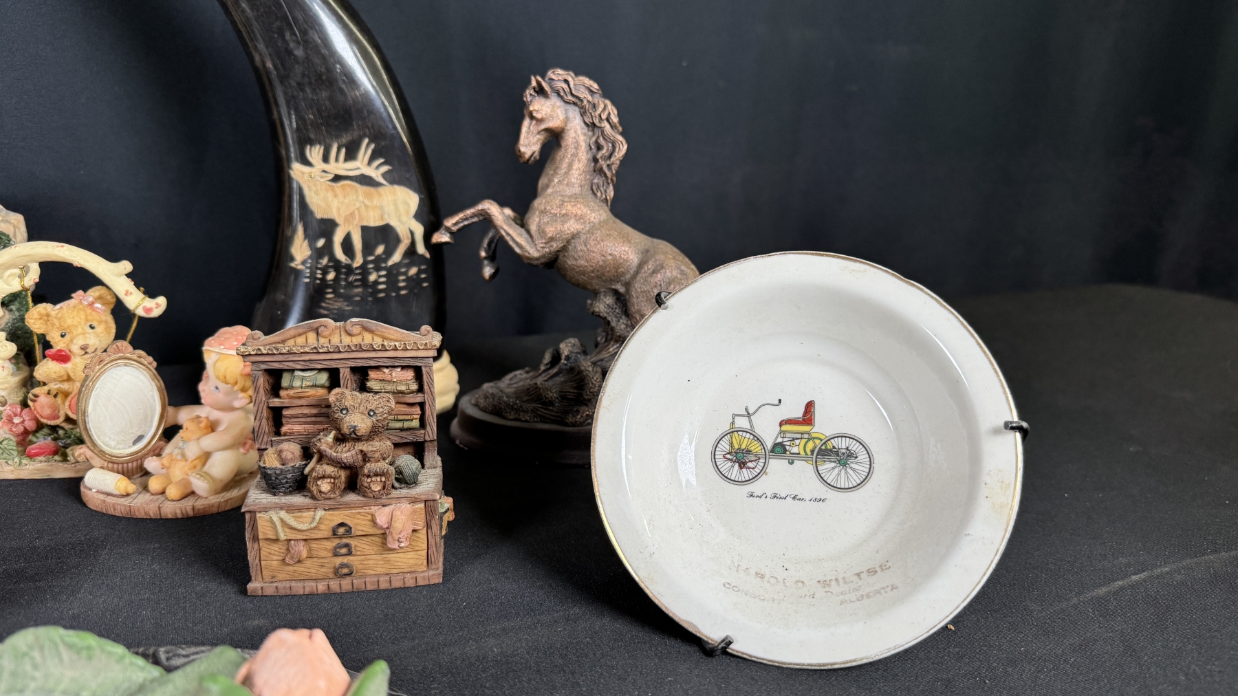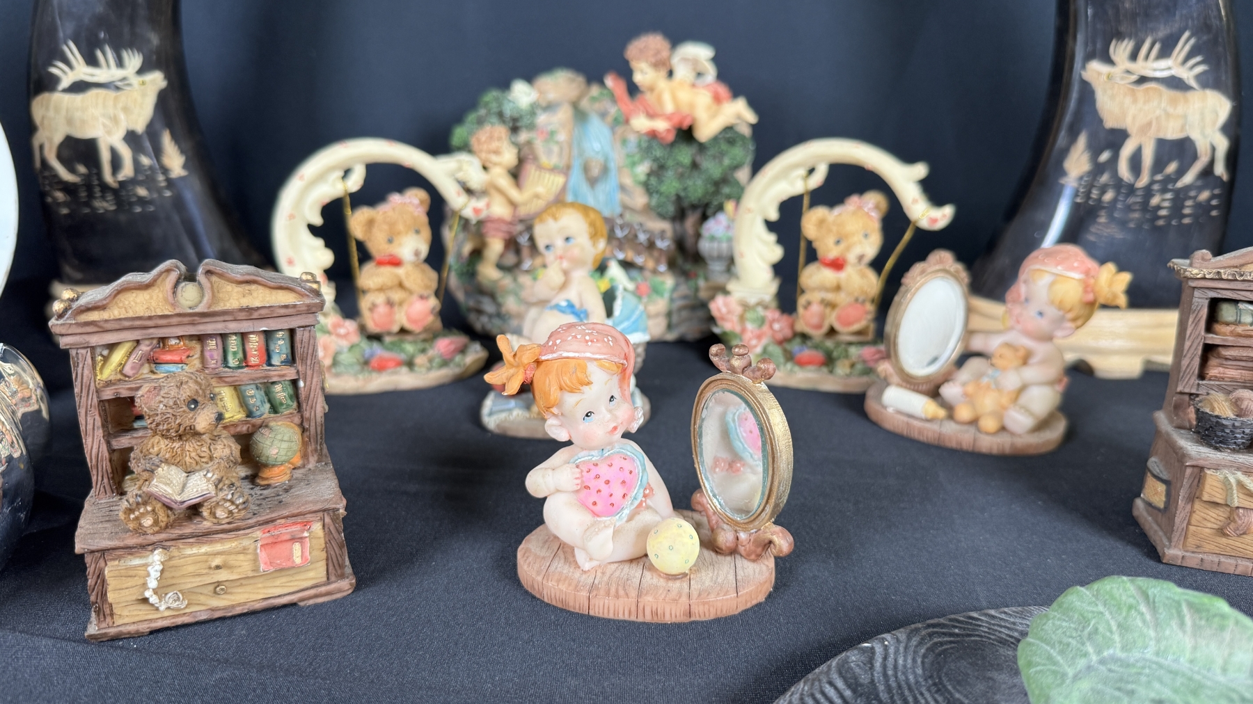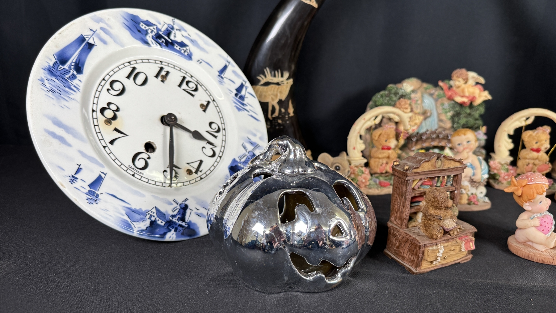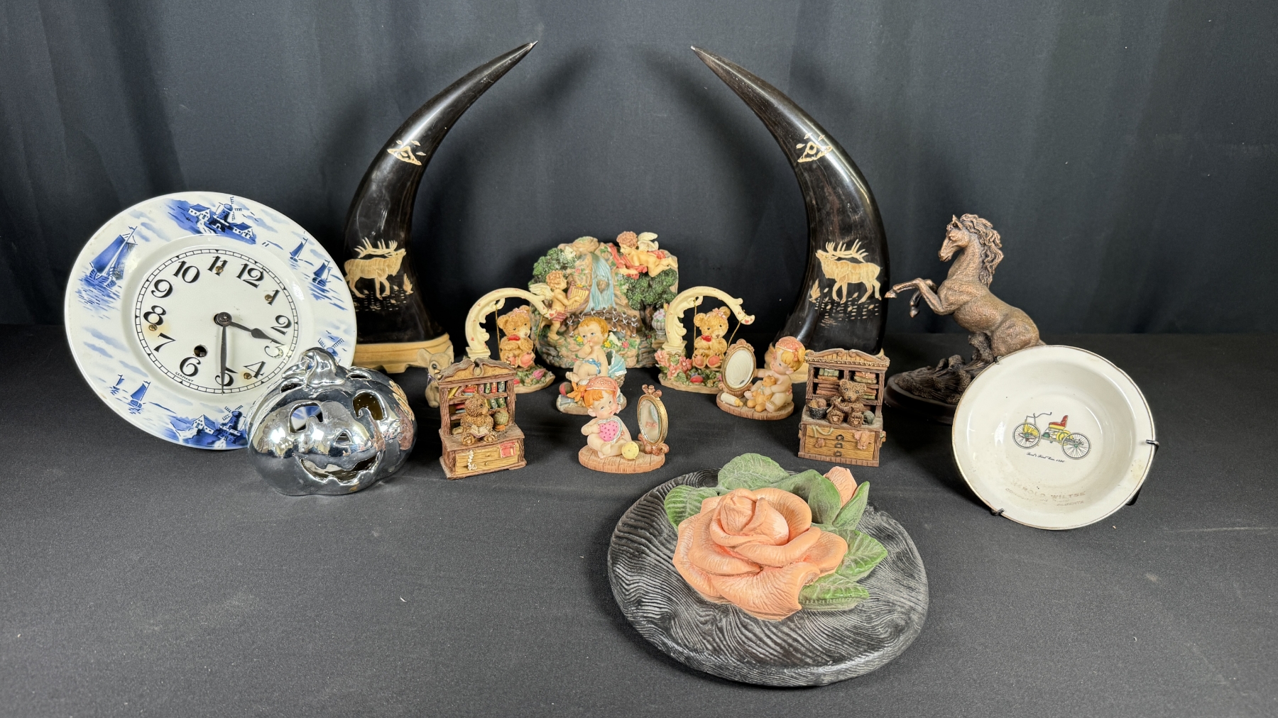 ASSORTED COLLECTIBLES (CERAMIC CLOCK, CARVED HORNS, CHERUBS)