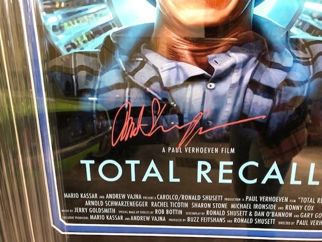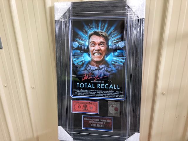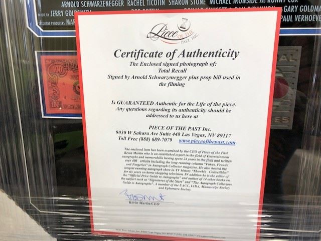 AUTOGRAPHED ARNOLD SCHWARZENEGGER TOTAL RECALL PHOTOGRAPH INCLUDING PROP BILL USED IN FILMING COMES WITH COA
