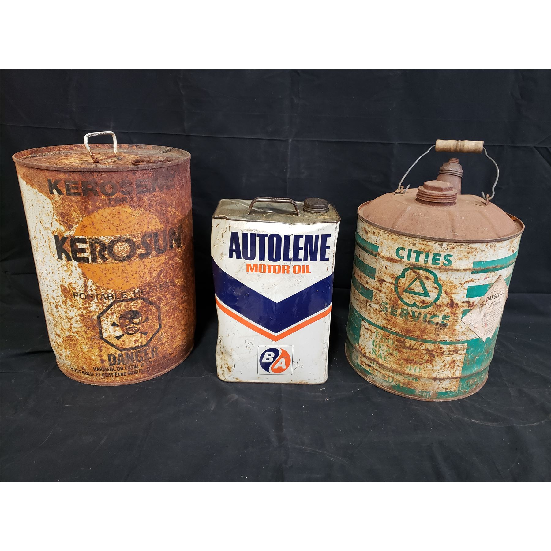 Autolene motor oil can, cities gas can and Kerosun Kerosene can
