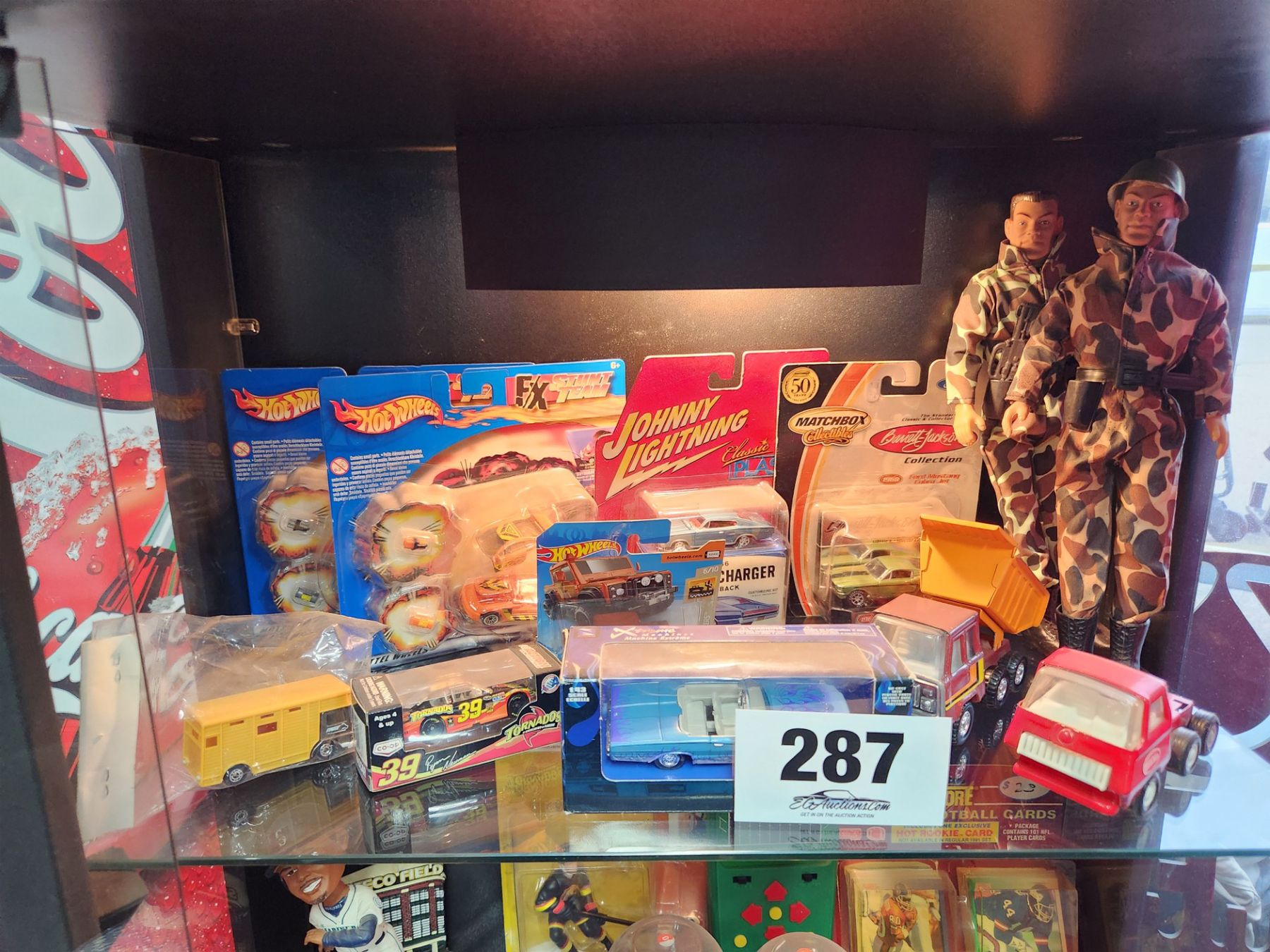 Assortment of hot wheels die cast and plastic cars and 2 GI Joe's