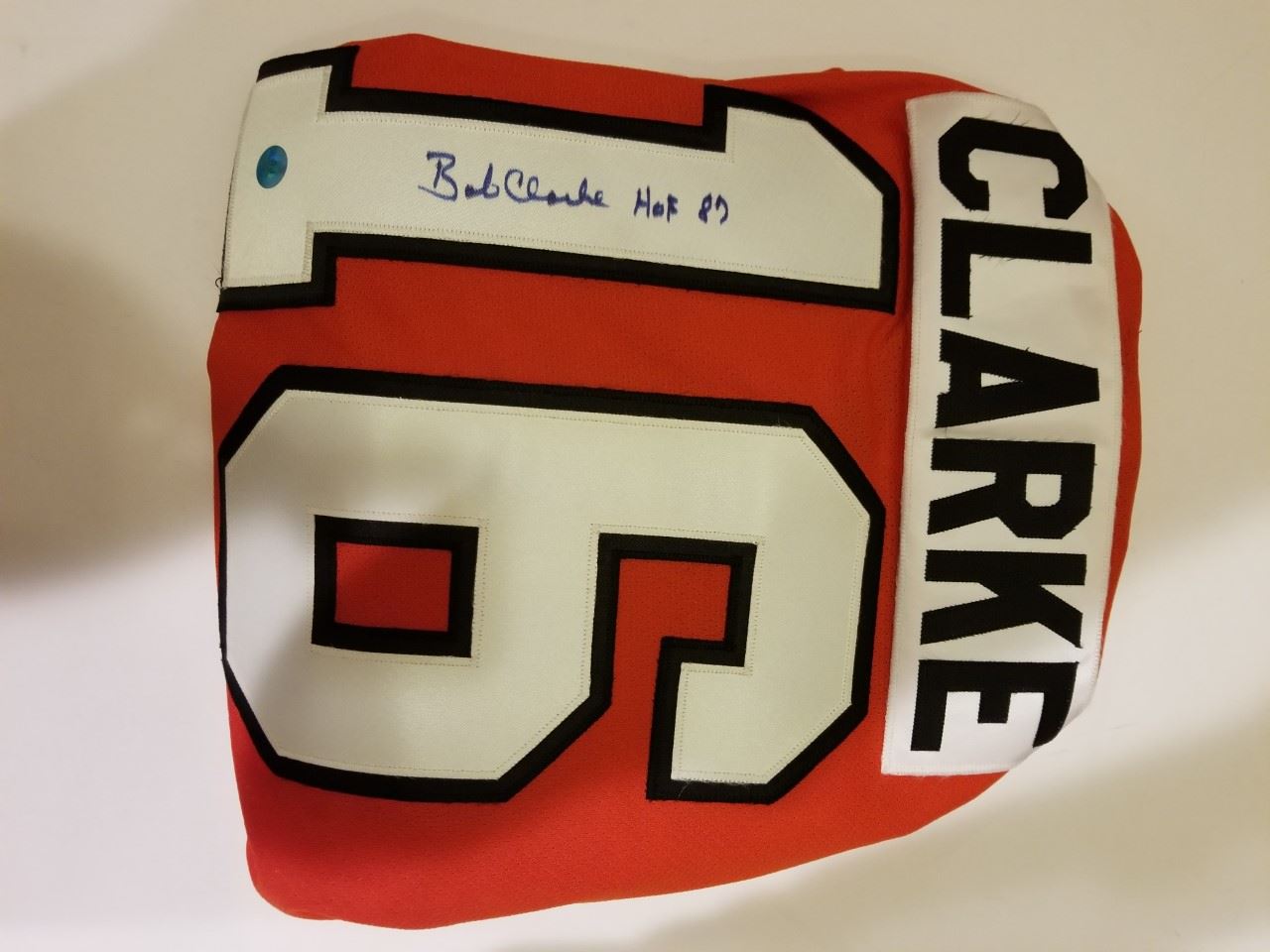 BOBBY CLARKE SIGNED PHILADELPHIA FLYERS HOCKEY JERSEY WITH HOF 87 INSCRIPTION. COA INCLUDED