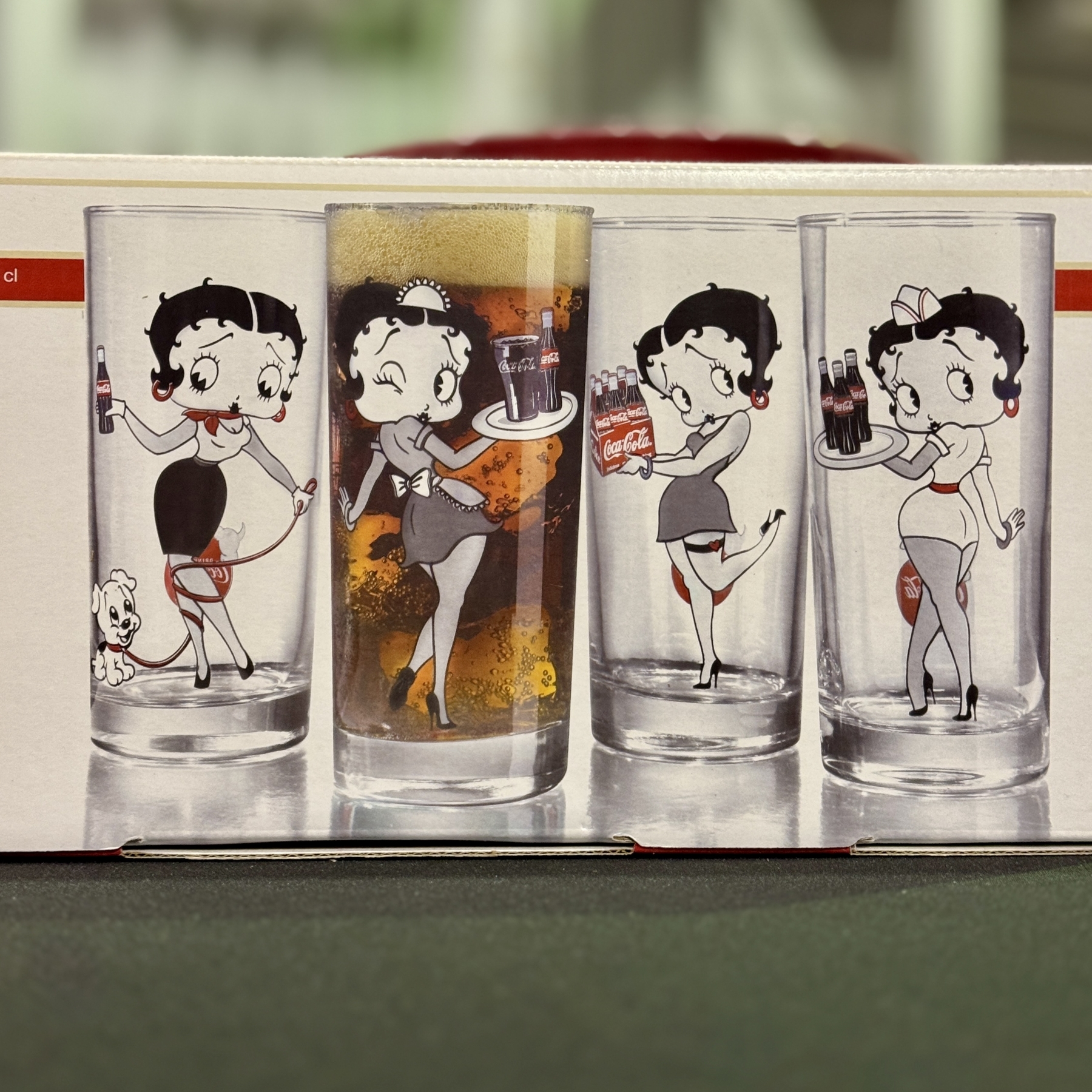 (1) Set of 4 Betty Boop Coca-Cola glasses in original box, each featuring a different Betty Boop pose and Coca-Cola logo