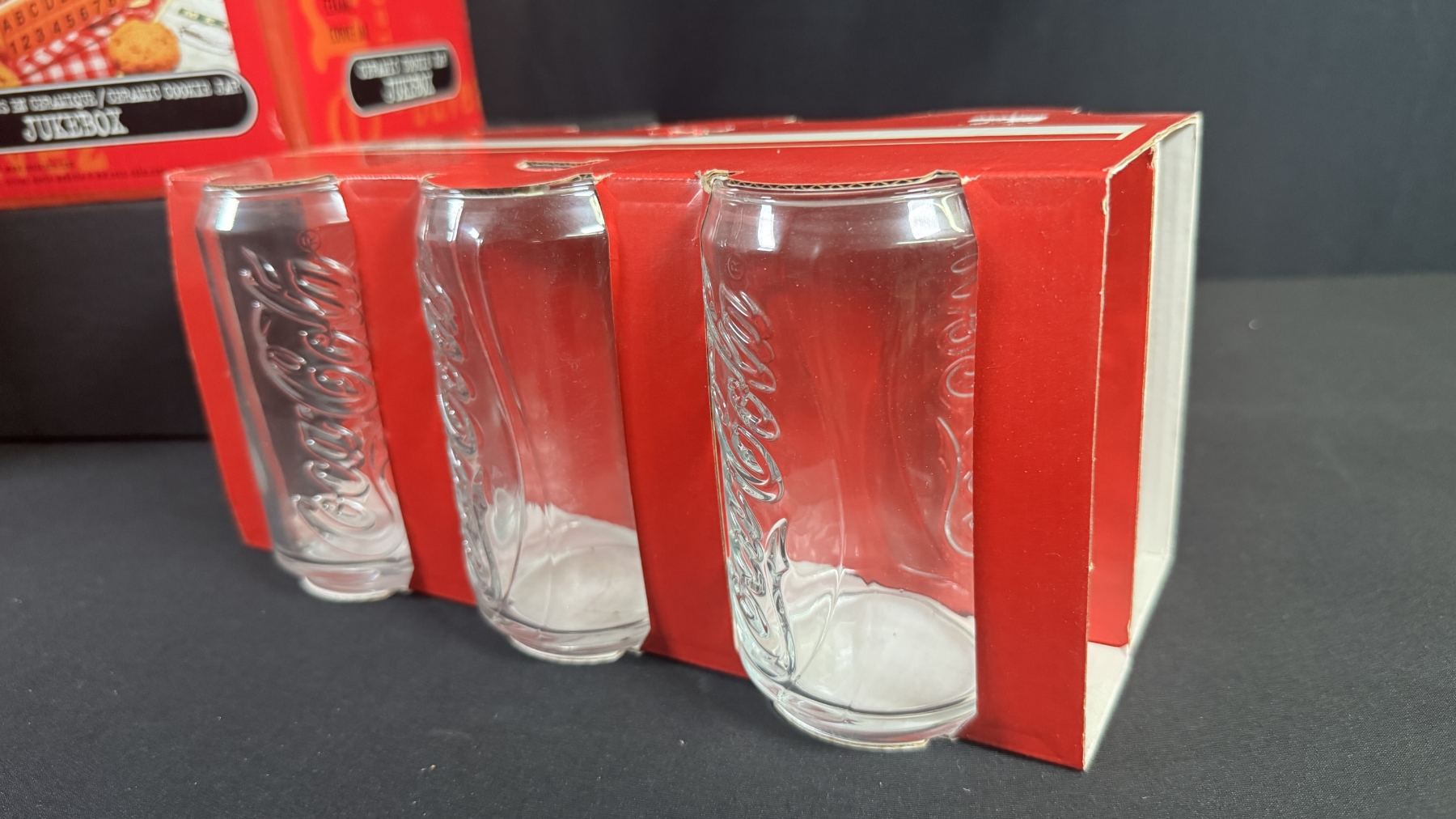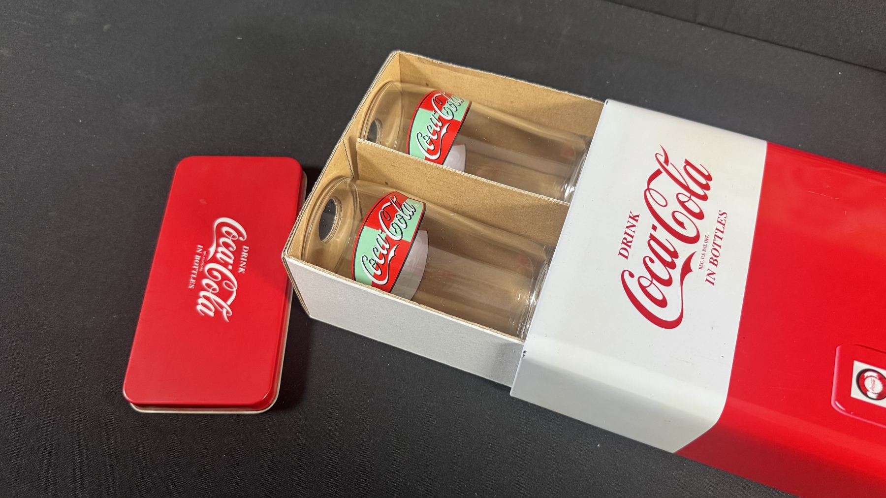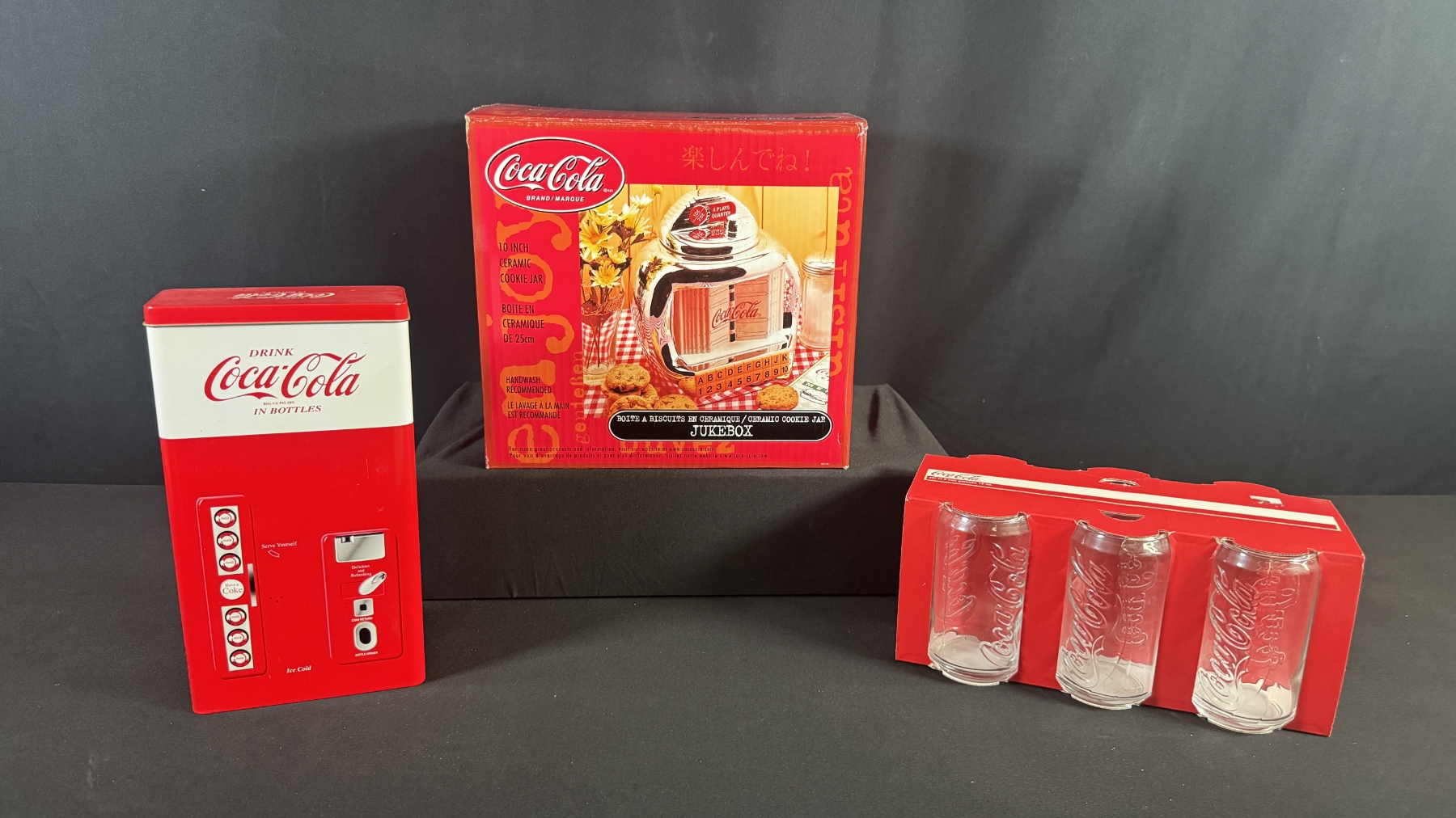 COCA-COLA JUKEBOX COOKIE JAR, CAN GLASSES & TIN GLASS SET
