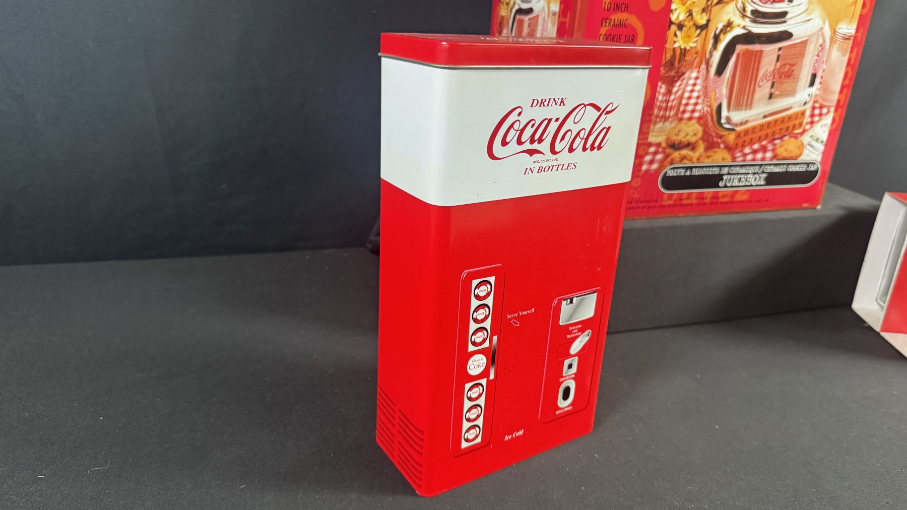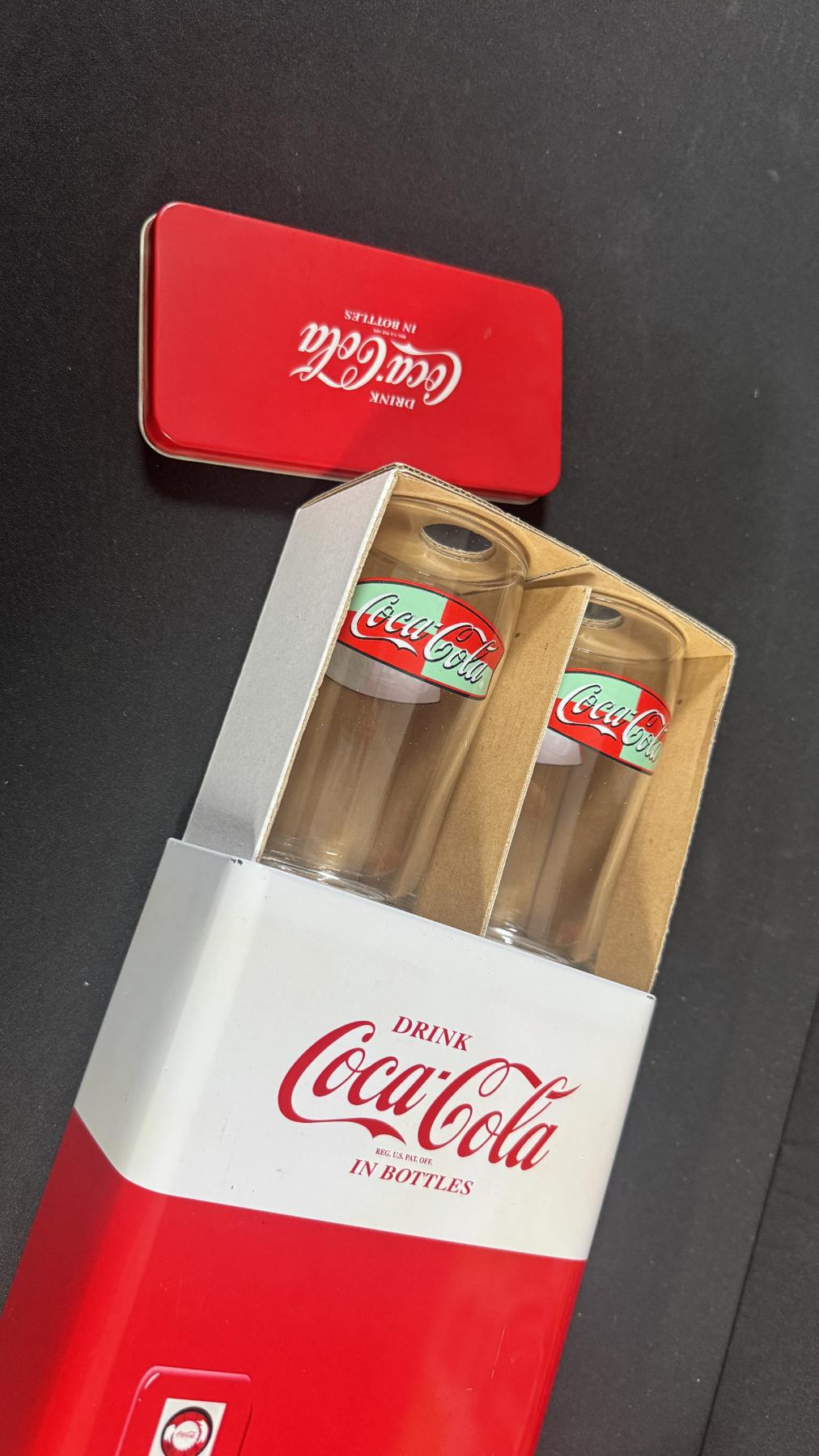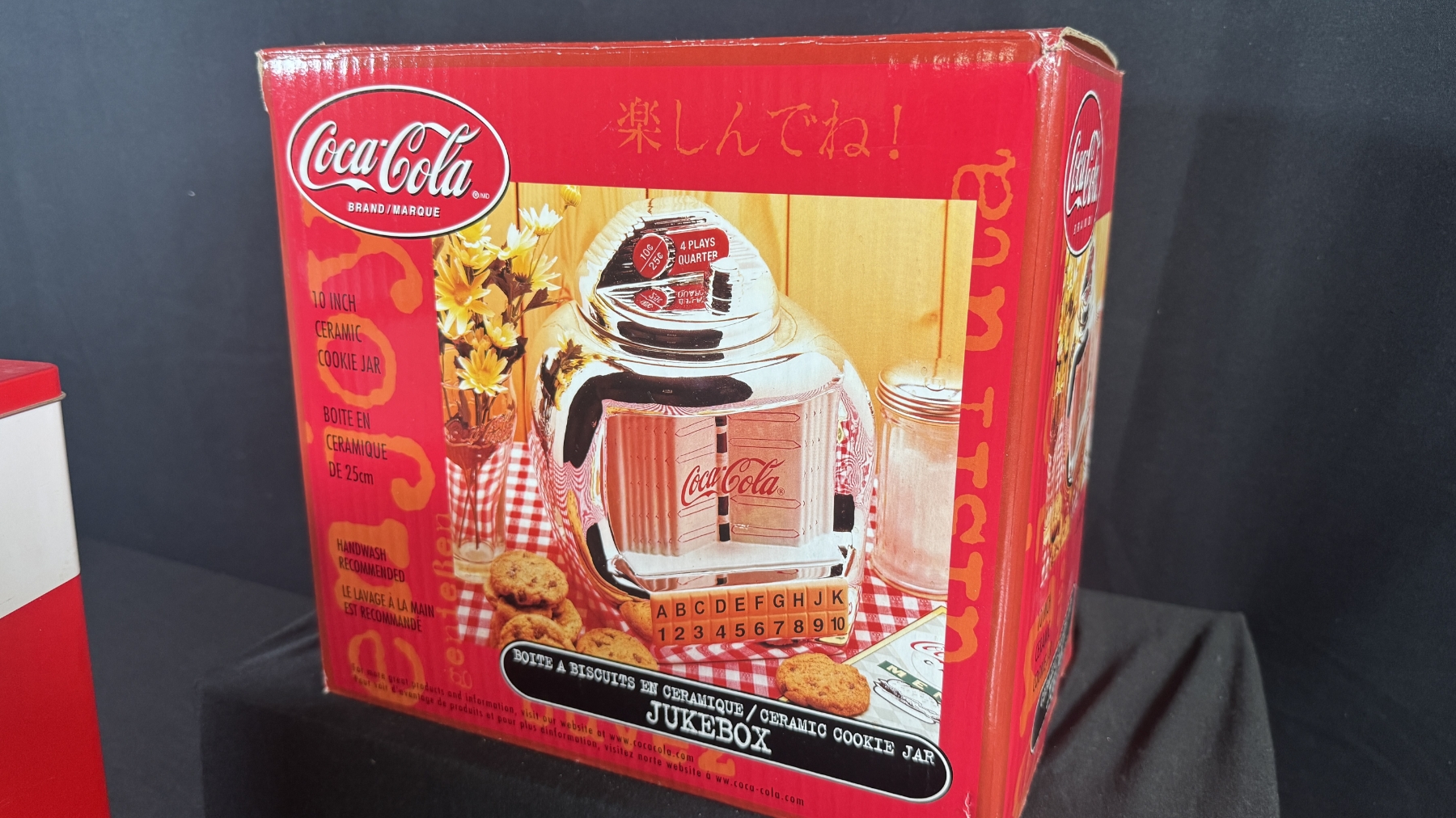 COCA-COLA JUKEBOX COOKIE JAR, CAN GLASSES & TIN GLASS SET